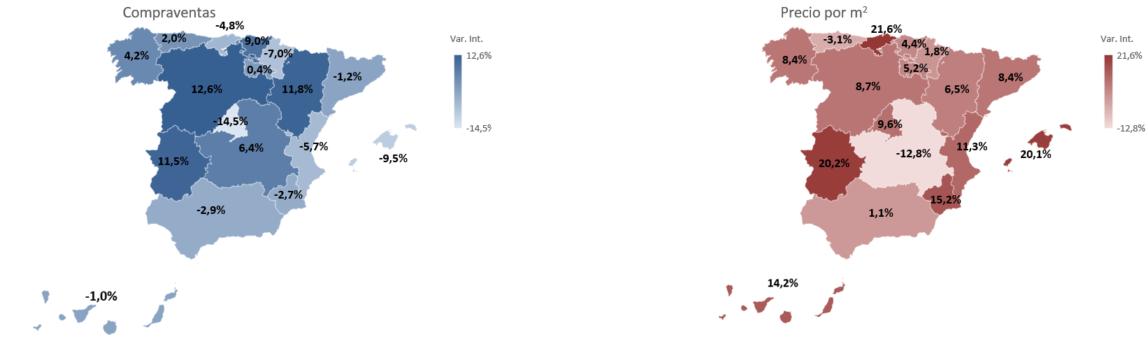When it comes to prices, fifteen regions saw increases. The biggest spikes appeared in Cantabria (+21.6%), Extremadura (+20.2%), and the Balearic Islands (+20.1%). Only Castilla-La Mancha (-12.8%) and Asturias (-3.1%) registered price declines.