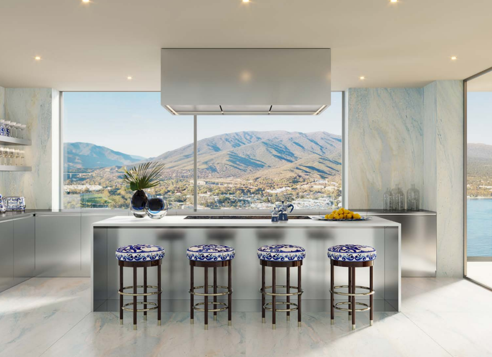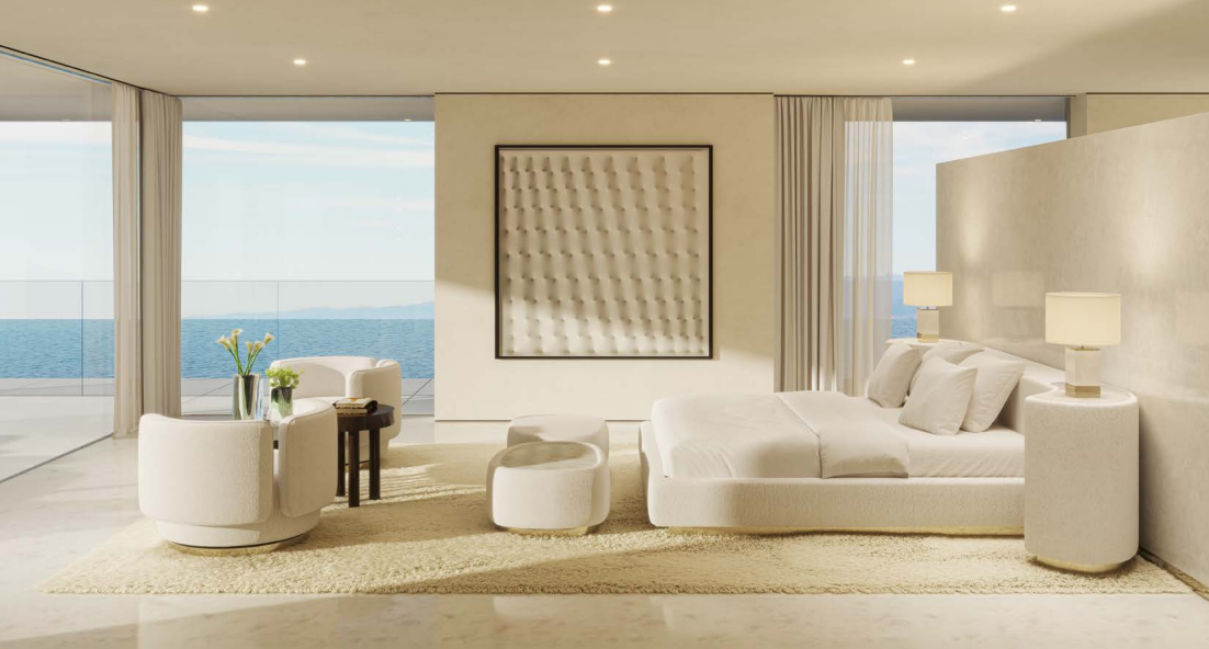 Homes are designed with generous proportions and open-plan layouts that flow naturally towards expansive terraces. Floor-to-ceiling glazing allows natural light to define the interiors and frames uninterrupted views of the sea and surrounding landscape. Kitchens and living areas are conceived as integrated spaces, combining functionality with refined detailing, while bedrooms offer privacy and calm, aligned with the overall residential philosophy.