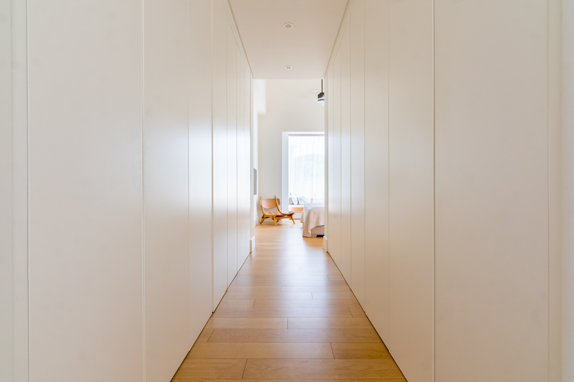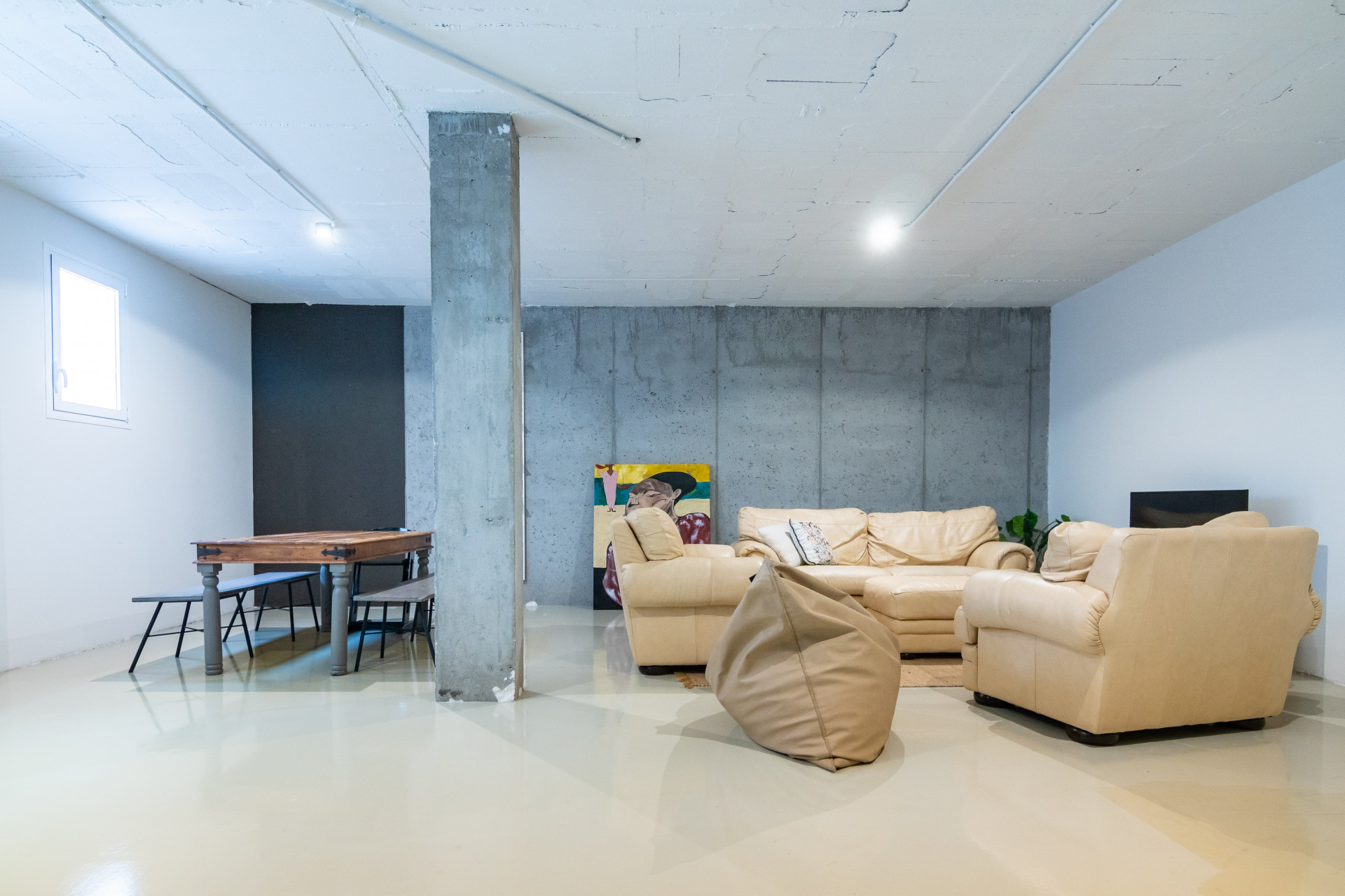The 170 m² basement, with 2.80 m ceilings and abundant natural light, houses a fourth suite equipped with a 180 × 200 cm Vispring bed and bunk beds, with capacity for up to five people. This level also offers a second lounge with leather sofas, an exercise or yoga area and the machine room.