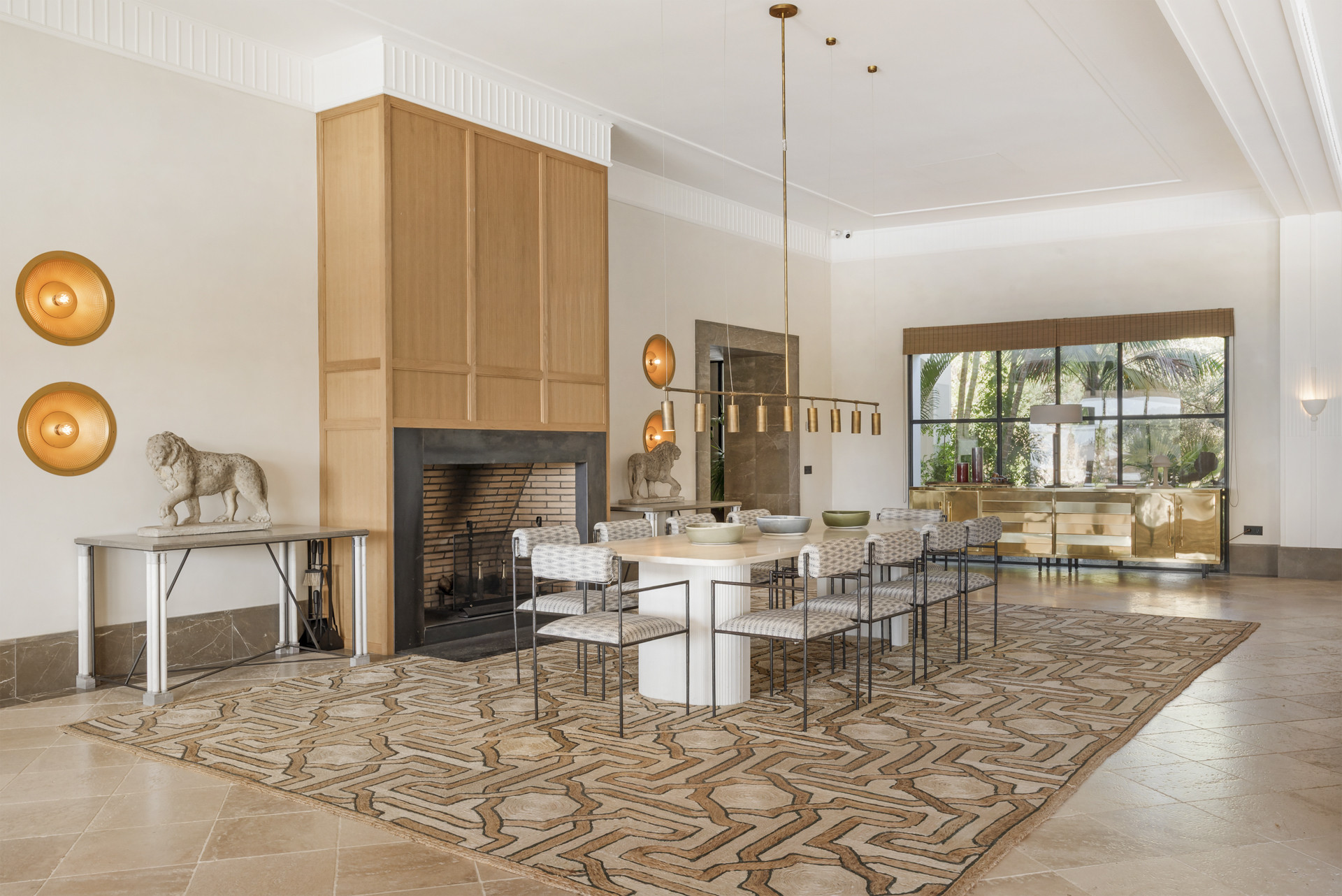 At the heart of the home lies the Grand Salon, designed for both grand entertaining and intimate gatherings. The dining area, framed by two open fireplaces, connects seamlessly to a butler’s pantry, a main kitchen, and a chef’s kitchen fitted with vintage Lacanche gas stoves, a dream for culinary aficionados.