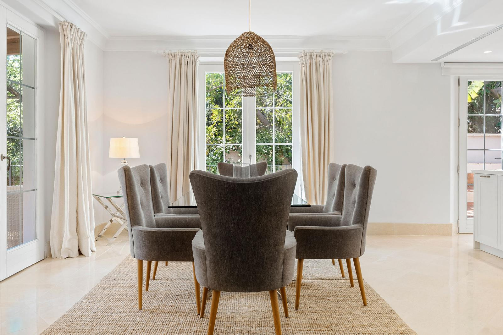 The adjoining dining area evokes lively meals with friends and family, where laughter fills the air and the soft glow of sunset enhances that unmistakable feeling of home.
