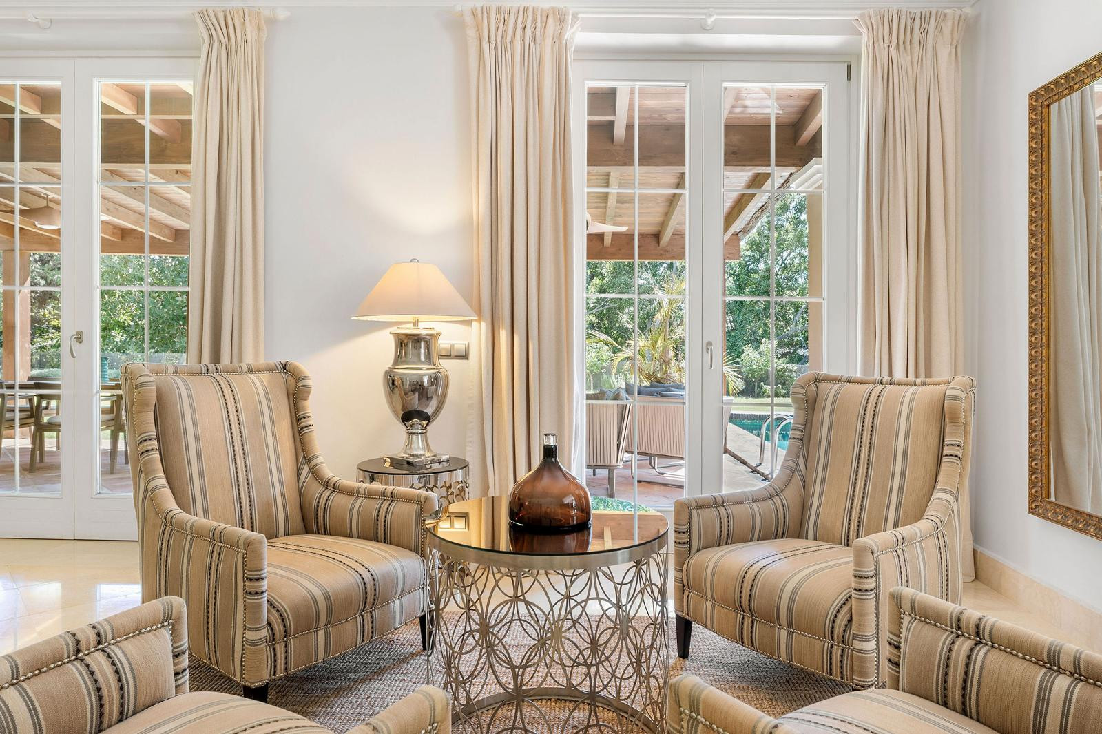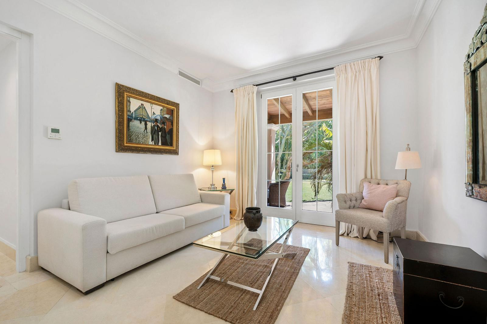 The spacious and inviting living room opens directly onto a covered terrace, creating a seamless connection with the outdoors and allowing natural light and gentle breezes to become part of everyday life.