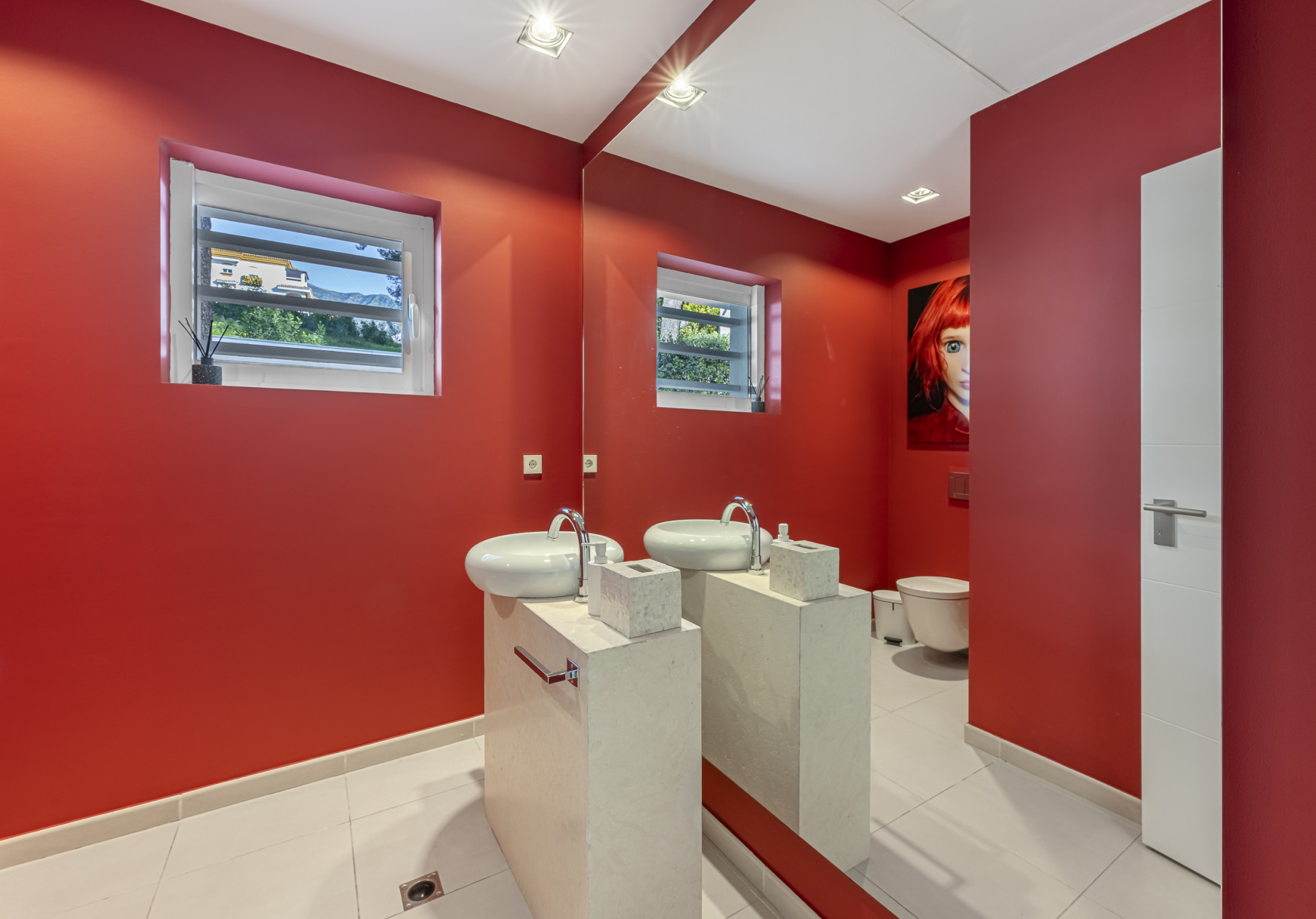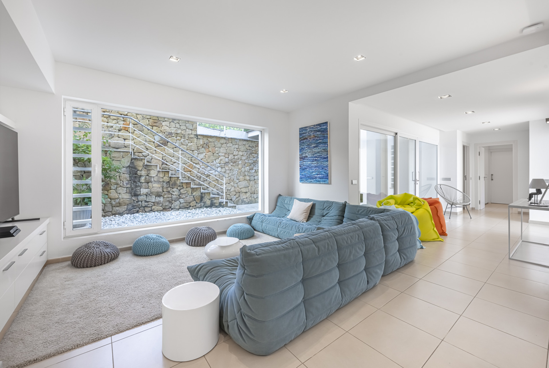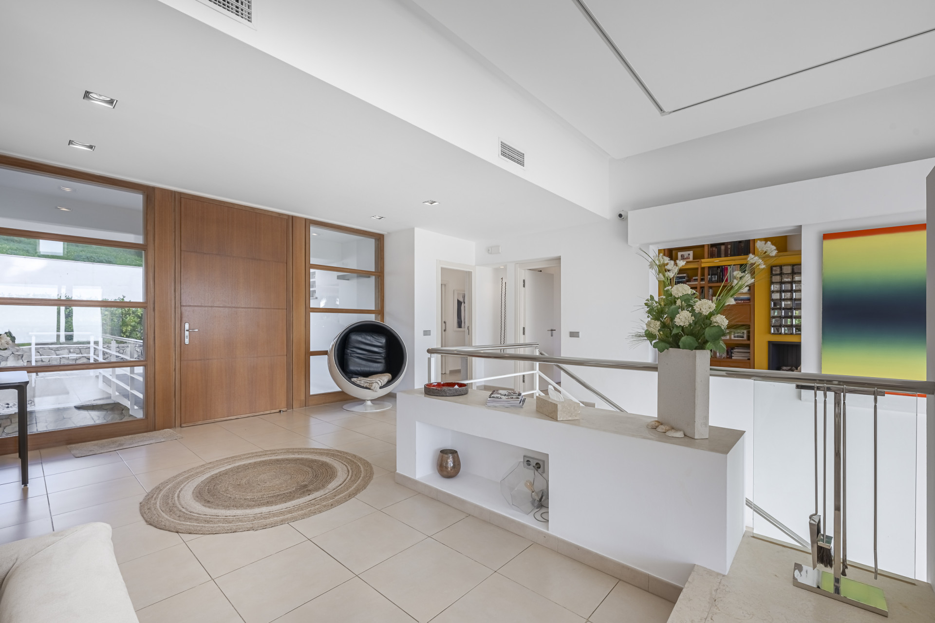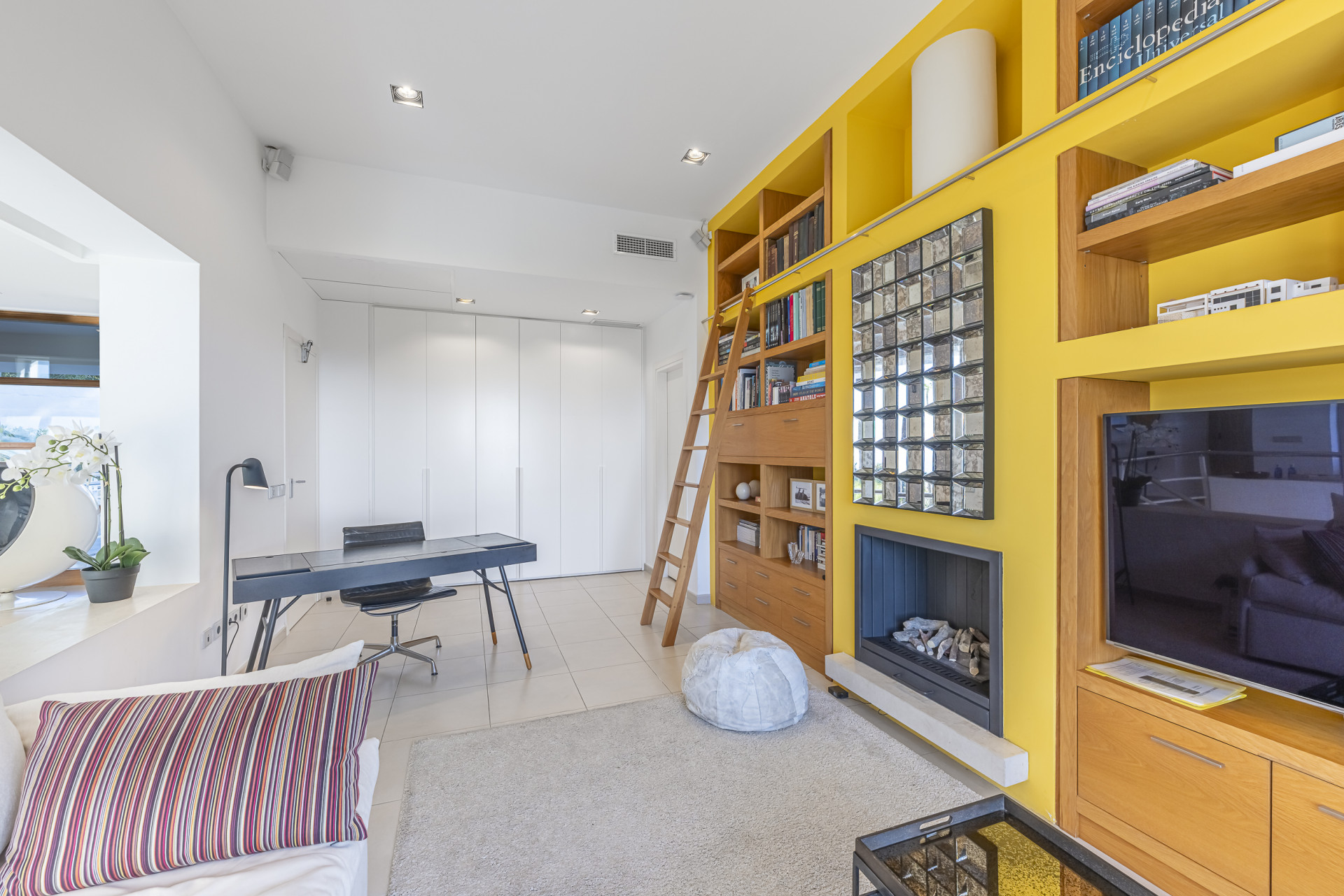 The sleeping quarters have been conceived as a true luxury retreat. The master suite, enjoying privileged sea views, offers an exclusive and tranquil atmosphere. In addition, there are five spacious guest bedrooms, all with en-suite bathrooms, ensuring maximum comfort and privacy for family and guests alike. The home is further complemented by a cosy television lounge with fireplace, an elegant library, and a separate office ideal for those wishing to combine leisure with remote work.