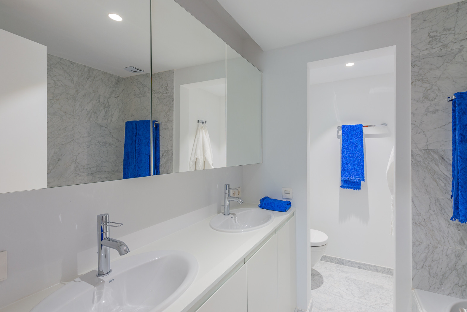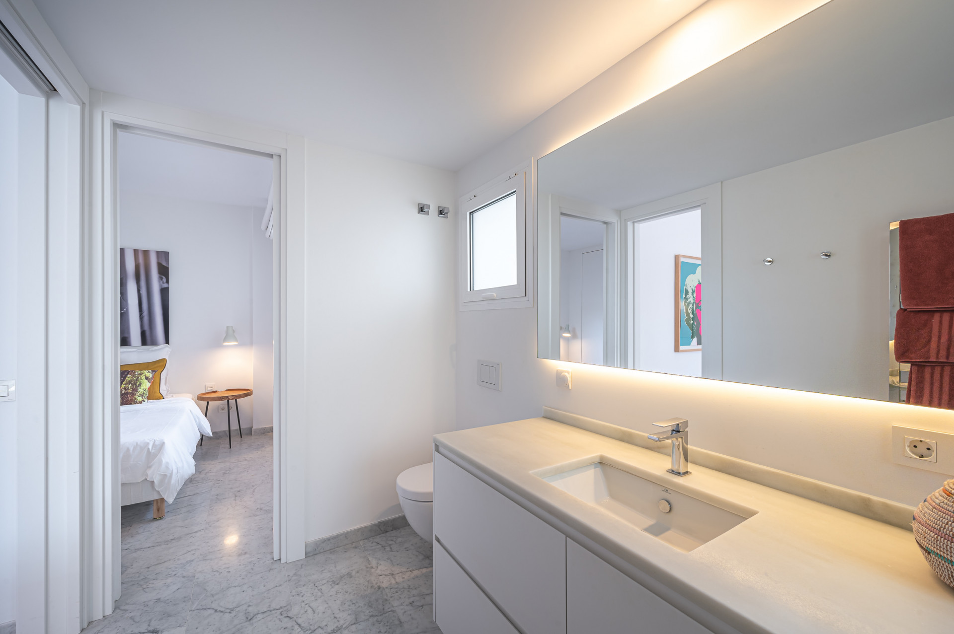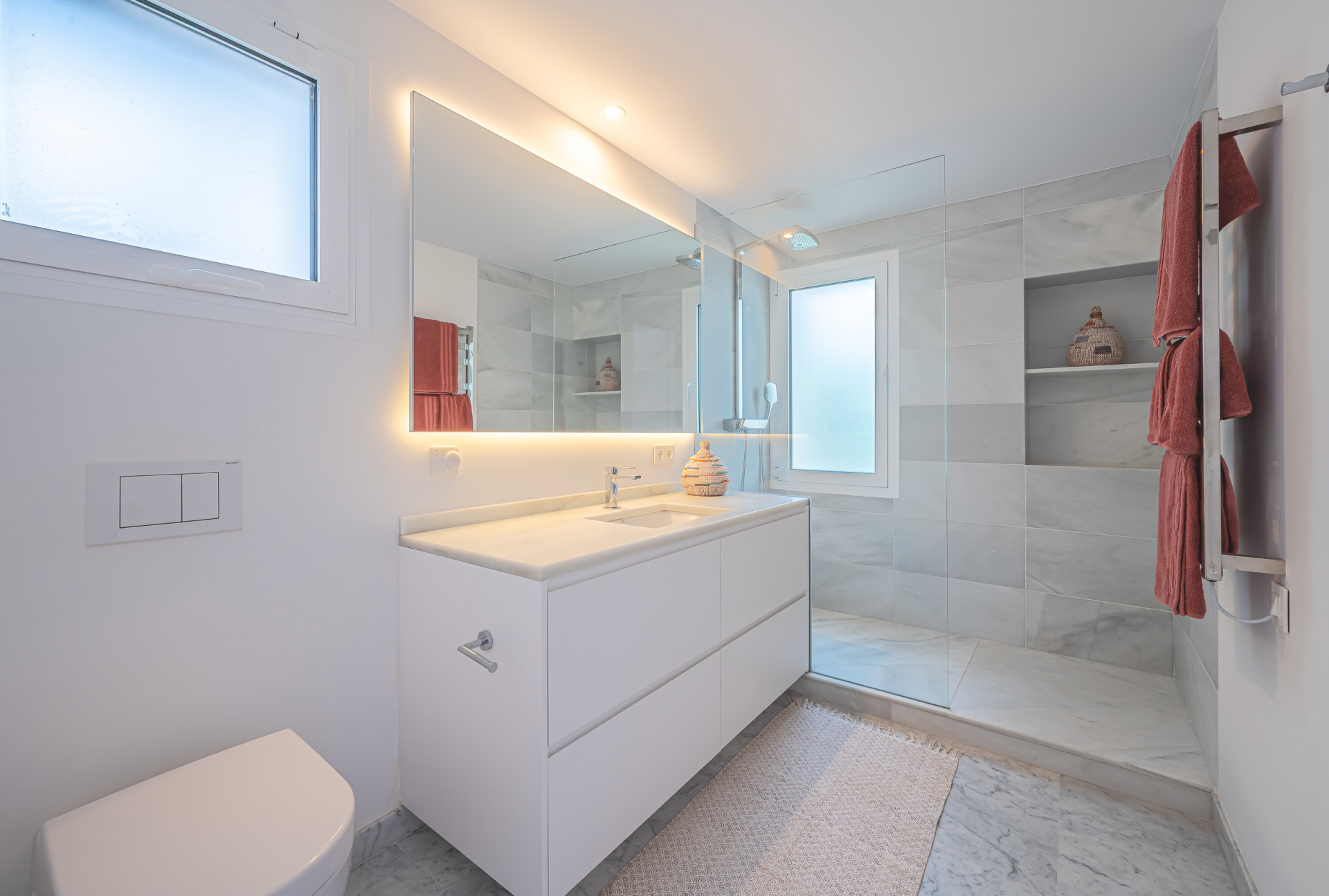 The elegant and bright master bedroom boasts an en-suite bathroom with a walk-in shower and direct access to the terrace. The layout is completed by a guest toilet and two additional bedrooms sharing a modern bathroom with a shower.