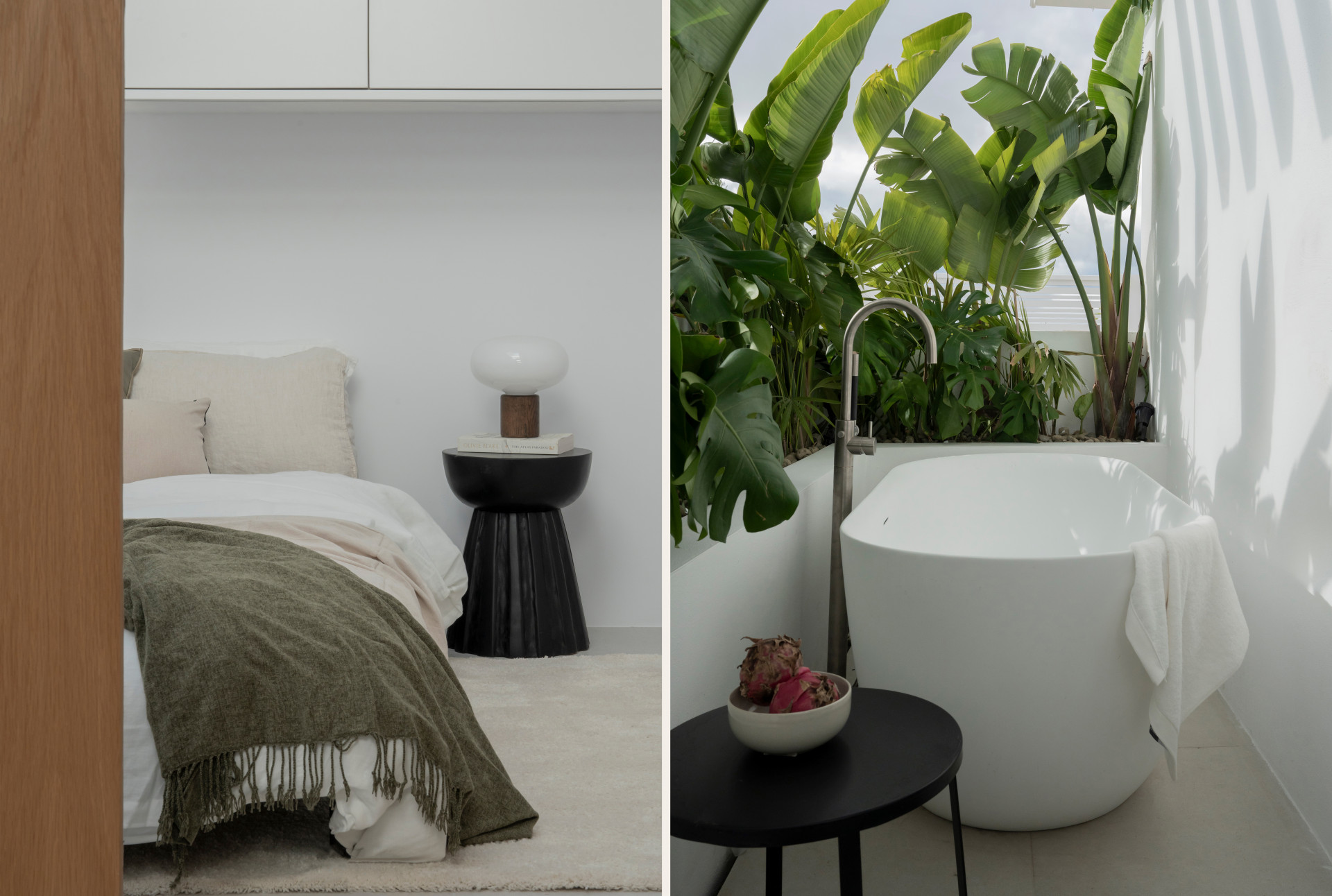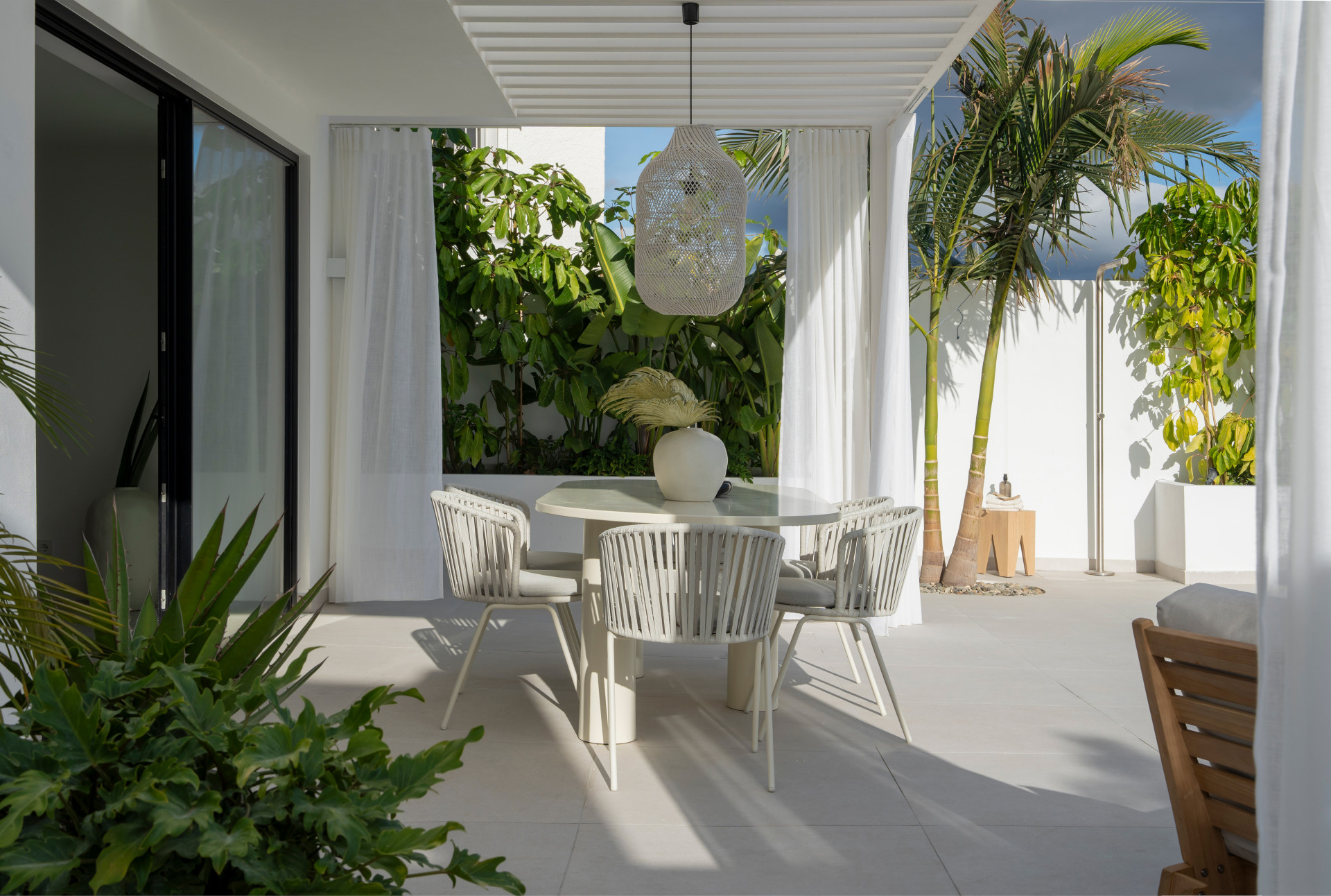 A charming courtyard sets the stage on arrival, leading to both the main villa and a private guesthouse, complete with its own terrace and outdoor shower. It’s a space that seamlessly balances shared living with secluded comfort. Inside the main villa, a generous foyer introduces the home, opening to a refined master suite, an elegant guest suite, and a stylish powder room on the entry level.