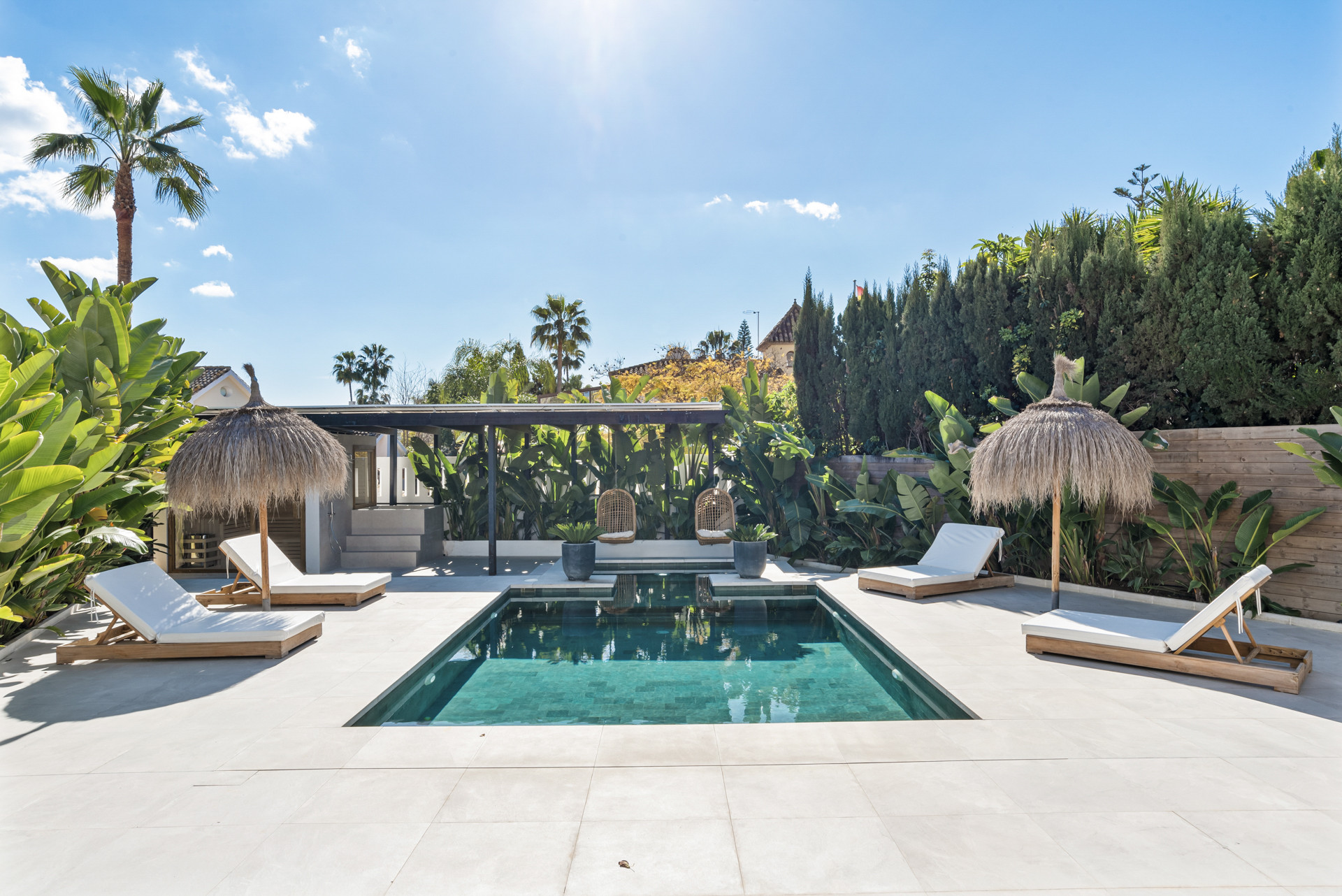 The garden ensures complete privacy and provides an atmosphere of peace and serenity. The easily accessible pool is perfect for both children and adults. The villa also includes a private sauna, ice bath, and an in-house gym, offering a truly luxurious living experience.