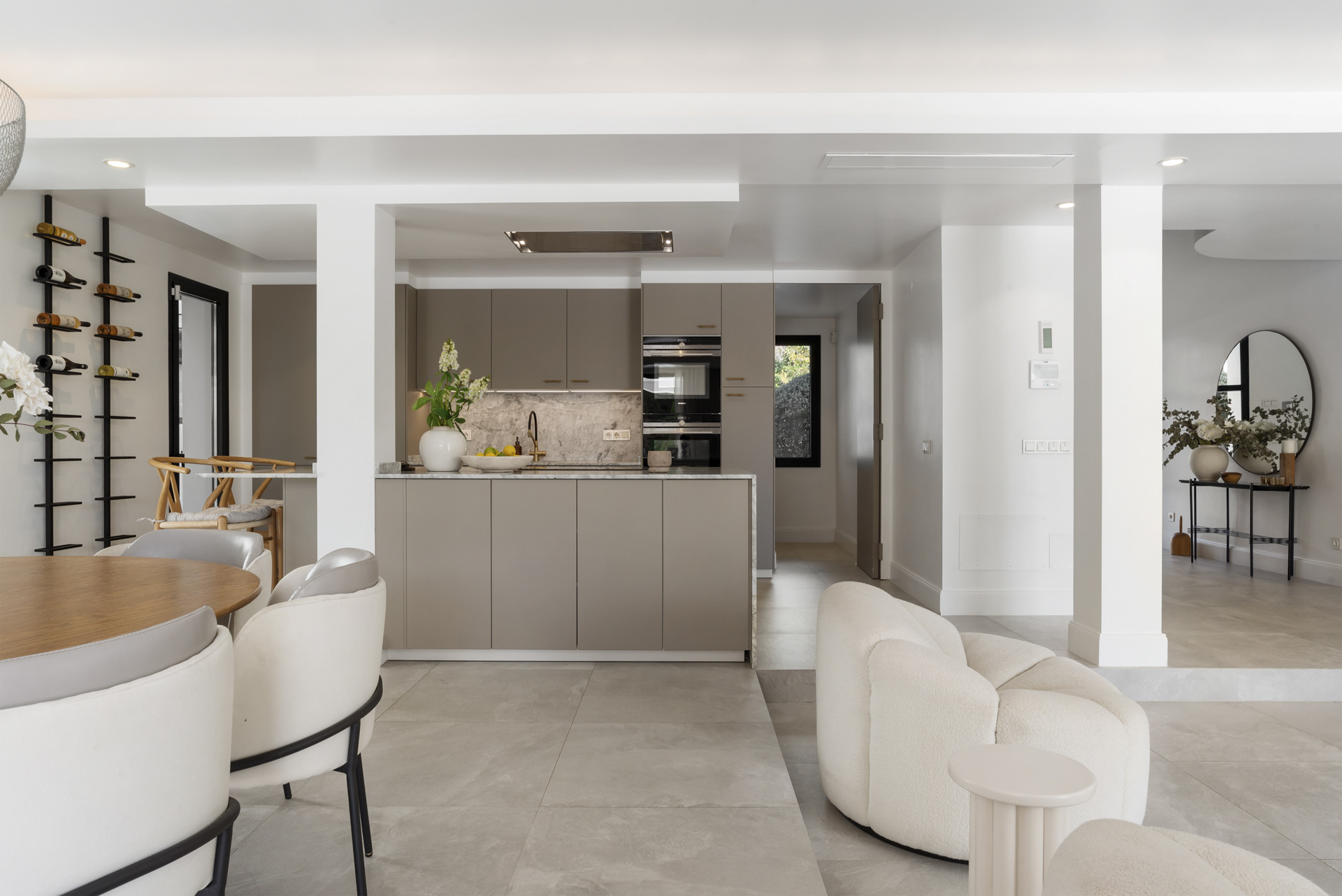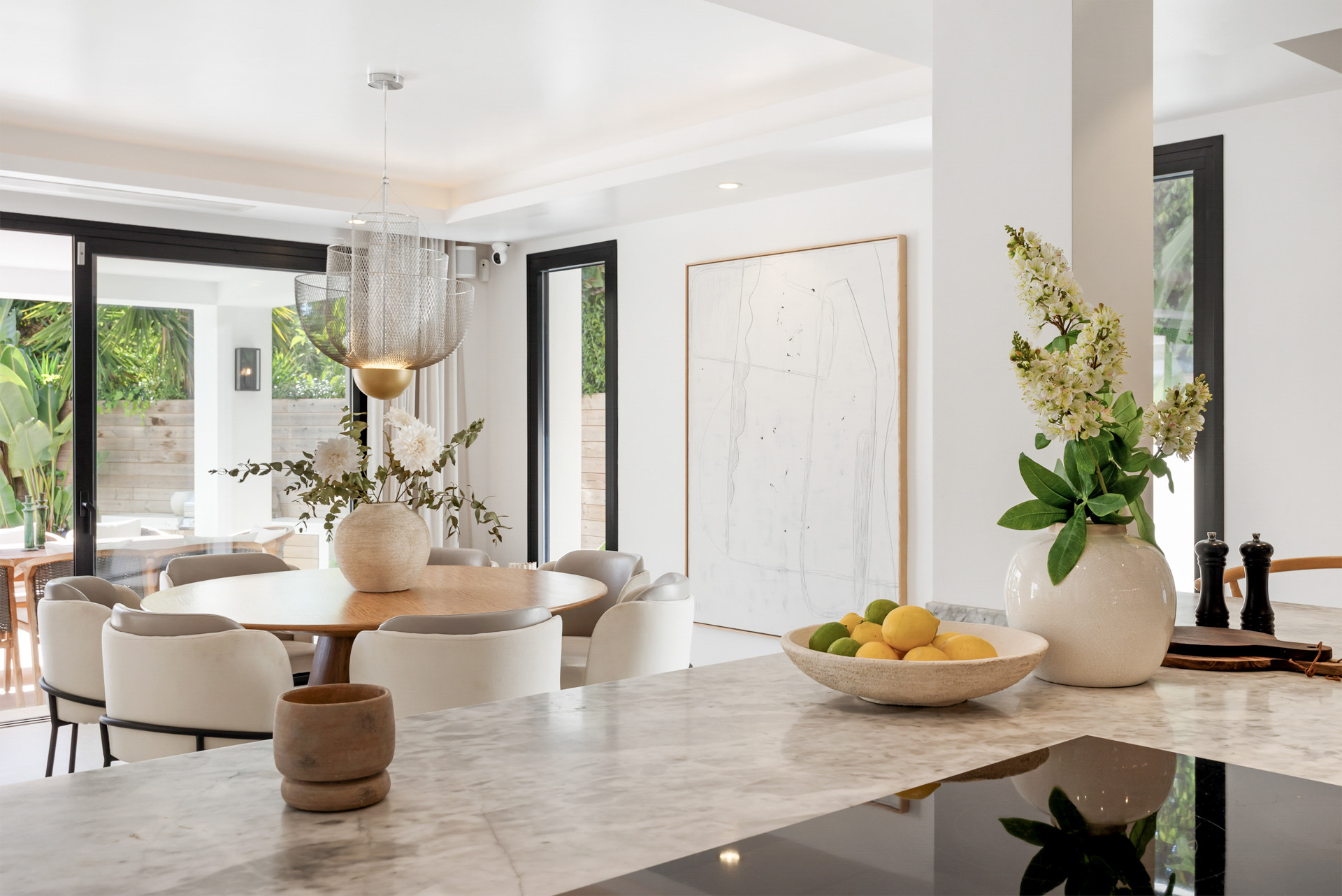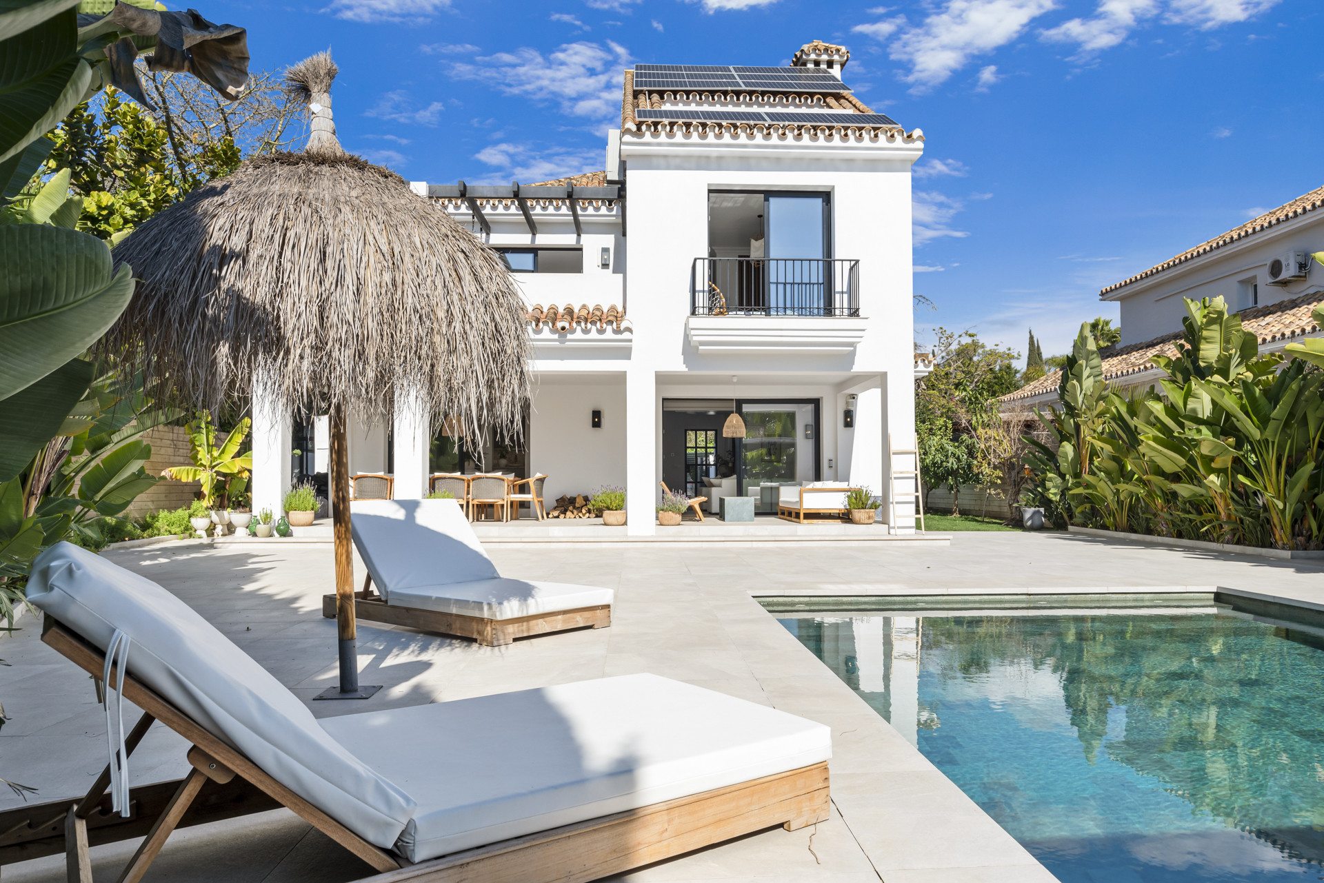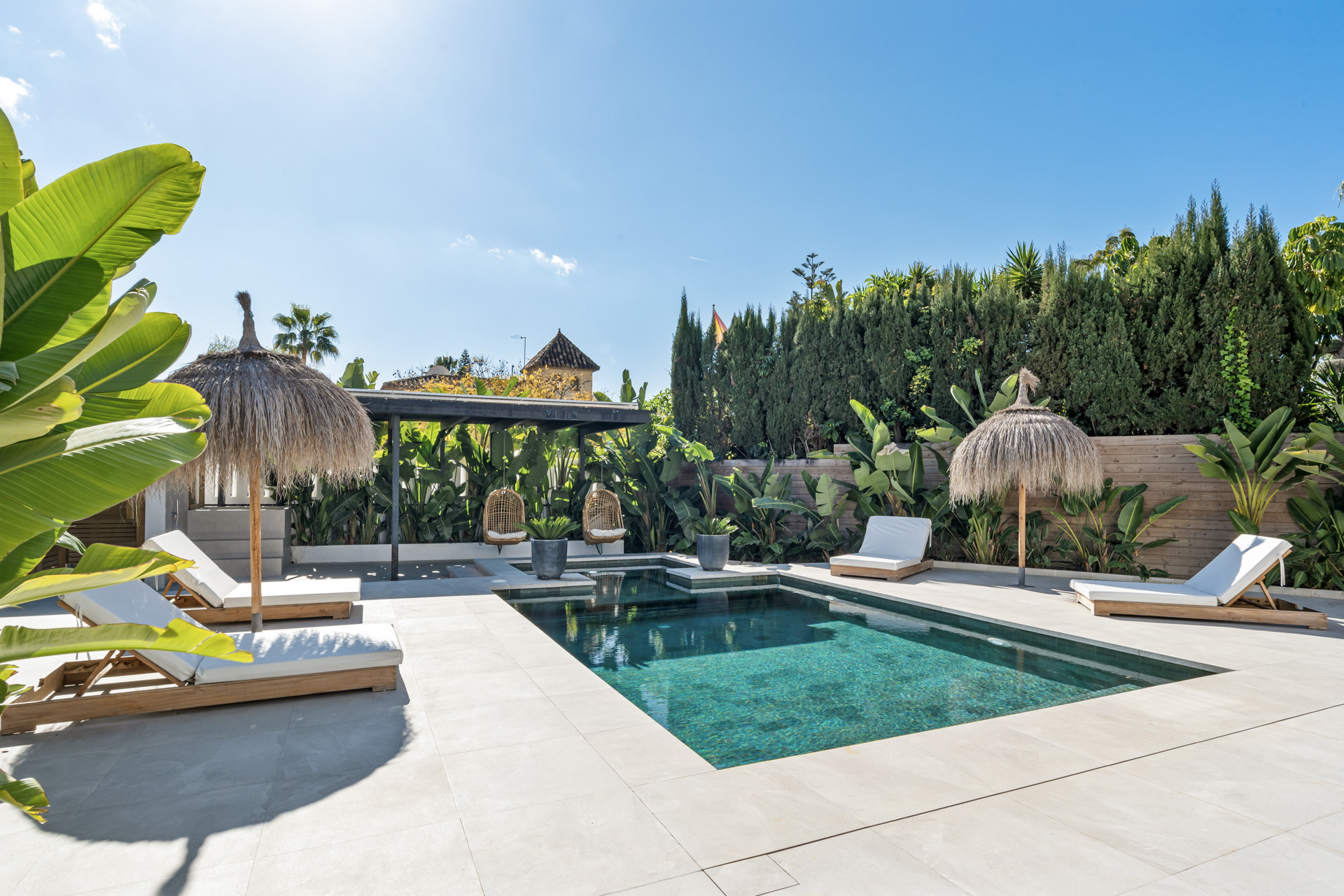 This stunning villa features six elegant bedrooms, four stylish bathrooms, and an open, light-filled kitchen seamlessly connected to the spacious living and dining areas. From these social spaces, you have direct access to the beautiful terrace, lush garden, and inviting swimming pool.