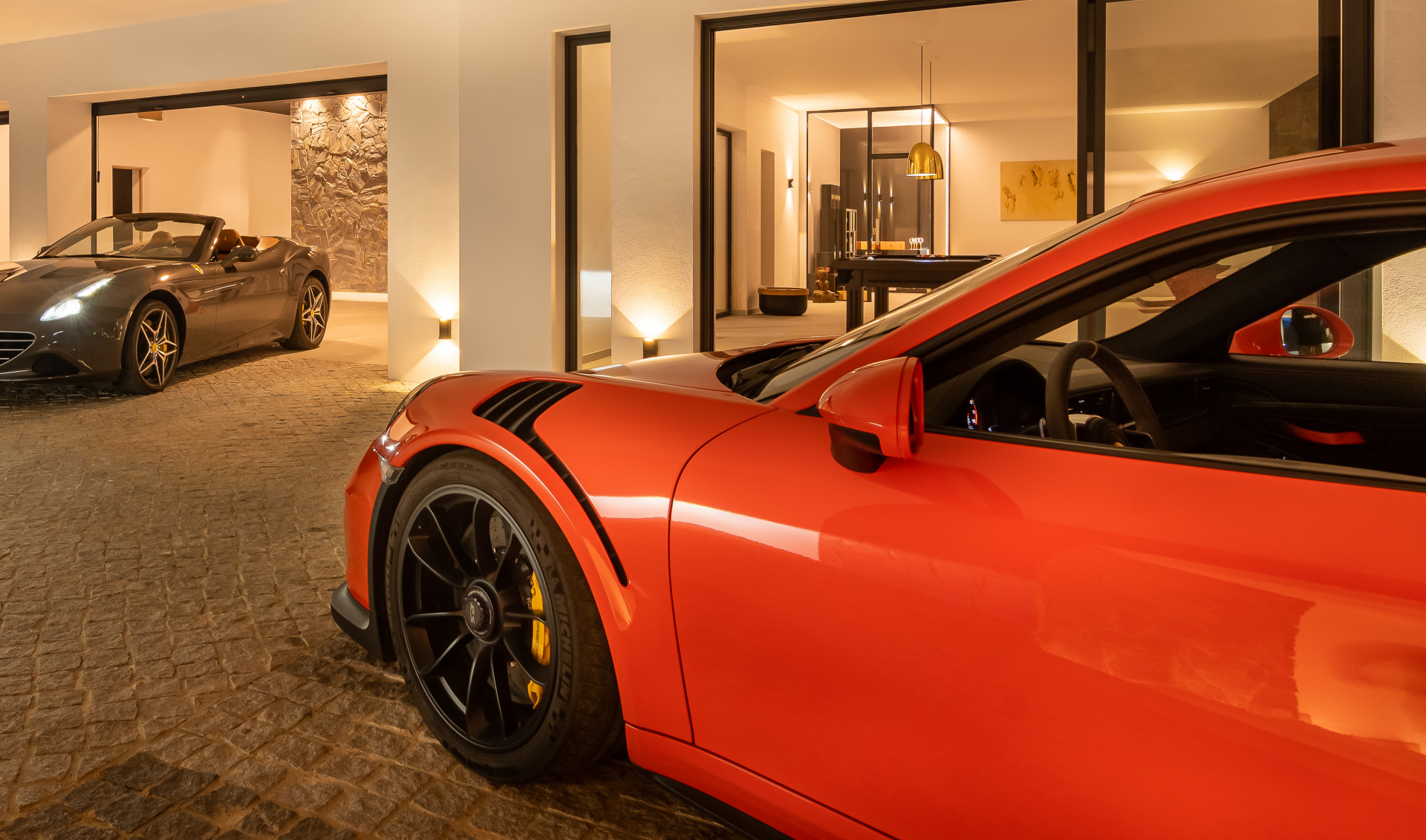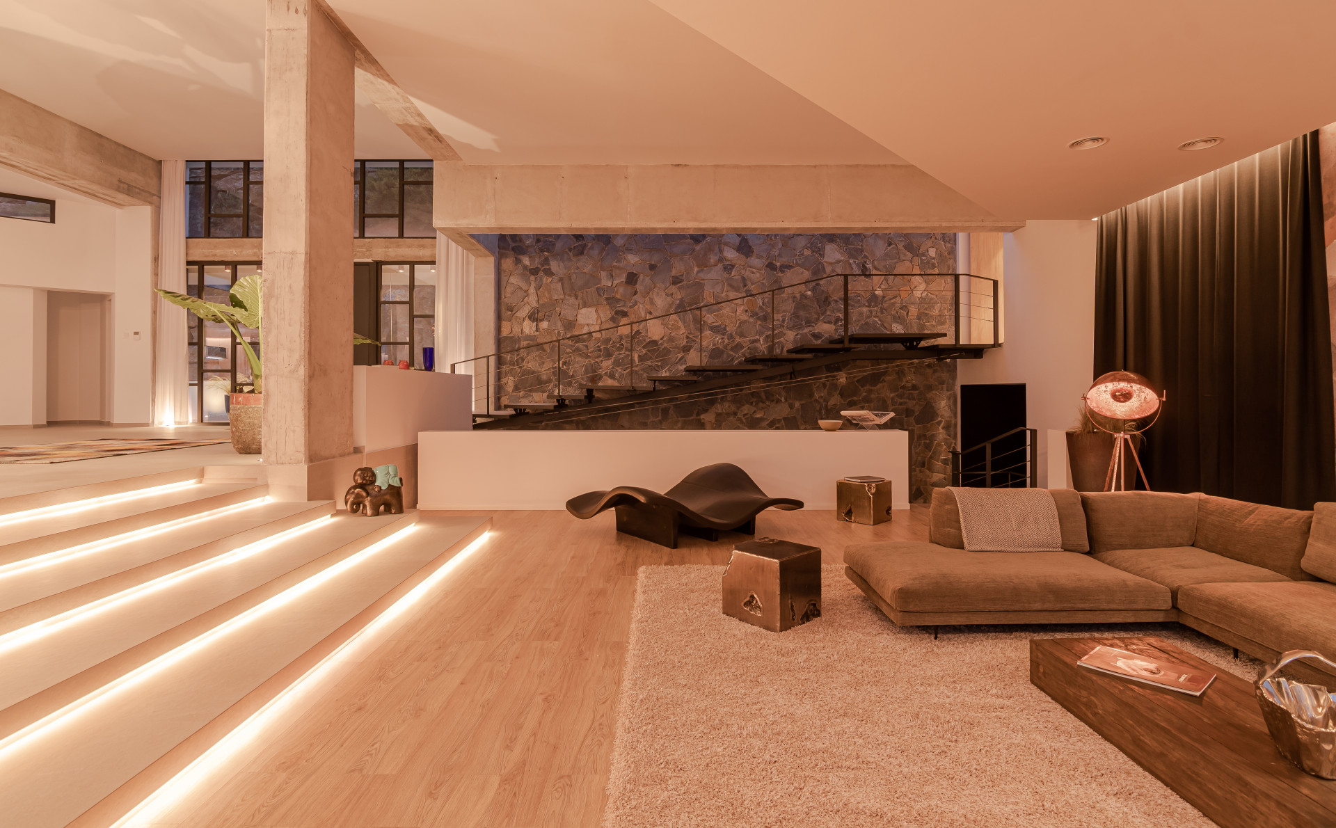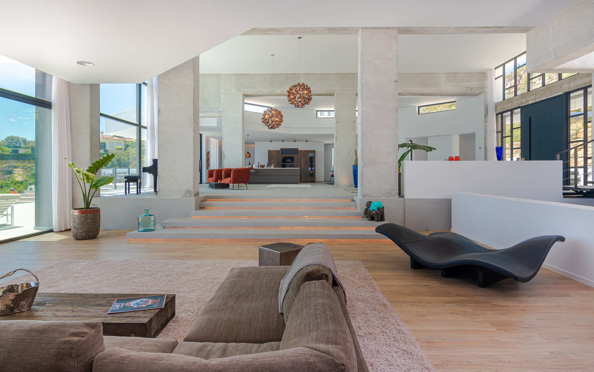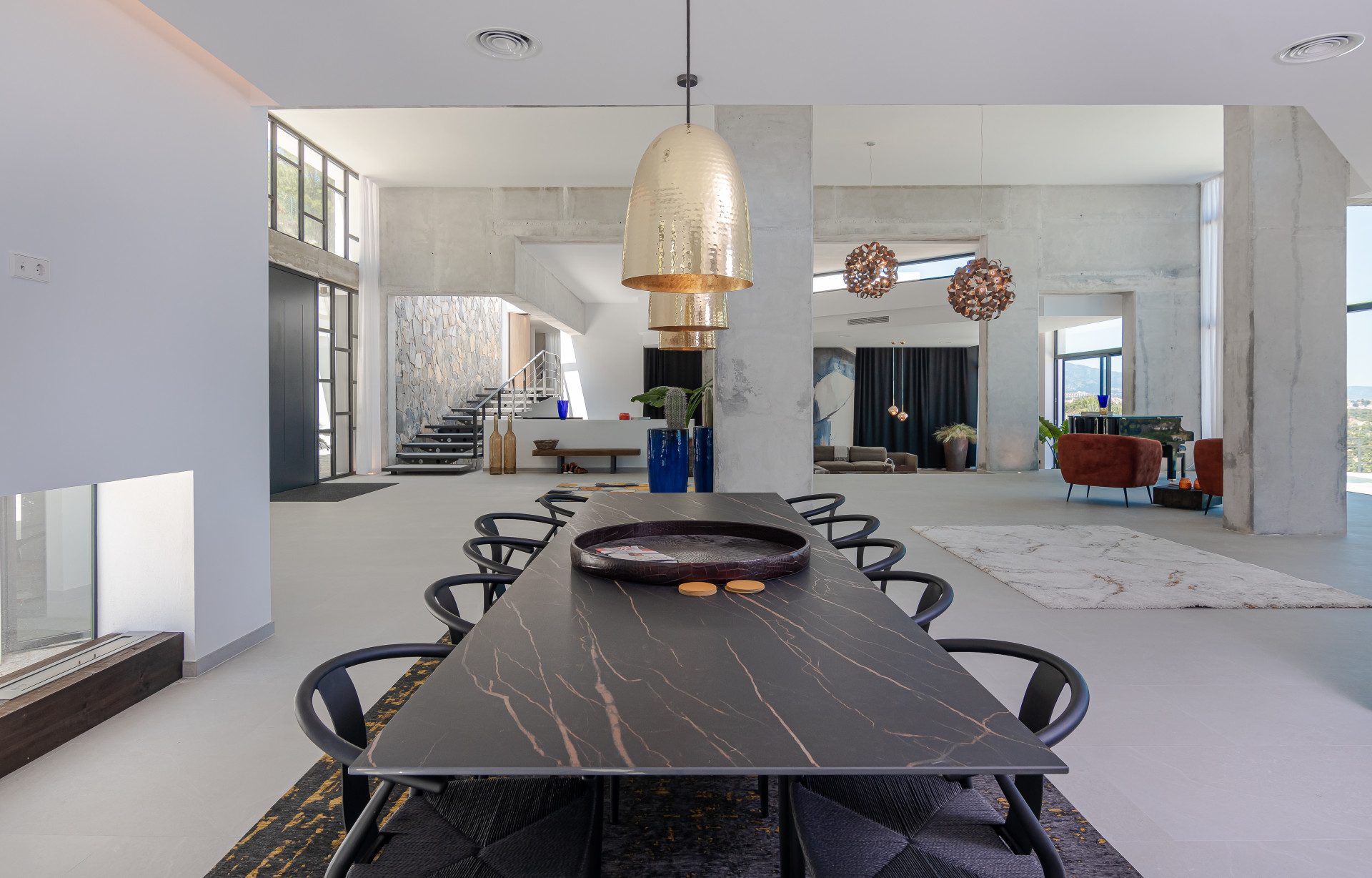 The villa welcomes you with a grand 300 m² entrance hall featuring soaring 6-meter ceilings and sophisticated décor. The open-plan design seamlessly connects the living and dining areas to expansive terraces, offering the perfect setting for relaxation and entertainment. The state-of-the-art designer kitchen is equipped with premium Wolf and Subzero appliances and is complemented by two dining spaces, one beside the cozy fireplace and the other showcasing stunning panoramic views.