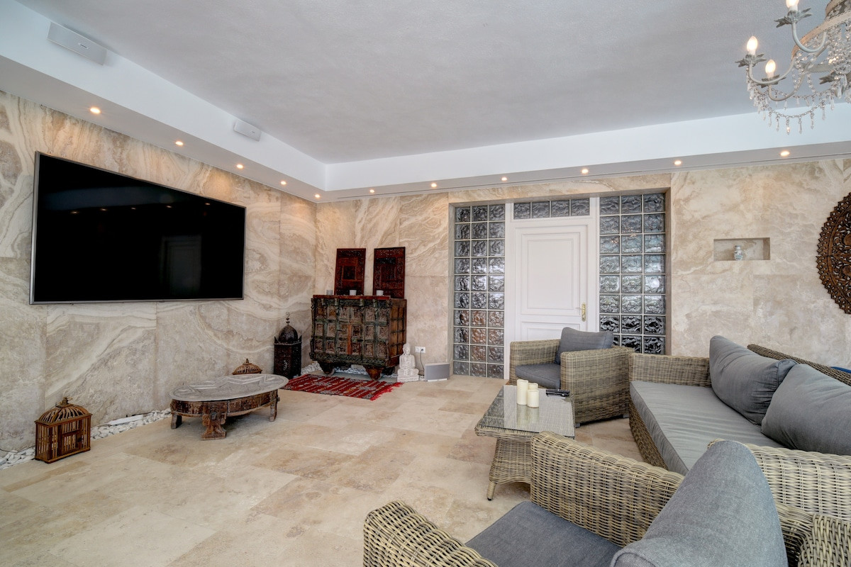 The mansion stands in a privileged location, surrounded by mountain landscapes and golf course views, creating an atmosphere of tranquility and exclusivity. The 120 m² terrace is perfect for enjoying warm Mediterranean evenings, while the private garden and heated pool offer a relaxing oasis. Capacity for five vehicles ensures comfort and security for residents and their guests.
