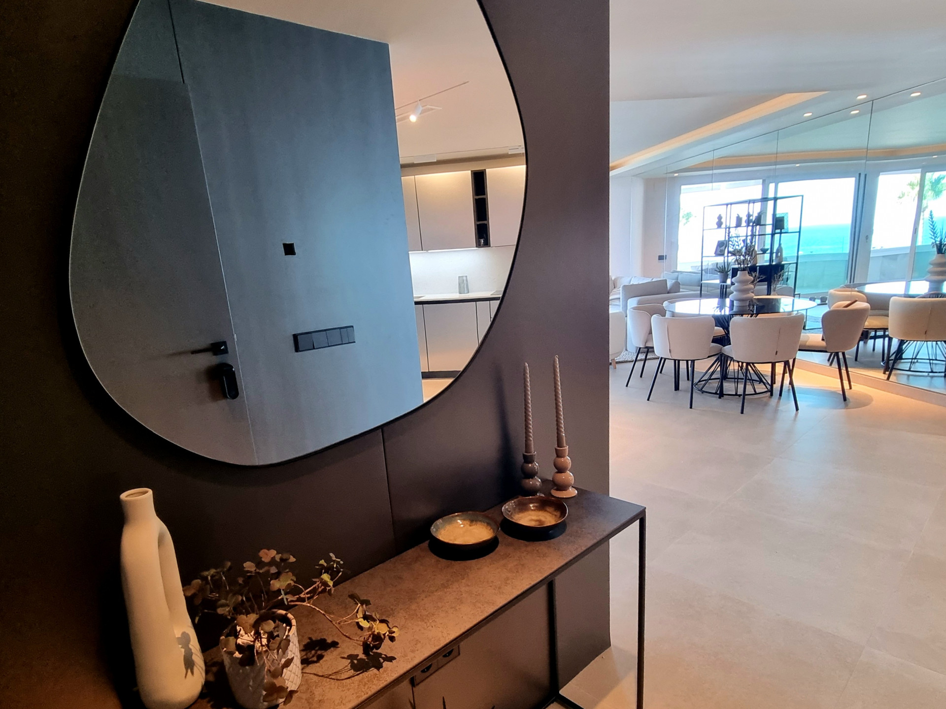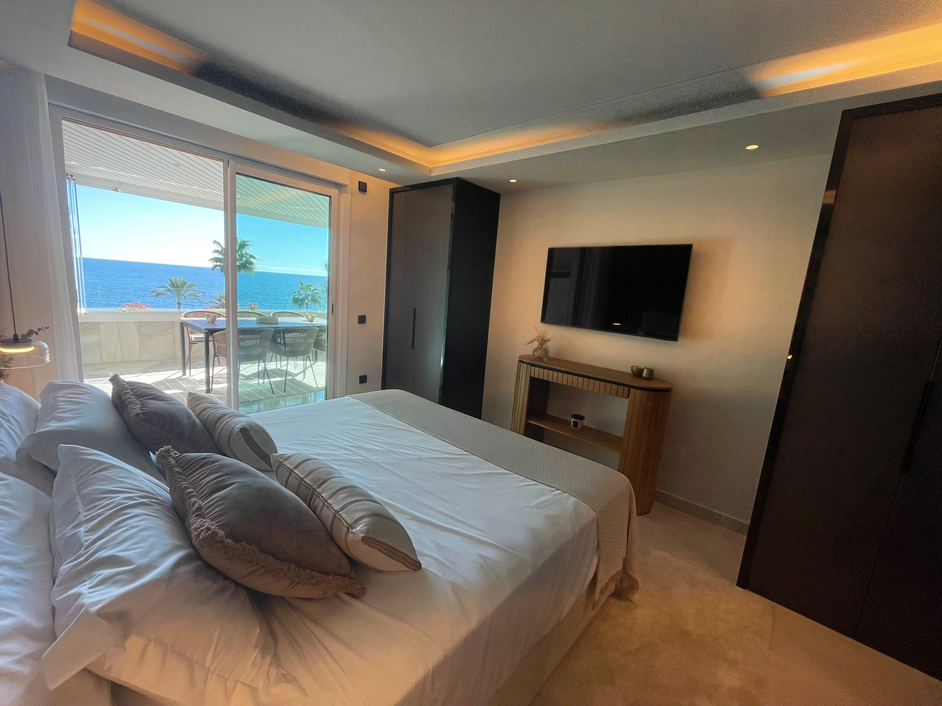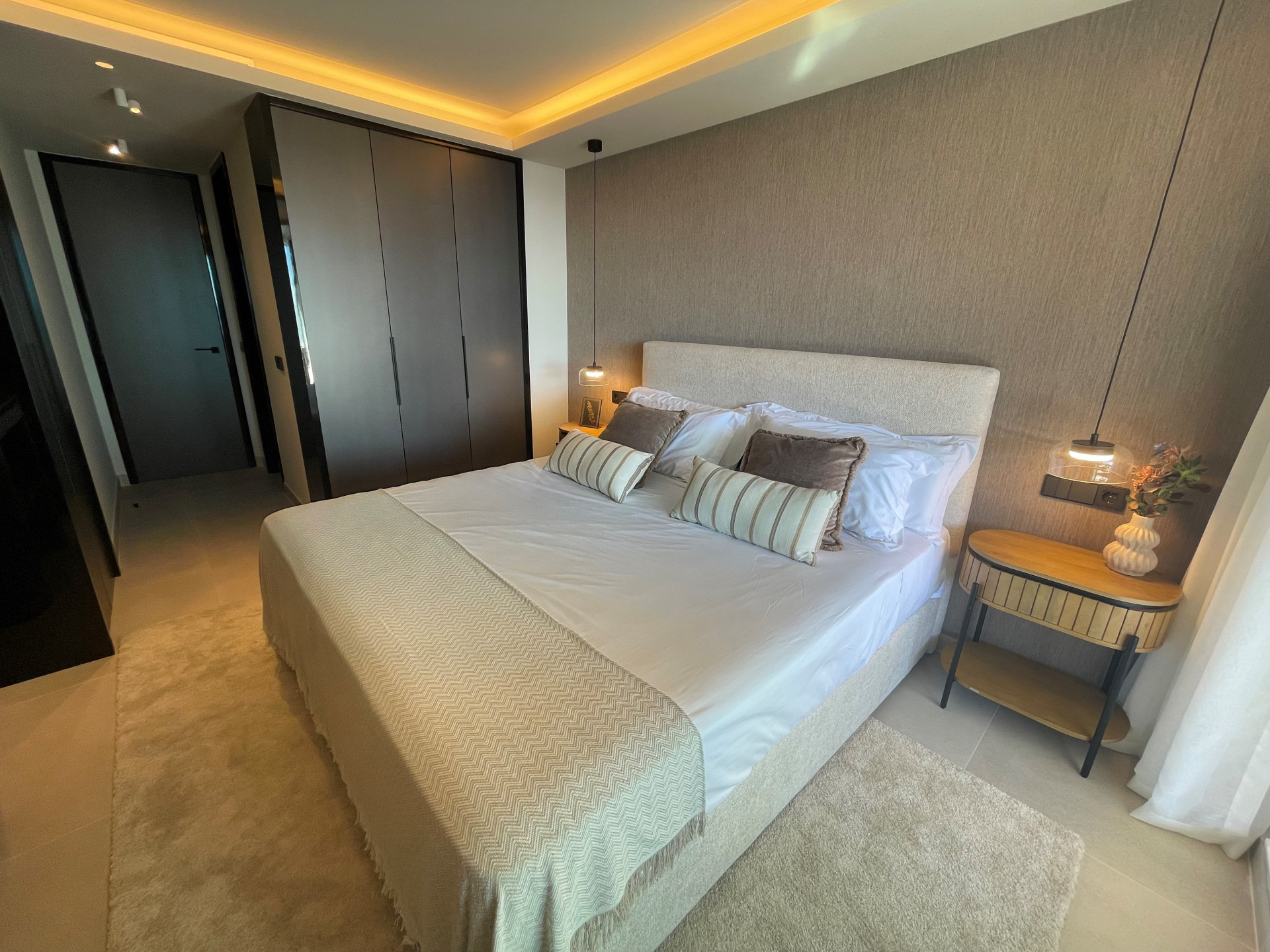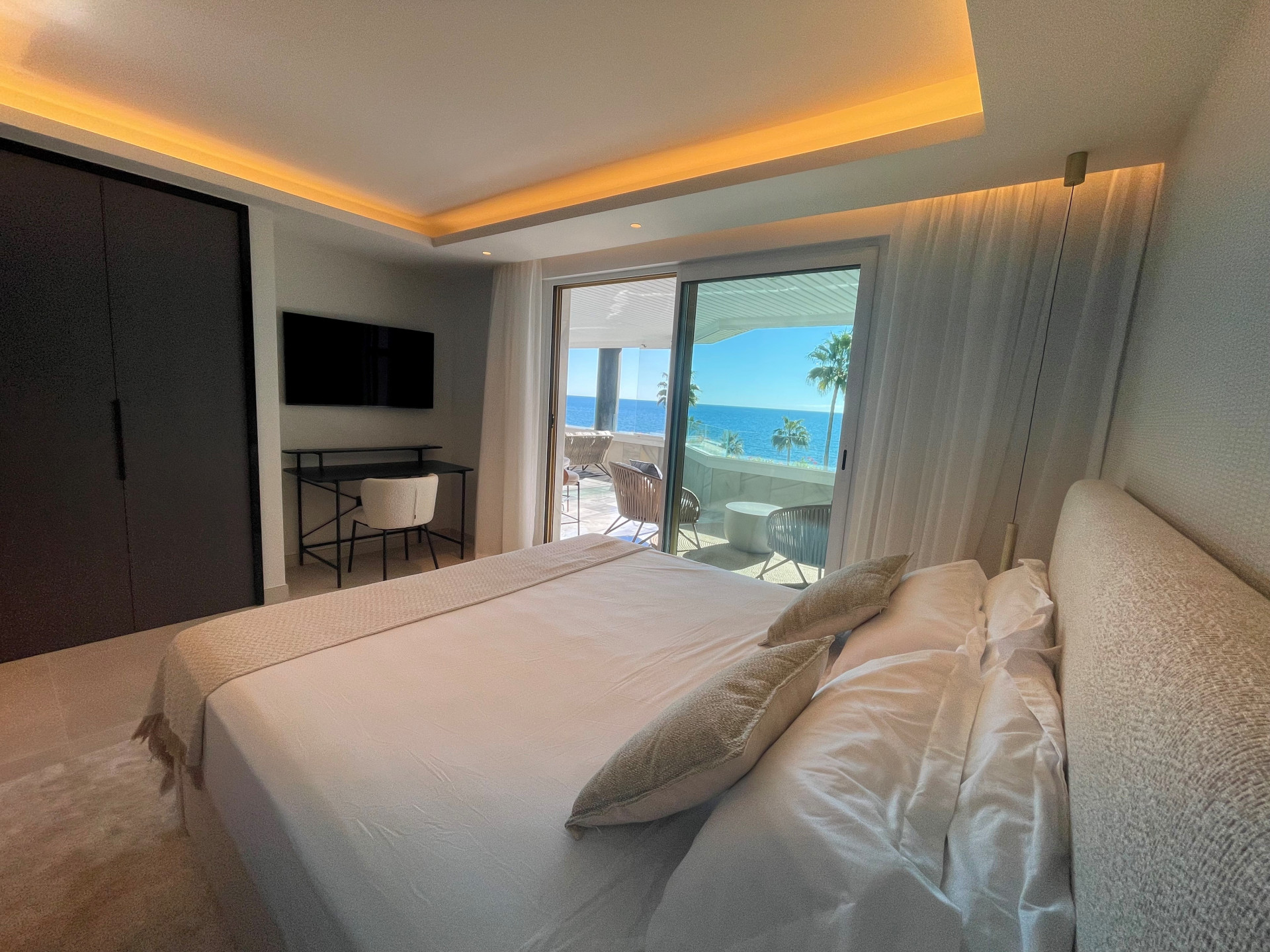 This elegant three-bedroom apartment combines contemporary luxury with coastal serenity.