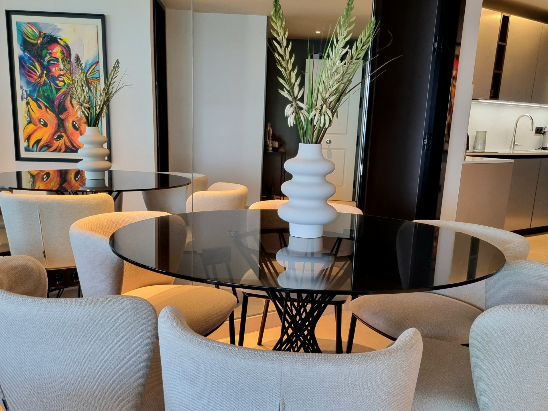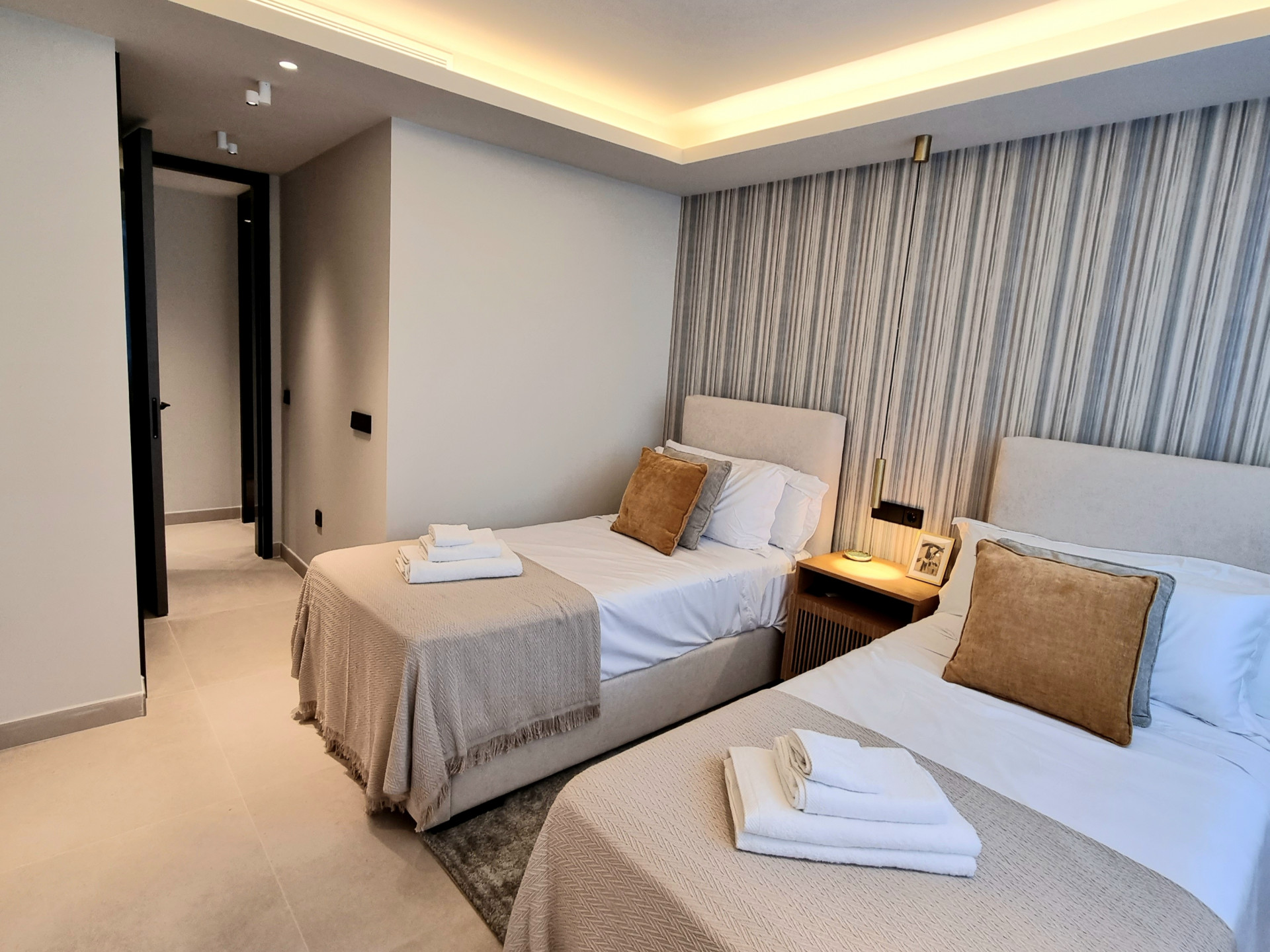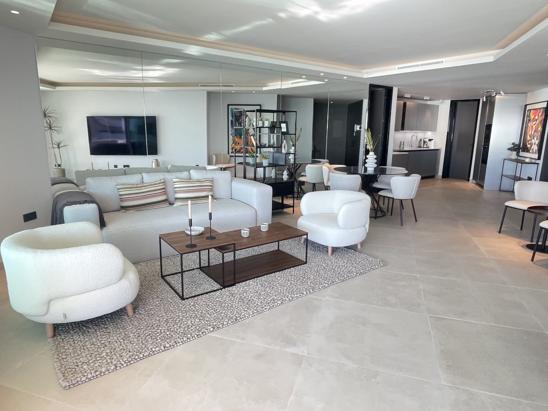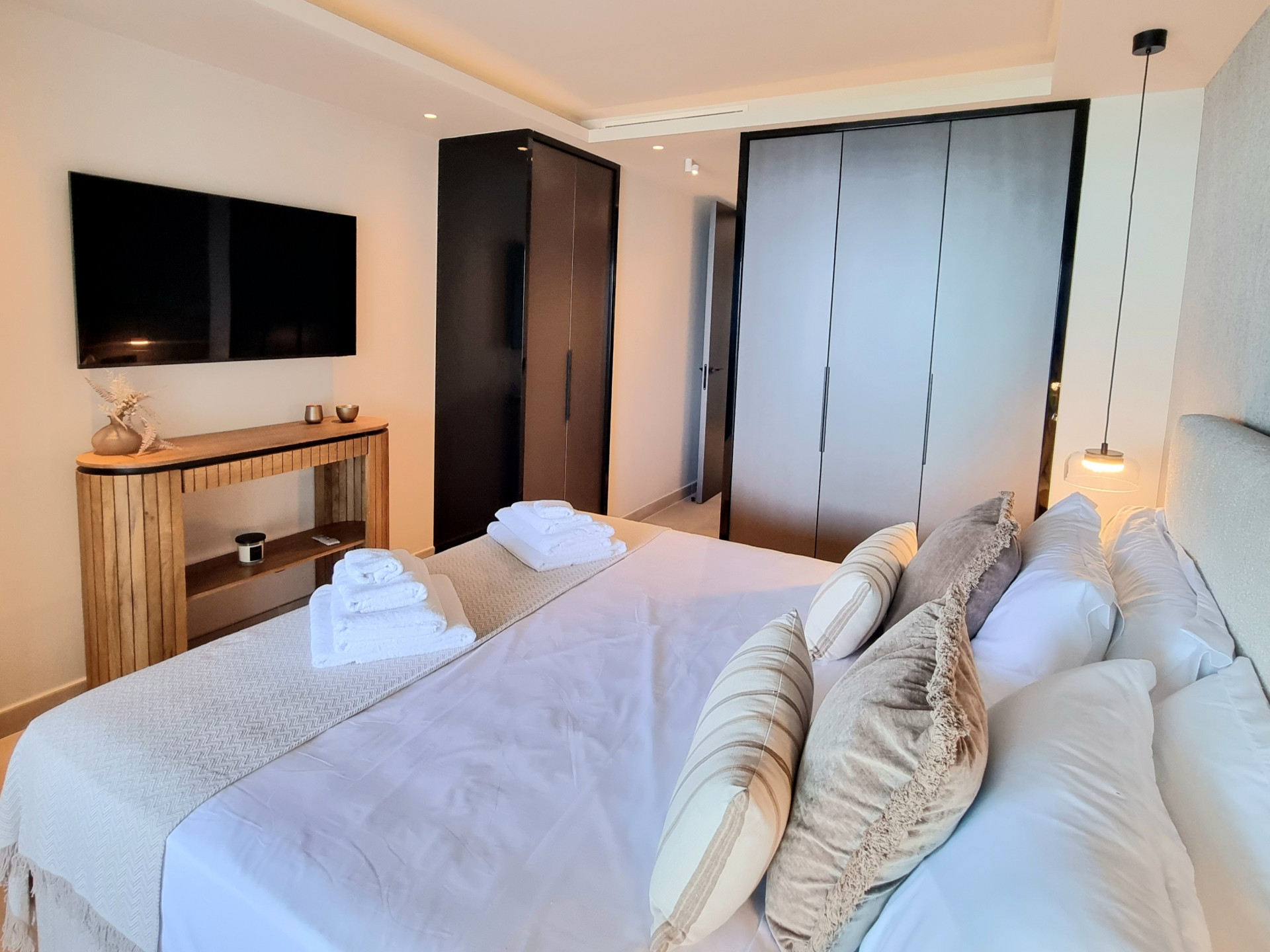 This elegant three-bedroom apartment combines contemporary luxury with coastal serenity.
