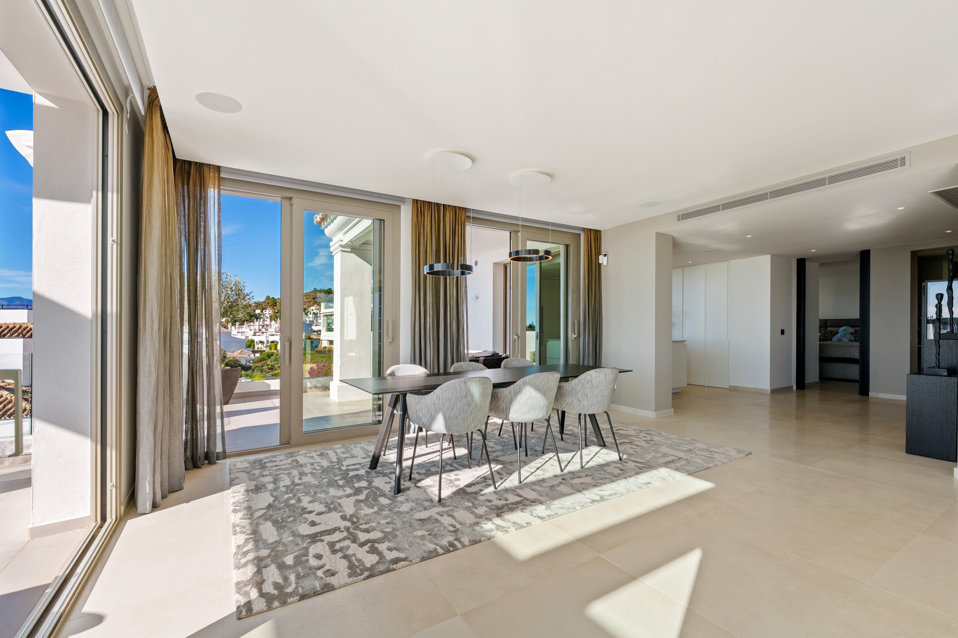 The residence provides 266 m² of built interior space, complemented by 179 m² of terraces. The main living level is arranged around an open-plan configuration integrating lounge, dining area and fully fitted modern kitchen with high-end appliances. Floor-to-ceiling sliding glass doors frame the views and extend the living space directly onto the terraces, allowing light to move freely throughout the day. Three bedrooms and three bathrooms are positioned with privacy in mind, supported by an additional guest toilet. Materials and finishes are contemporary and restrained, designed to enhance proportion and natural light rather than dominate it.
