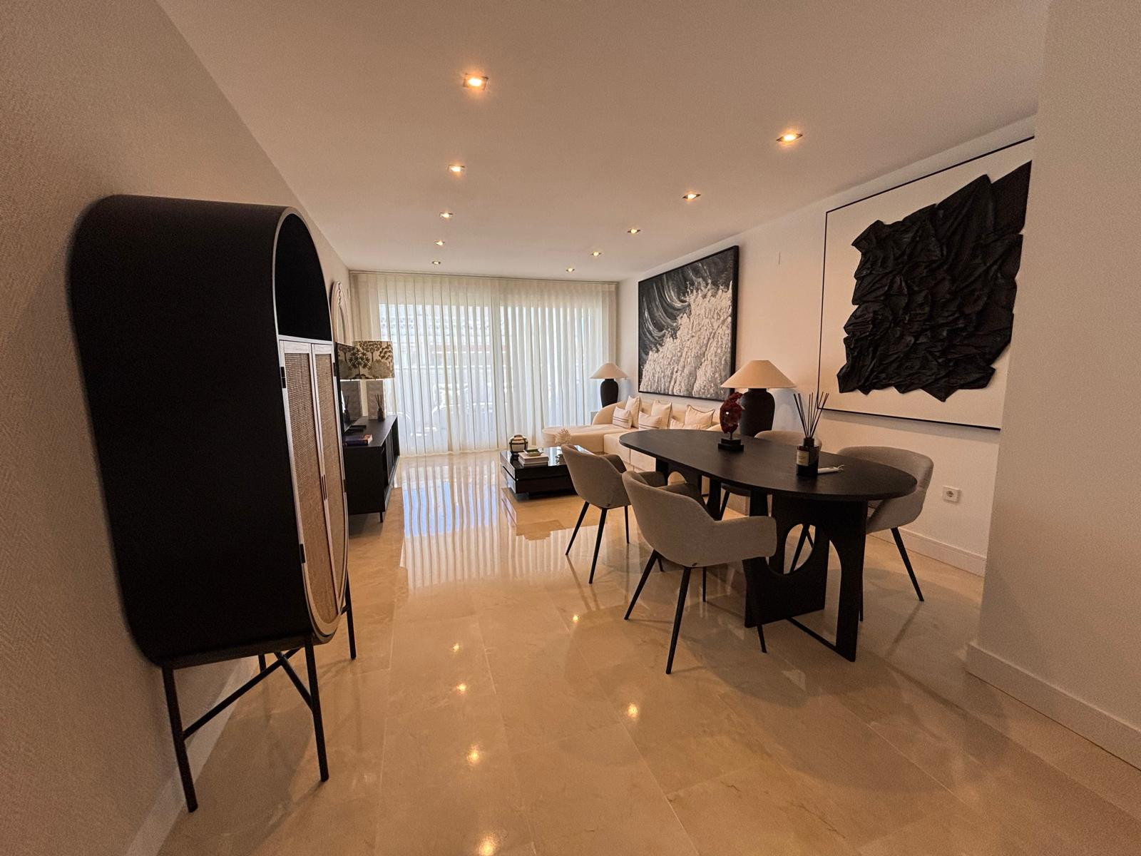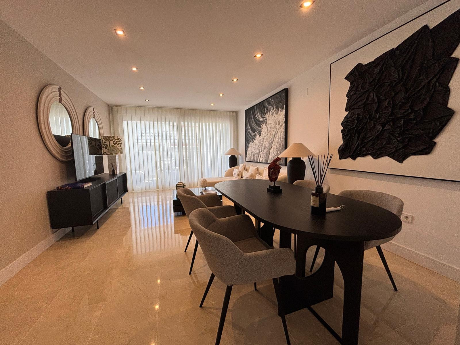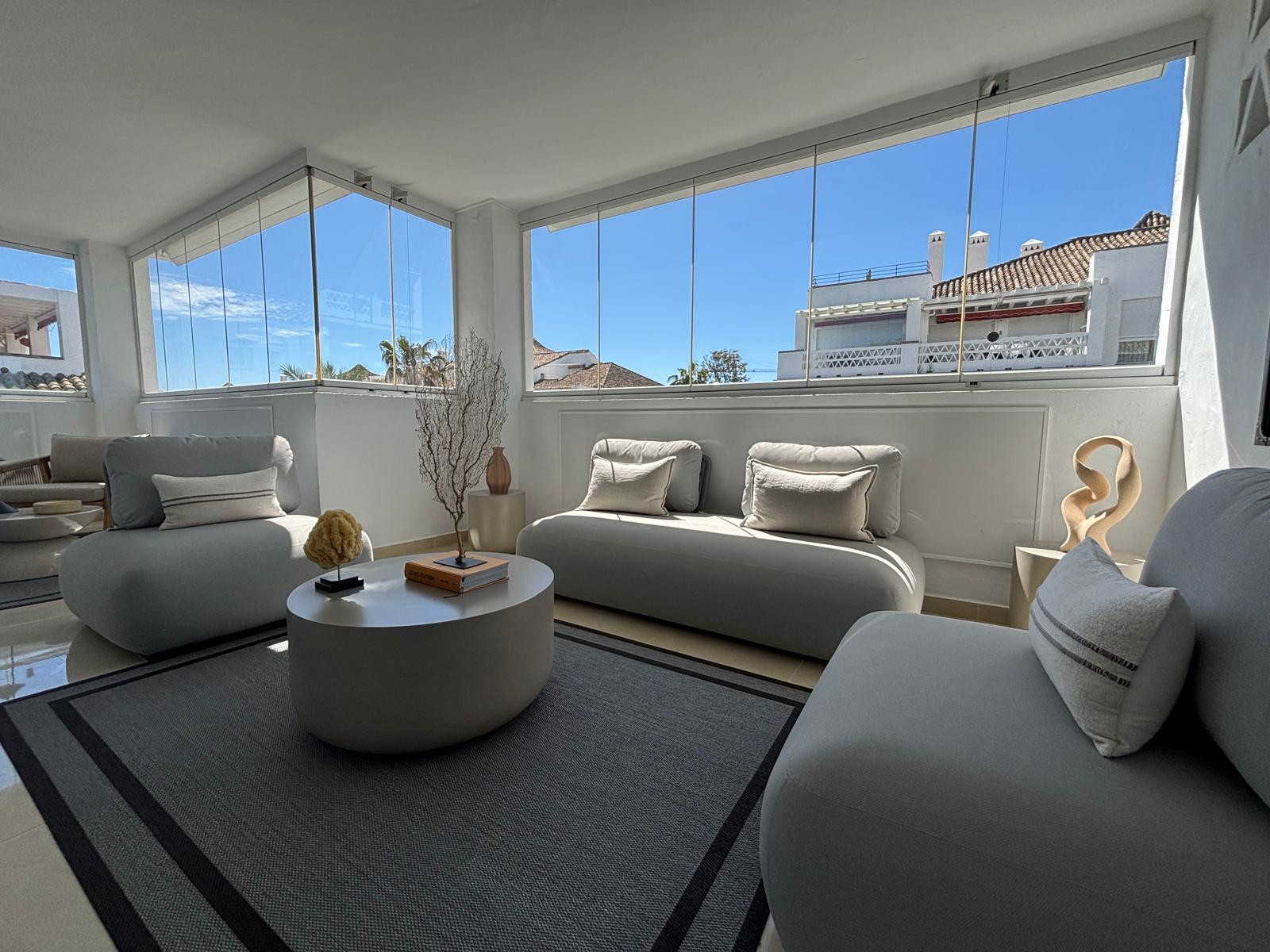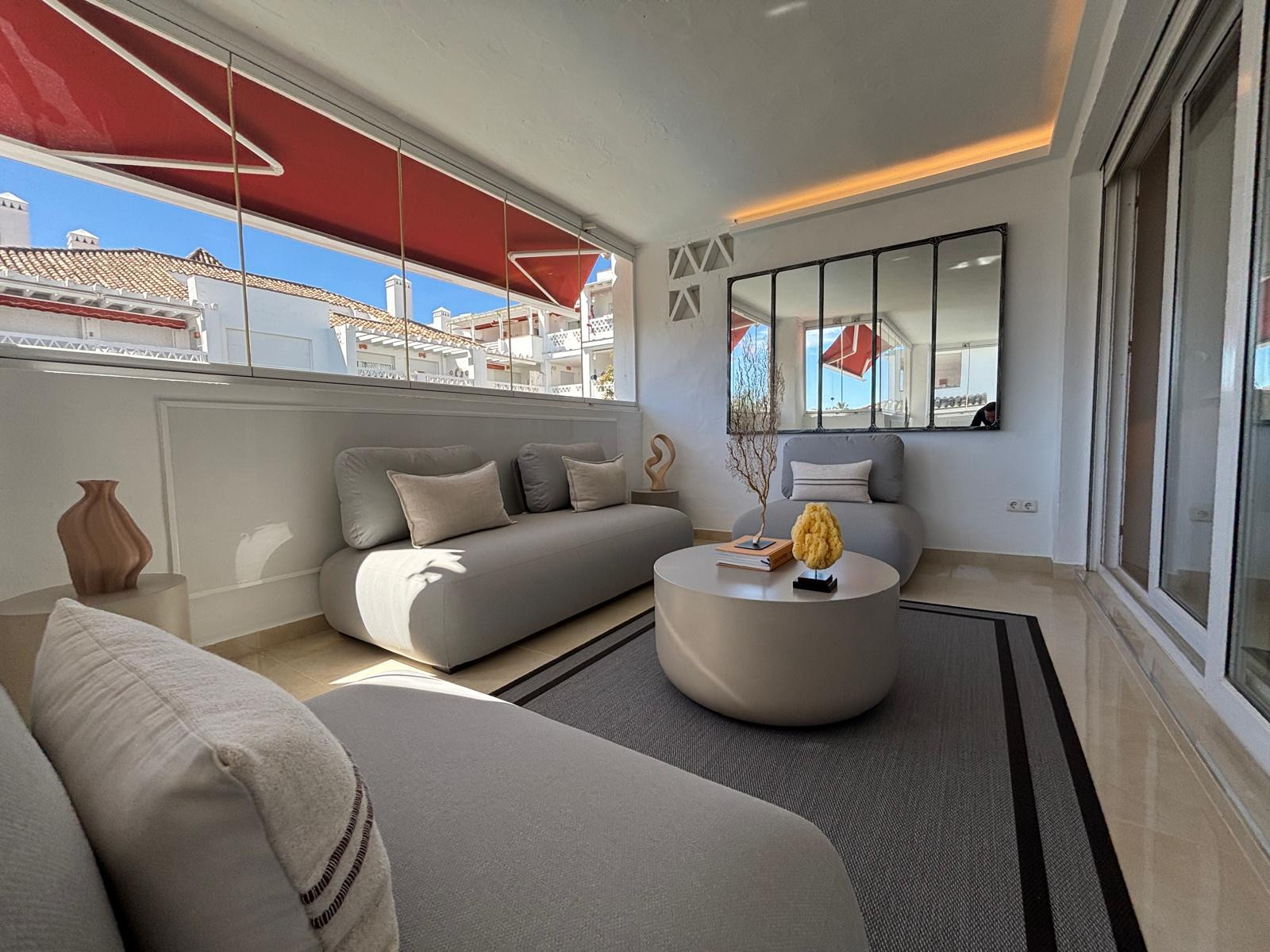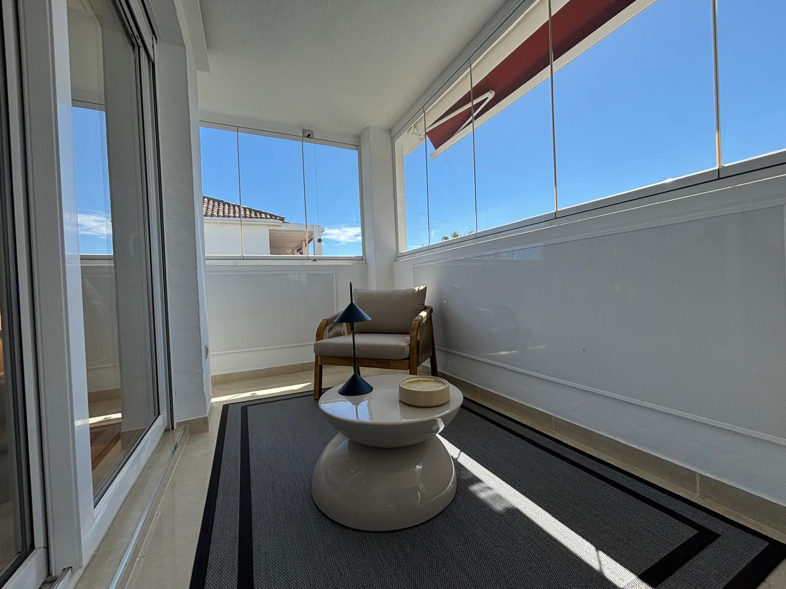 Recently renovated and tastefully furnished, the apartment stands out for its contemporary design while maintaining warmth and comfort. The fully equipped kitchen, complete with a separate laundry area, blends functionality with style. The bright living and dining area opens onto a glazed terrace with glass curtains, offering pleasant views of the tropical gardens, swimming pool, and partial sea views—an ideal setting to relax and enjoy Marbella’s year-round climate.