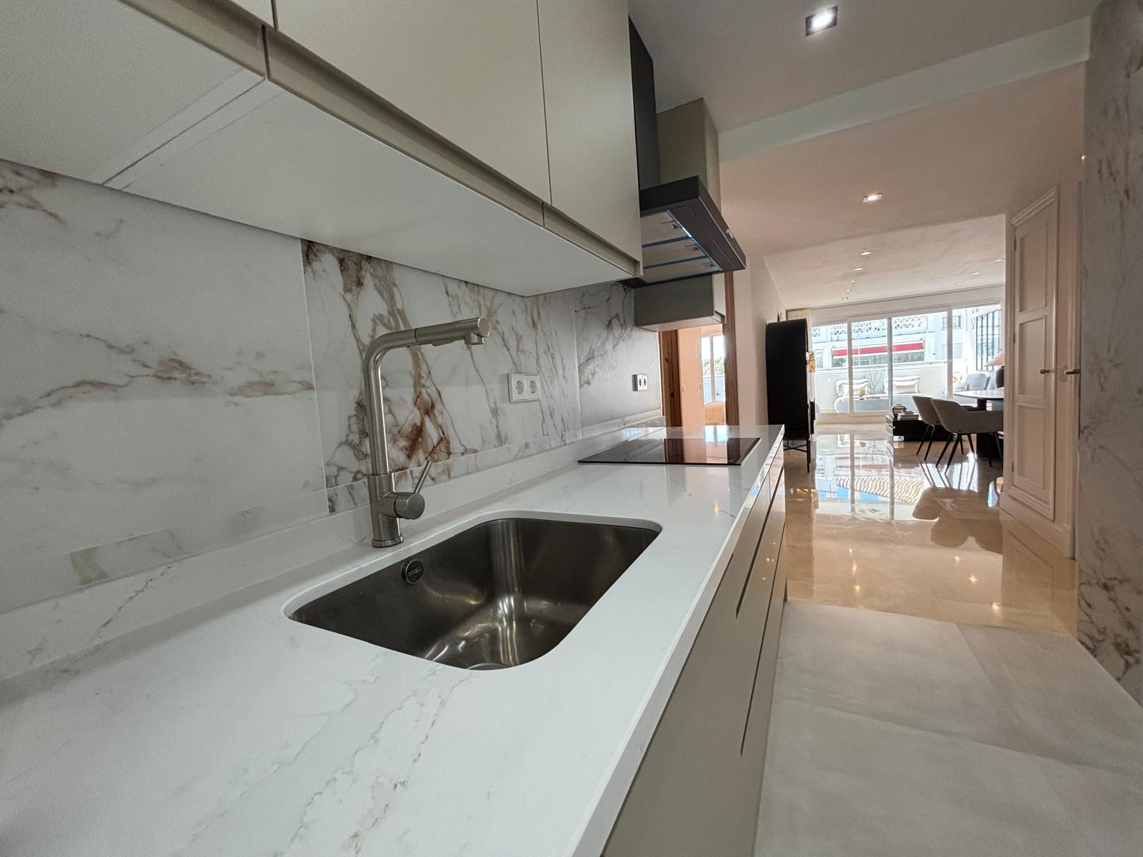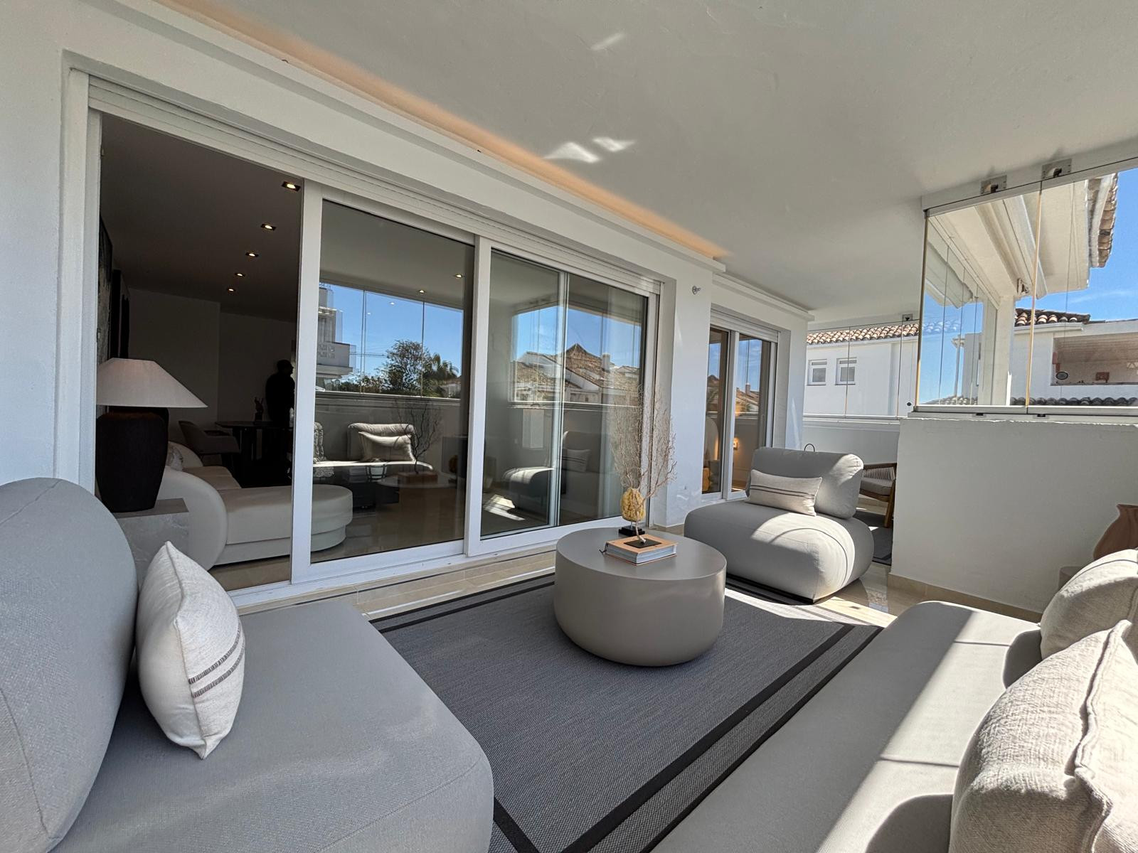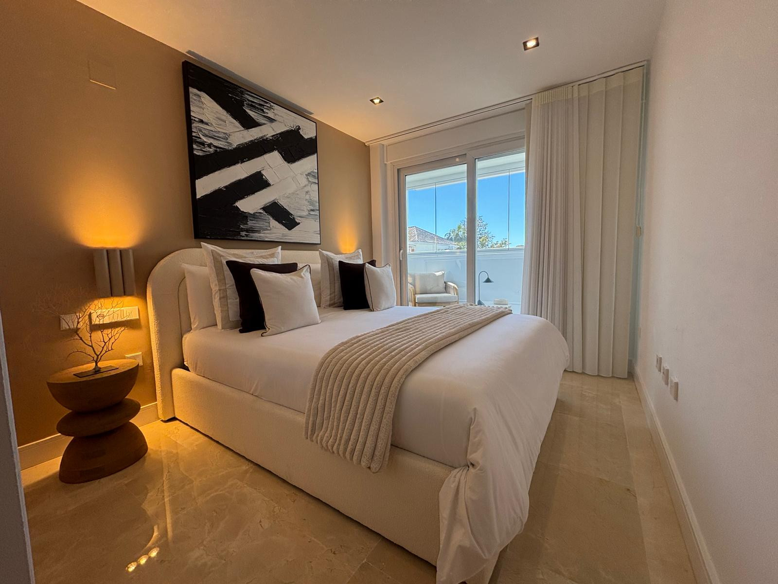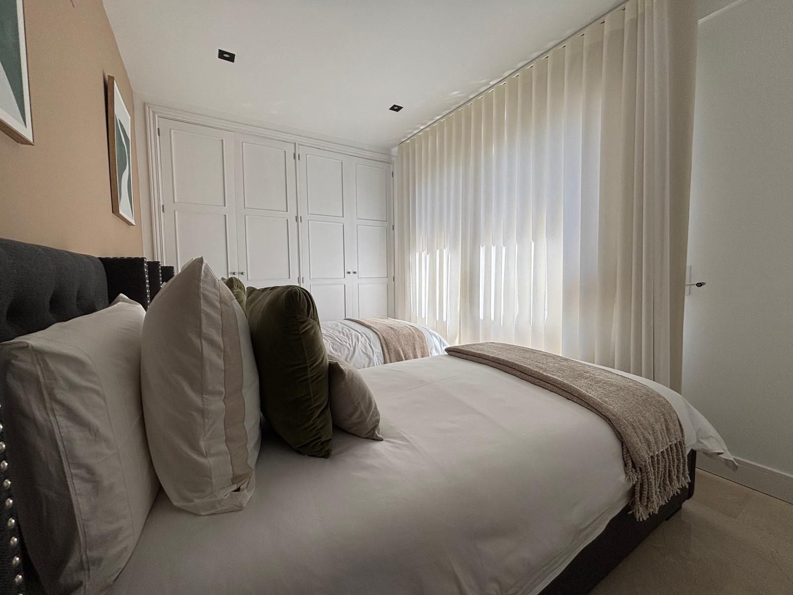 Recently renovated and tastefully furnished, the apartment stands out for its contemporary design while maintaining warmth and comfort. The fully equipped kitchen, complete with a separate laundry area, blends functionality with style. The bright living and dining area opens onto a glazed terrace with glass curtains, offering pleasant views of the tropical gardens, swimming pool, and partial sea views—an ideal setting to relax and enjoy Marbella’s year-round climate.