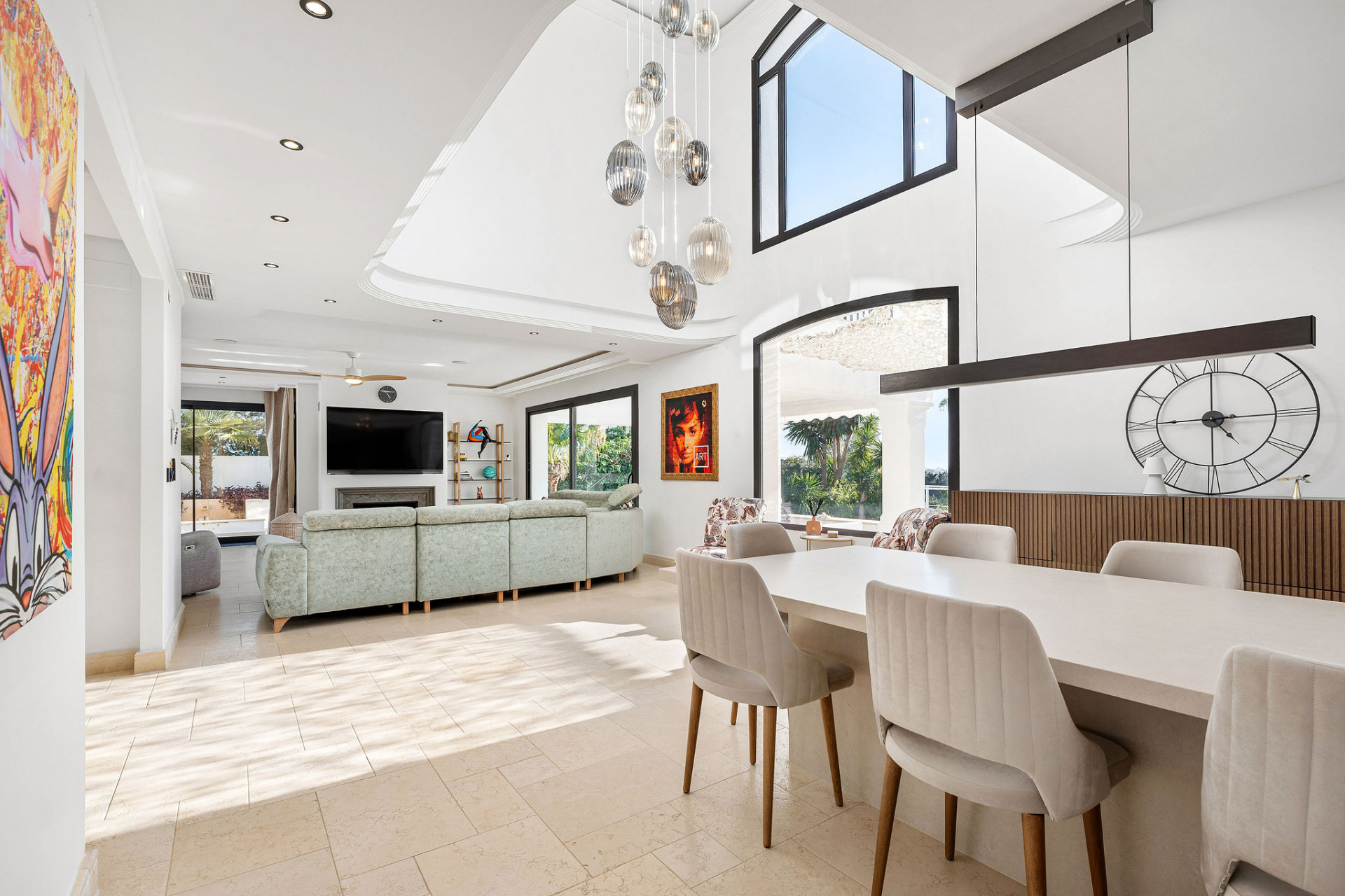 JUST-00619PNestled on the prestigious frontline of Los Naranjos Golf Course, this villa is a rare jewel that boasts both architectural finesse and an enviable position. Overlooking the 12th hole, with sweeping vistas of lush greenery and a serene lake, the property enjoys a sun-drenched aspect that elevates every moment spent within its walls. Recently renovated, it exudes an air of contemporary elegance, yet it retains a timeless charm that seems almost to whisper of a bygone, more genteel era. Here, modernity meets comfort in perfect harmony.