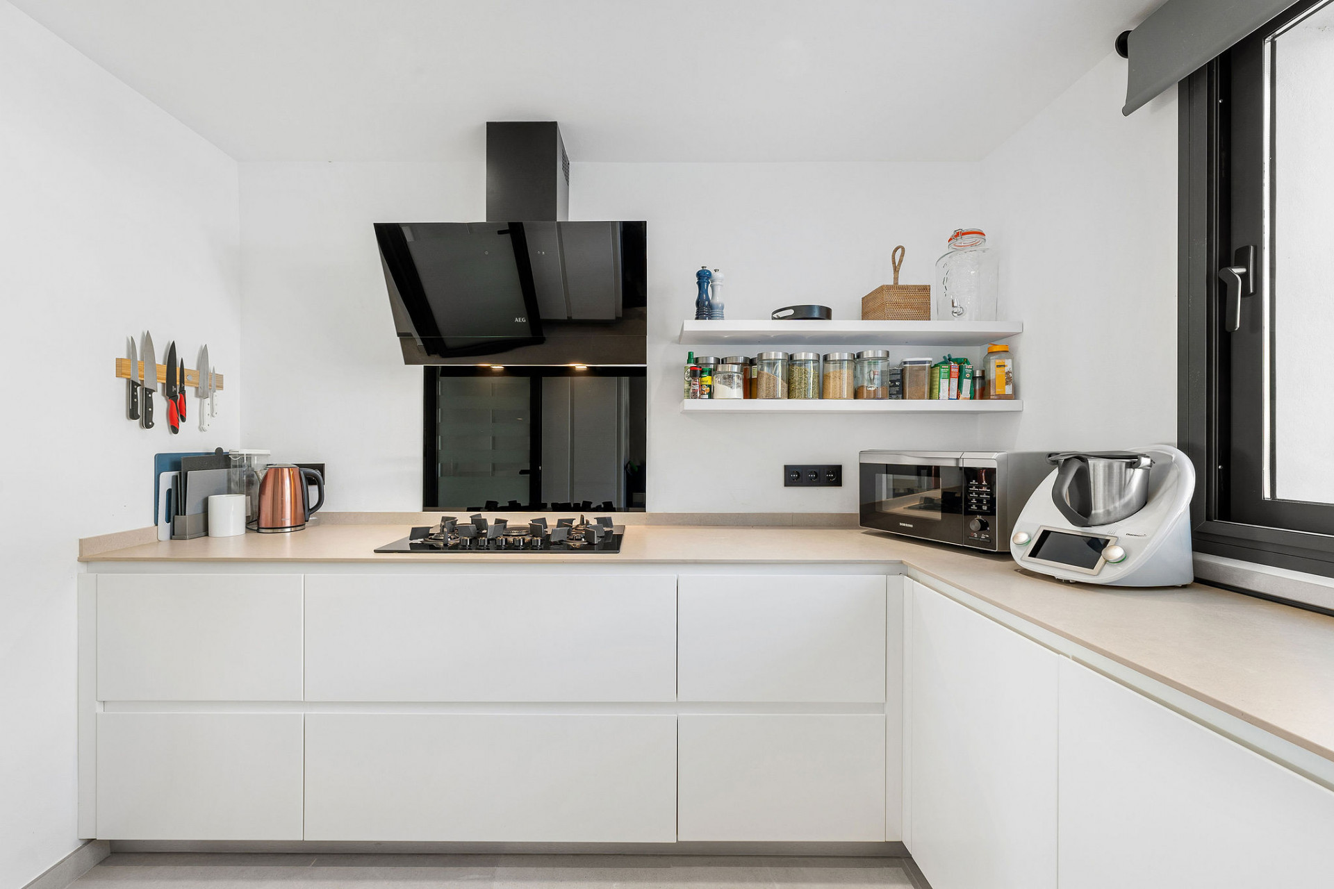 Upon entering, the immediate sense of space is profound. The entrance is framed by towering double-height windows, offering an unobstructed panorama of the golf course and its water features. These windows are not mere aesthetic elements; they are the villa’s eyes to the world, bringing the outdoors in and allowing the eye to wander over the verdant expanse beyond. The entrance level is a symphony of light and space, with open-plan living areas that flow effortlessly into one another. The kitchen, the heart of any home, is designed for the culinary connoisseur. A spacious and well-appointed affair, it features sleek surfaces and high-end appliances, and is seamlessly integrated into the living and dining areas. Adjacent, a separate back kitchen provides a more functional space for preparation and service, ensuring that the villa’s entertaining capacity is second to none.