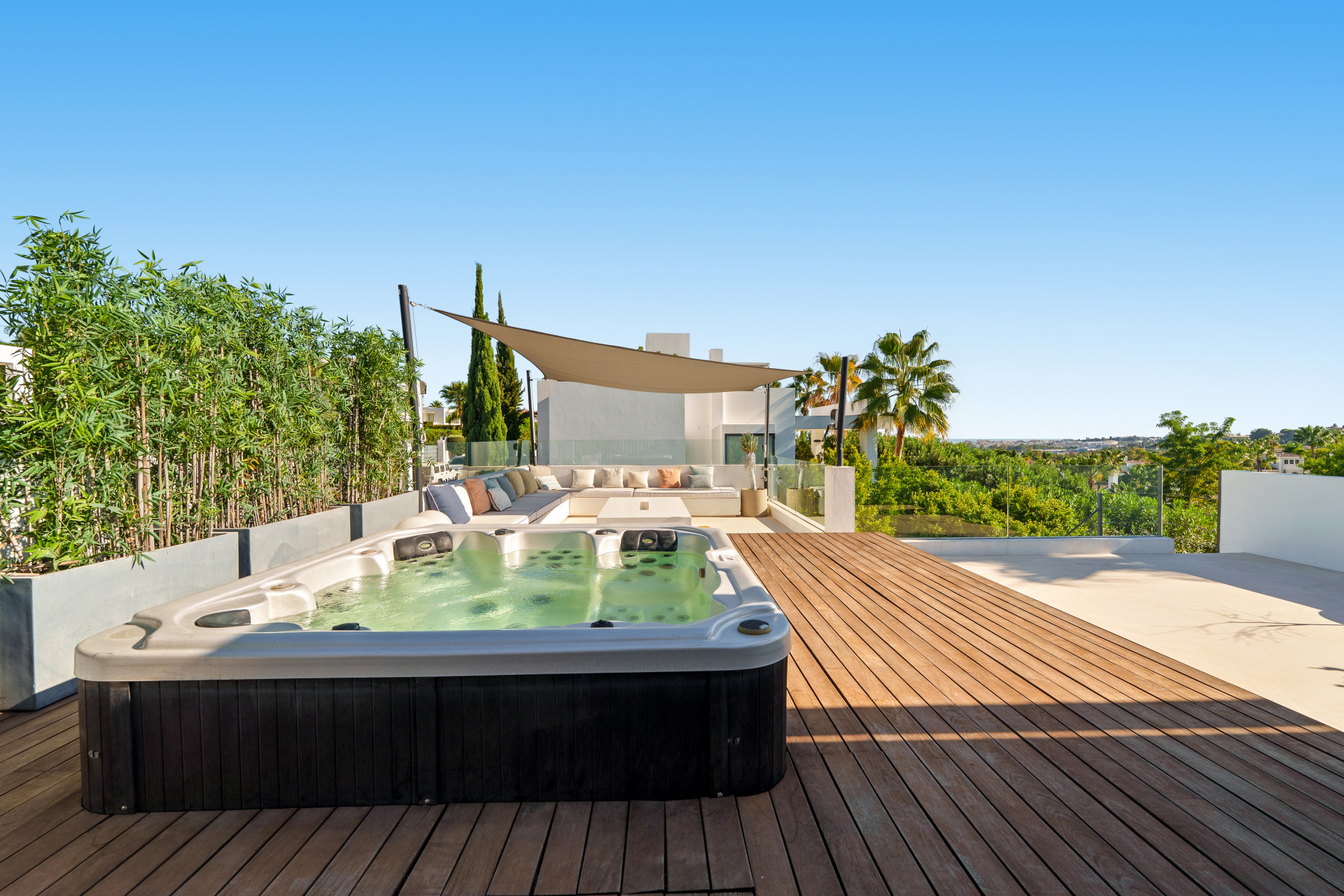 An upper-level solarium includes a jacuzzi, creating an elevated space for relaxation with open views over the surrounding Golf Valley. The combination of shaded pergola seating and open terrace zones ensures usability throughout the day. A private garage and driveway provide secure parking for two vehicles.