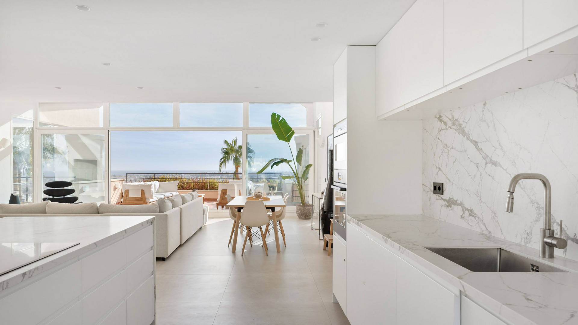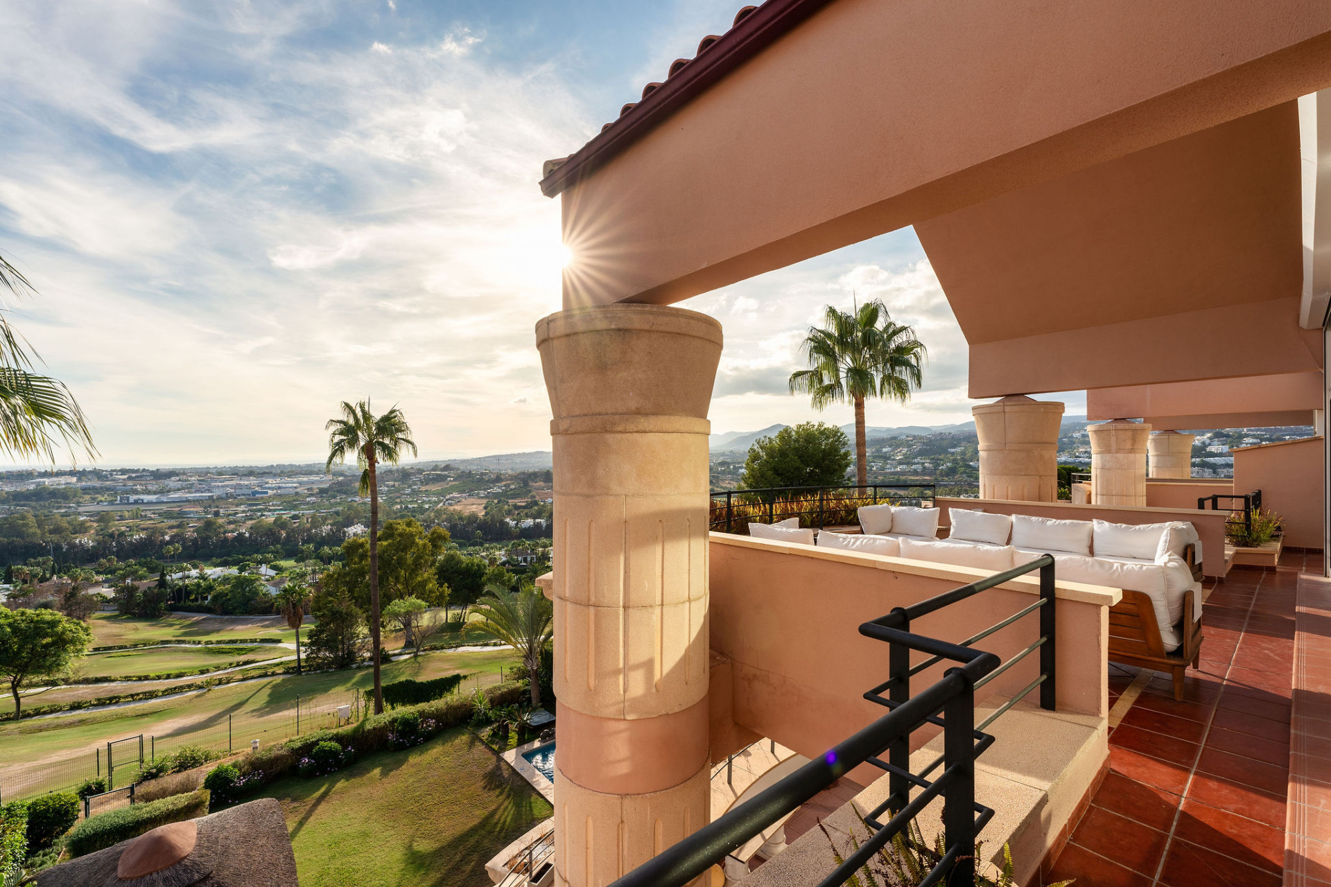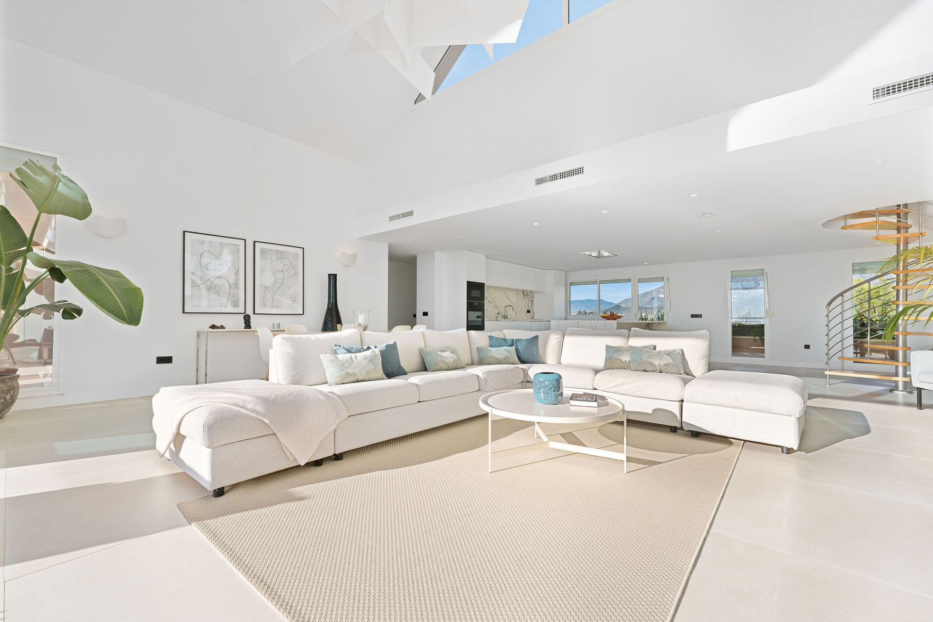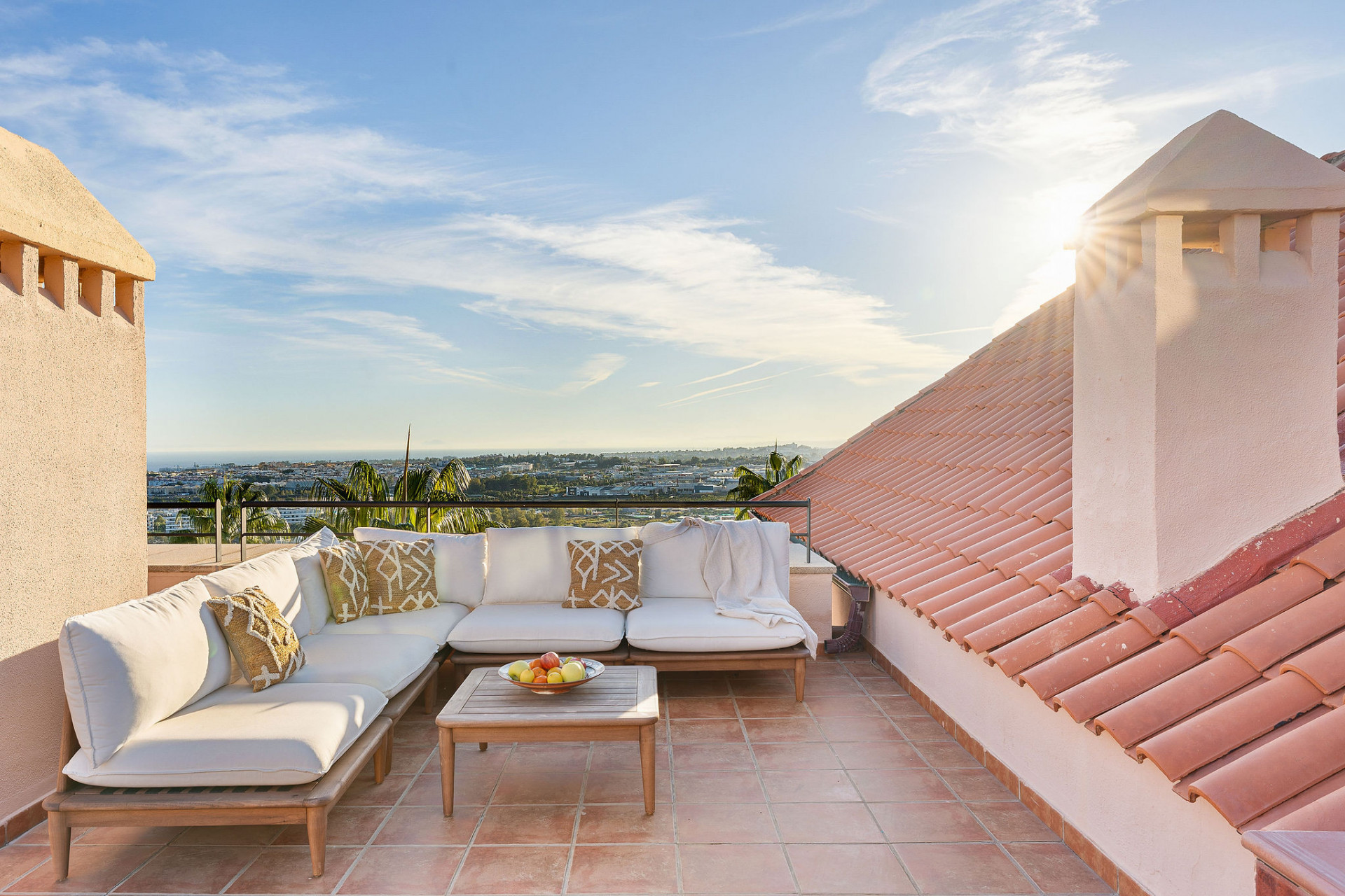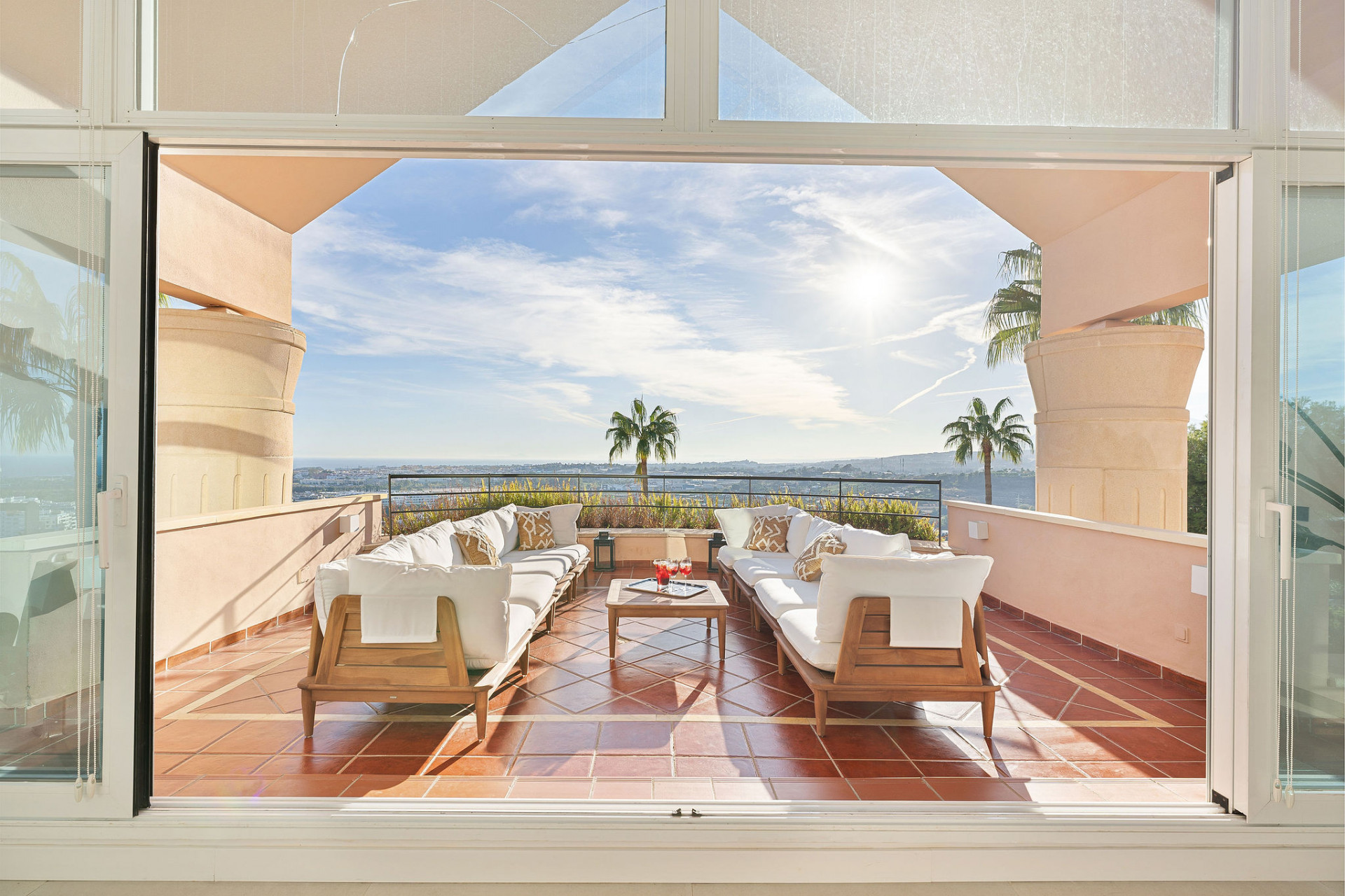 With three spacious bedrooms and two modern bathrooms, this elegant residence offers breathtaking 360-degree panoramic views of the Mediterranean Sea, La Concha Mountain, and the celebrated golf courses of Nueva Andalucía.