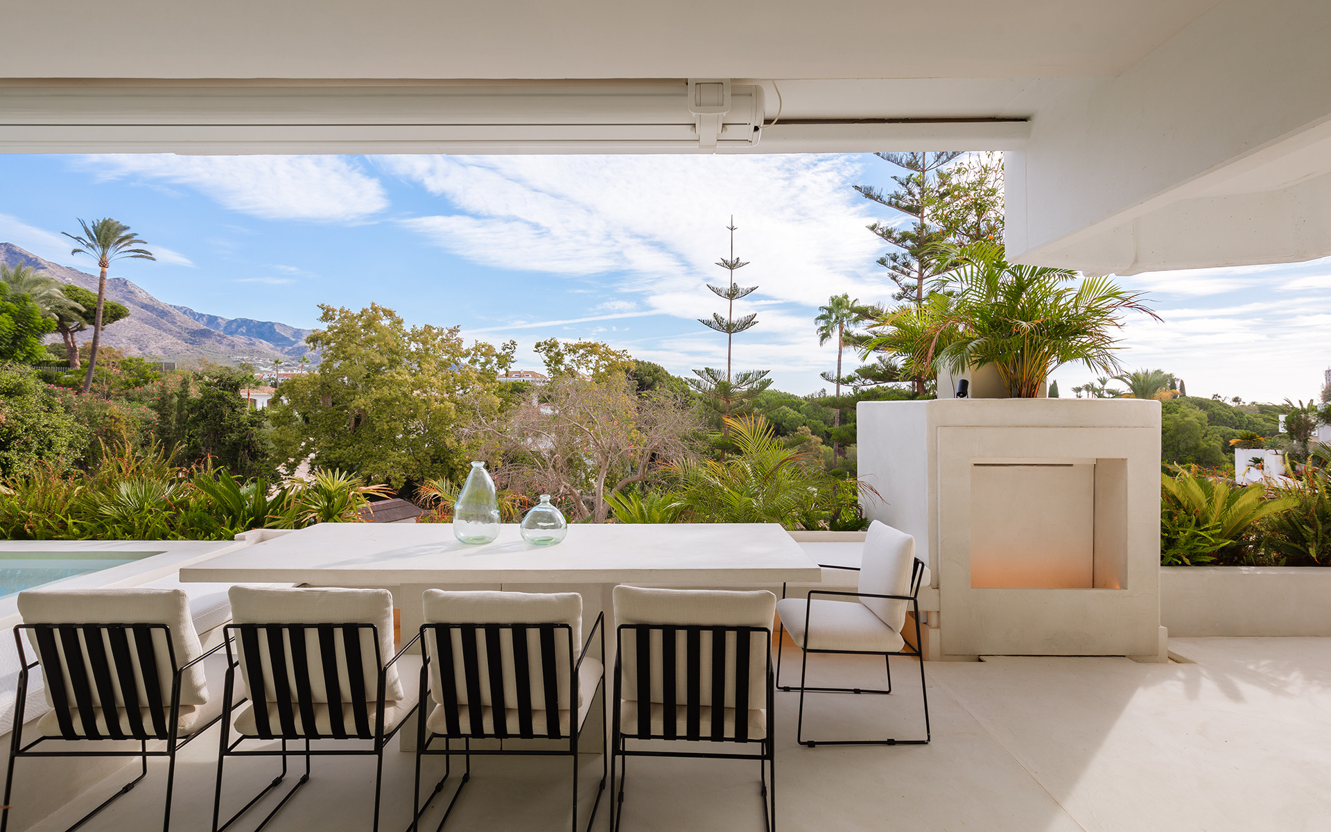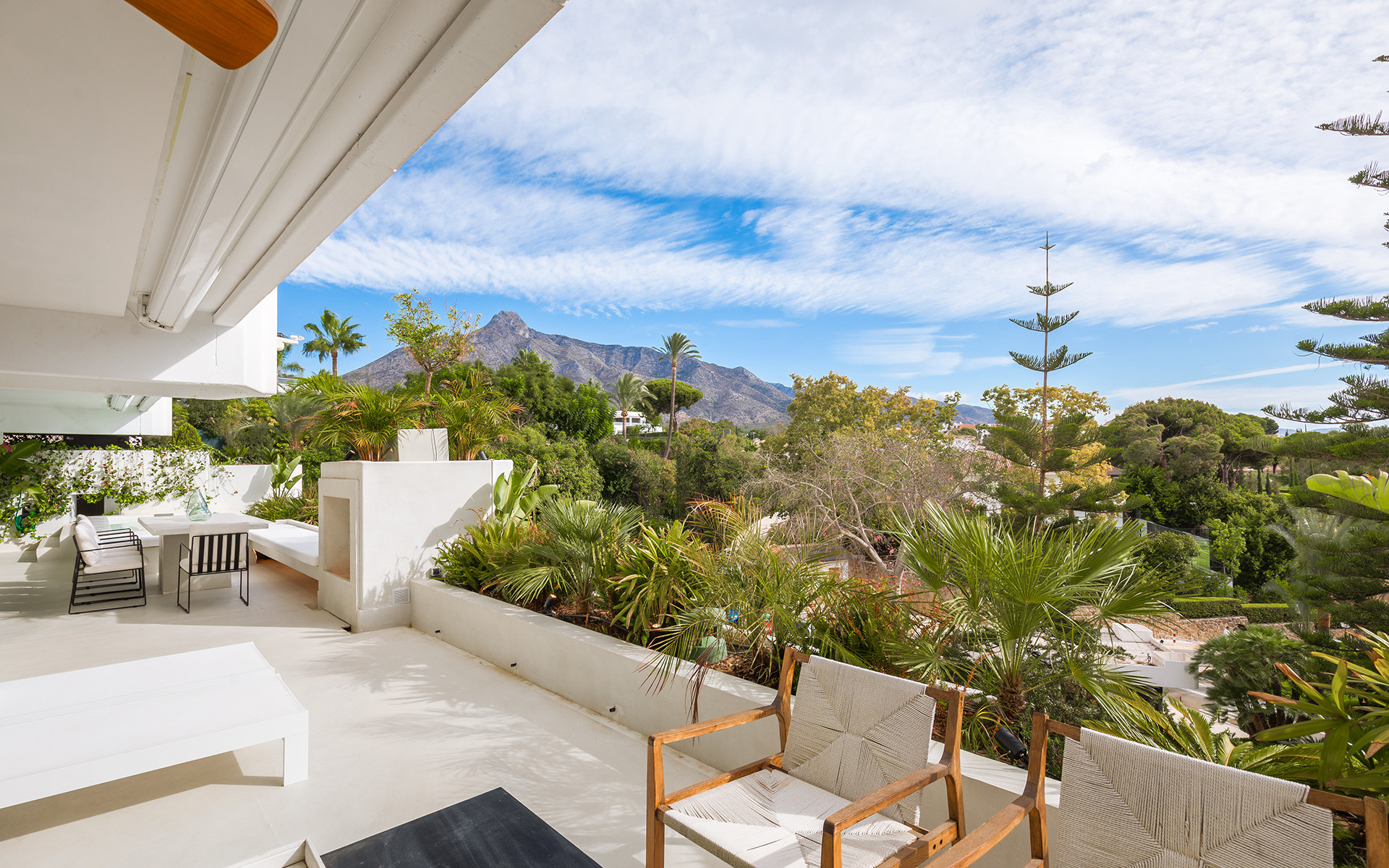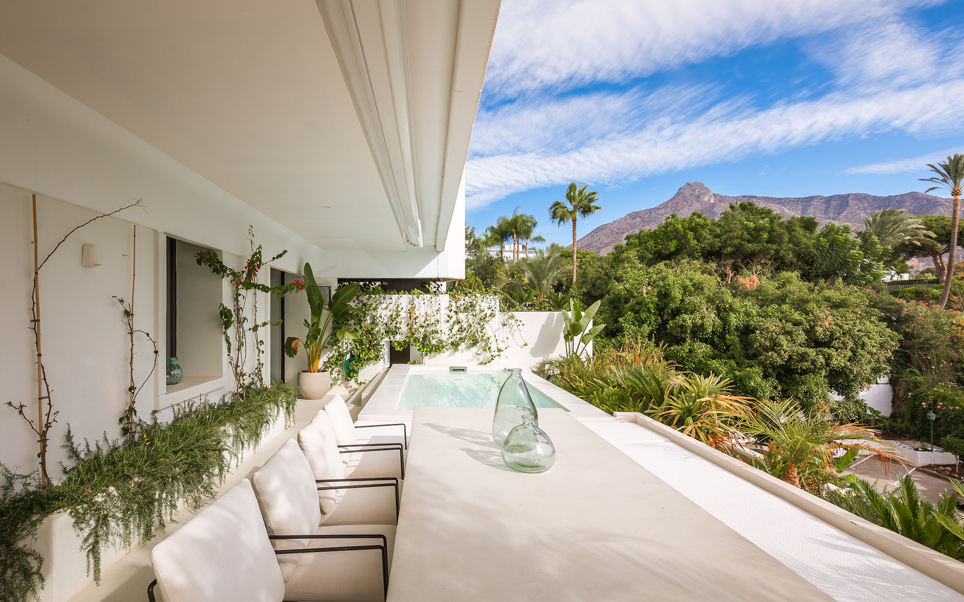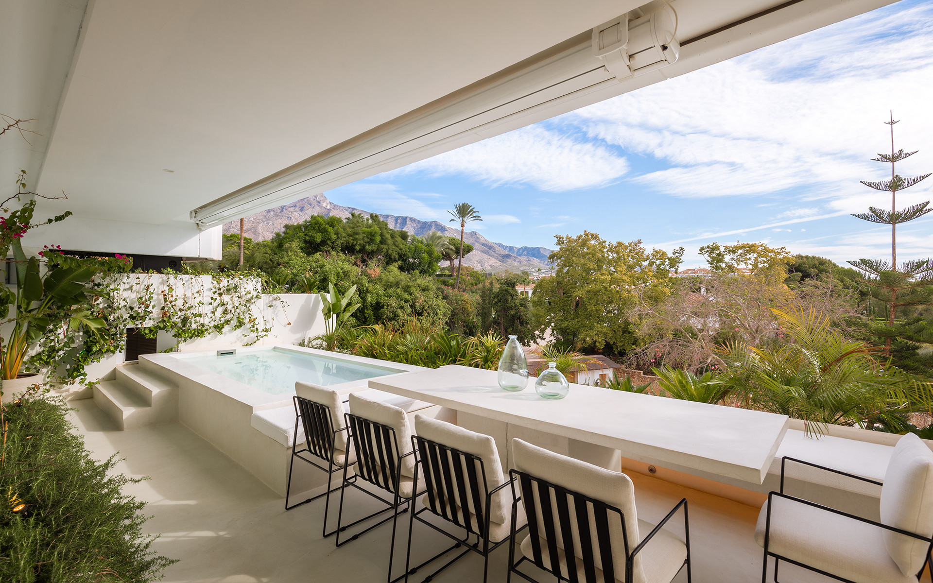 The 100 m² terrace provides stunning views of La Concha Mountain and partial sea views, featuring a heated pool, outdoor dining area, and seating areas.
