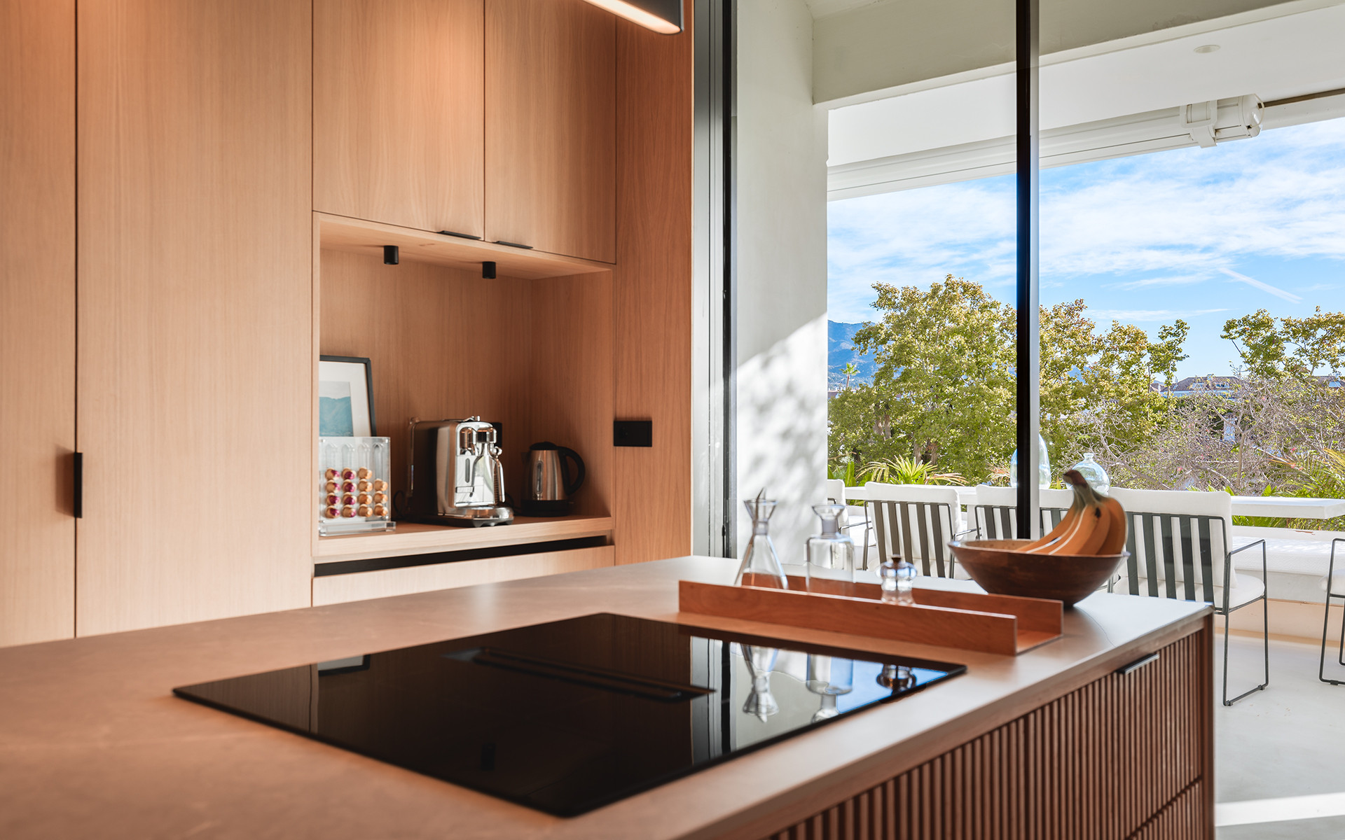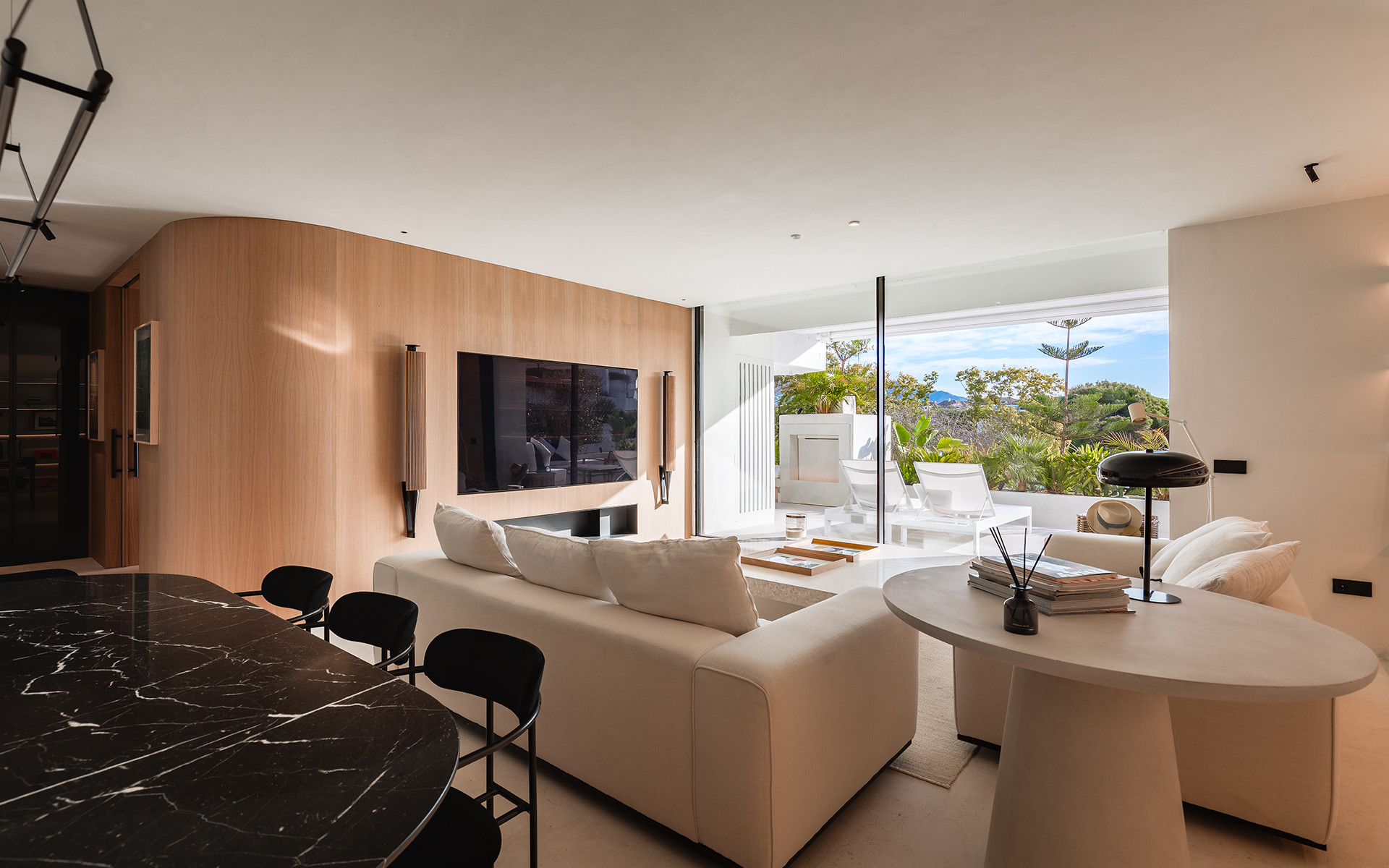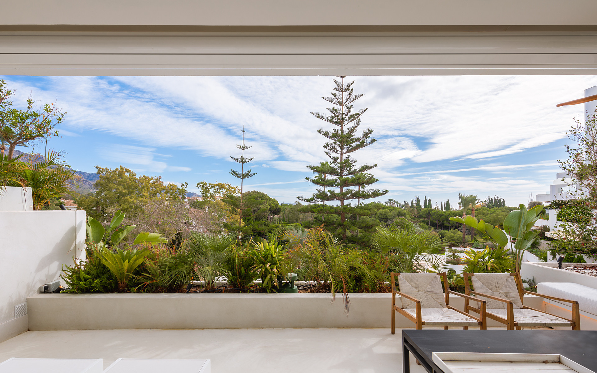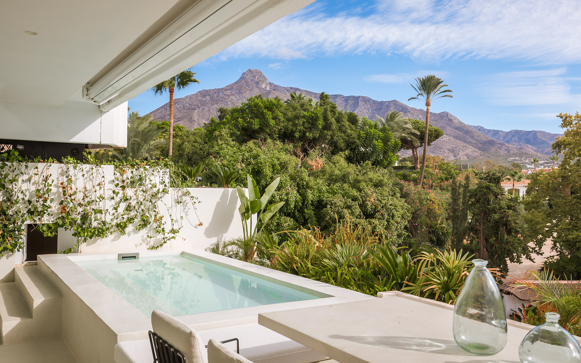 The 100 m² terrace provides stunning views of La Concha Mountain and partial sea views, featuring a heated pool, outdoor dining area, and seating areas.