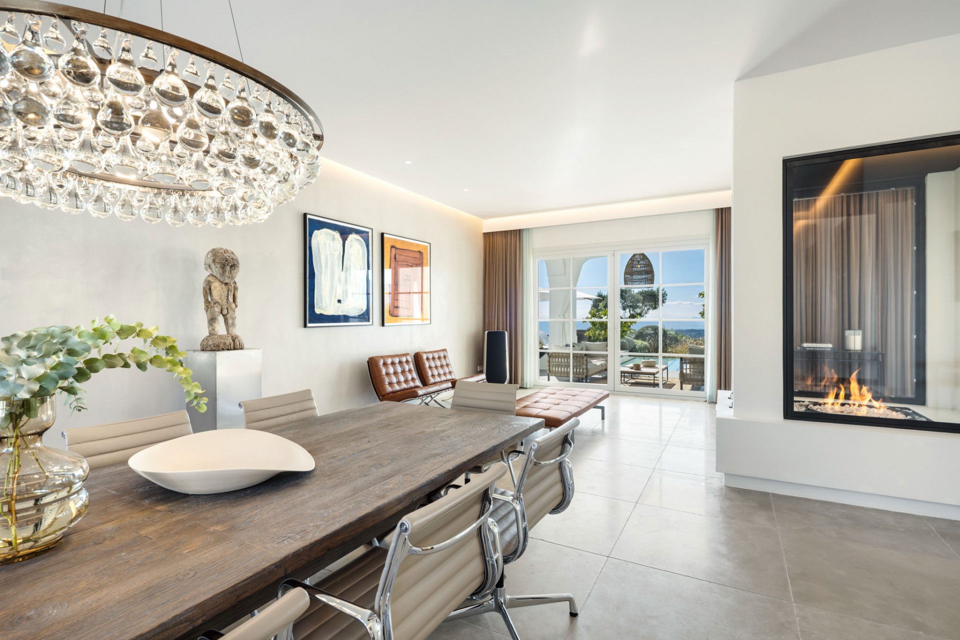 Upon entering the villa, you are welcomed into an expansive main lounge where a sleek glass fireplace becomes a central design feature, perfectly framing views over the 113 m² swimming pool, immaculate gardens, and the sea beyond.