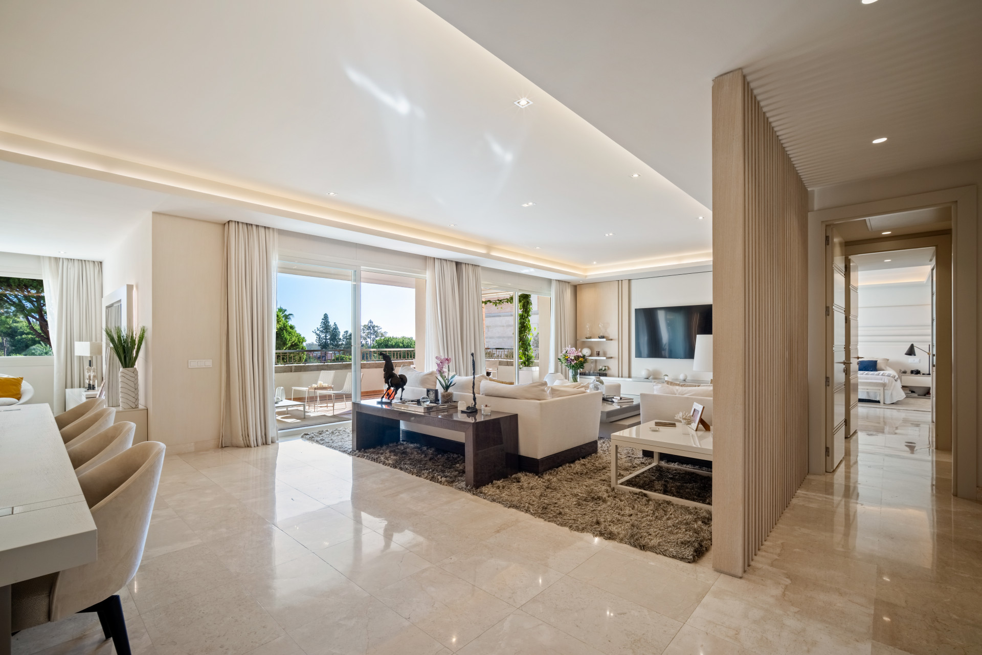 The open-plan living and dining area flows seamlessly onto generous terraces, creating a natural extension of the home and inviting an abundance of natural light.