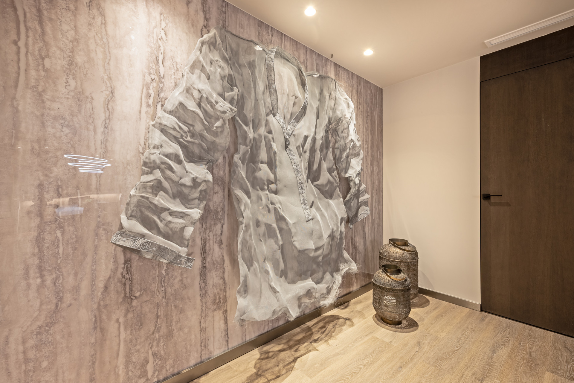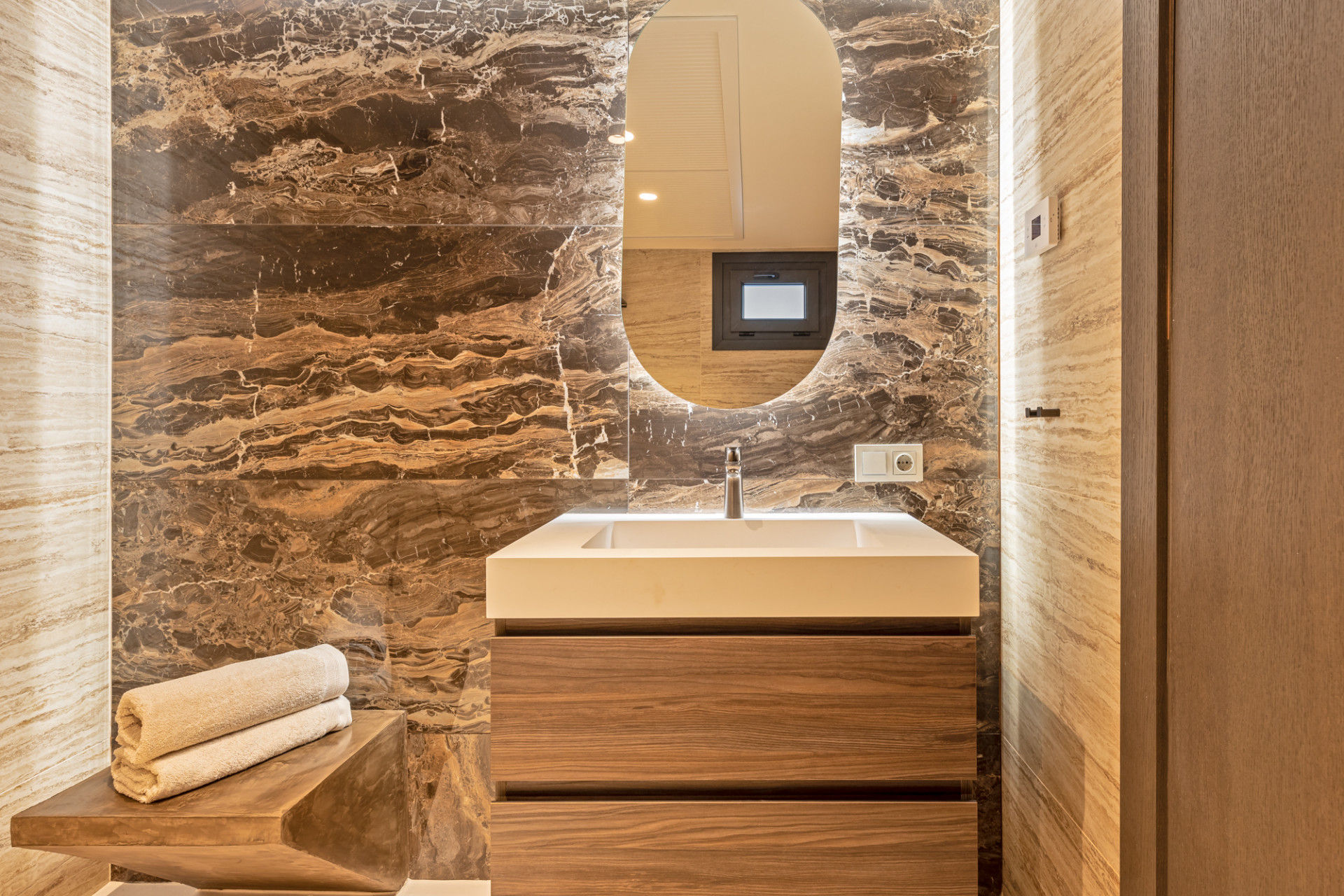This generously proportioned outdoor space is no mere afterthought. It is an extension of the apartment’s lavish interior, decked out with lounge-style furnishings, a chic eco-friendly fire pit, and a striking installation of moss wall art that adds a touch of organic vibrancy to the contemporary elegance. From here, your eyes are drawn to the panoramic views of Puerto Banús marina—a sight that never ceases to inspire, whether by day or night.