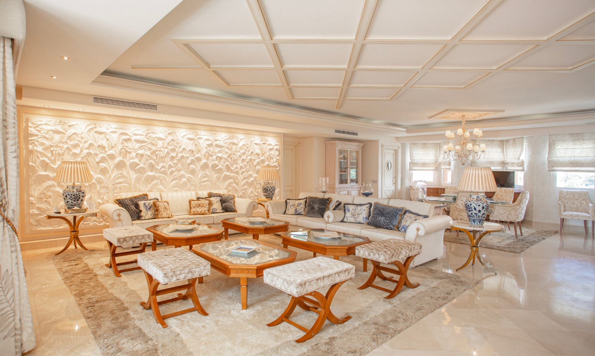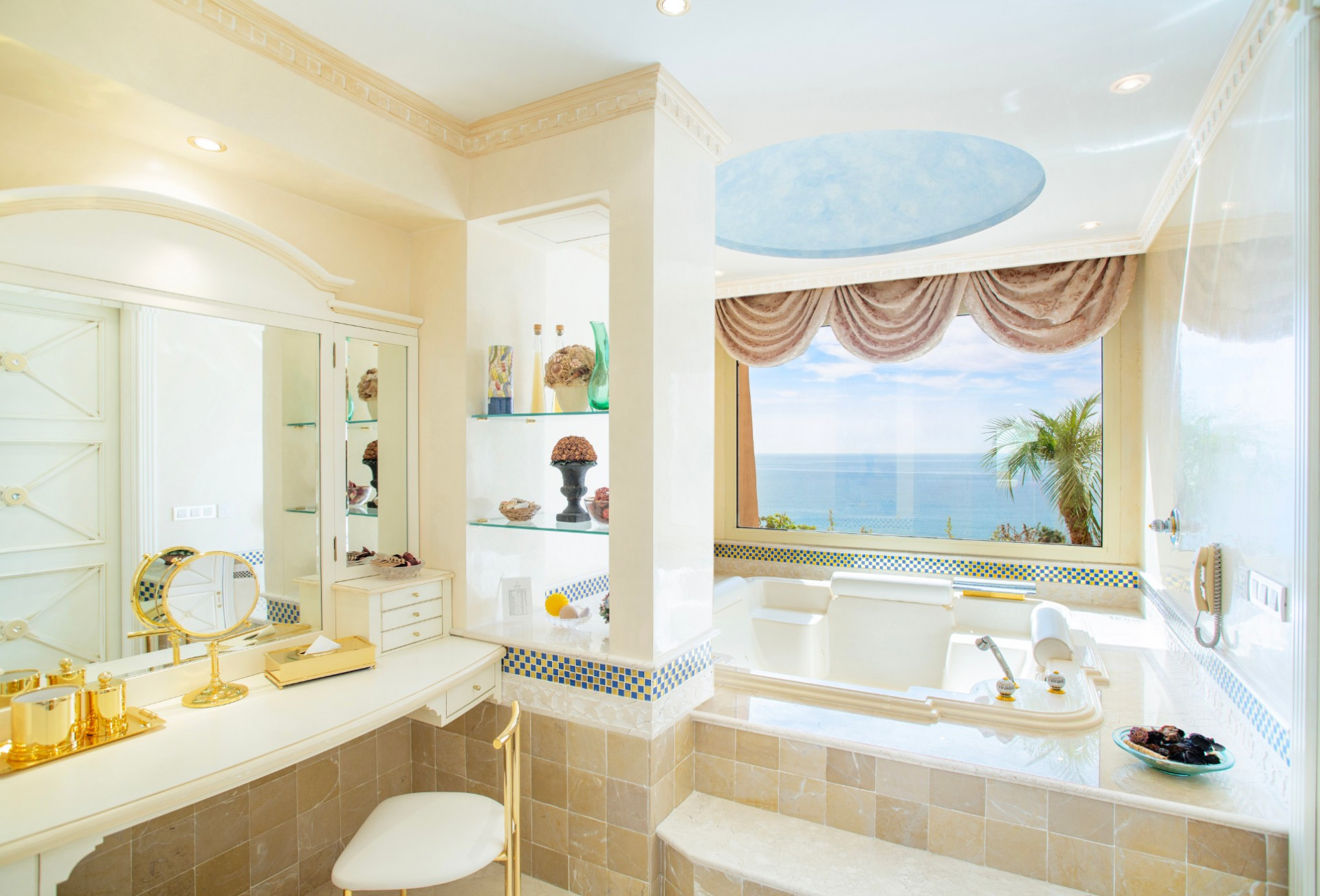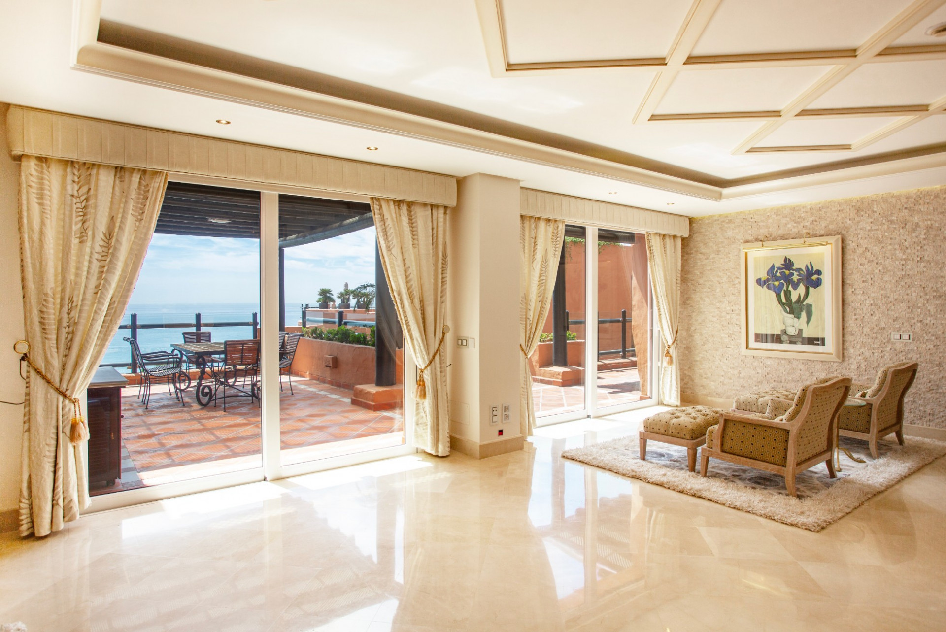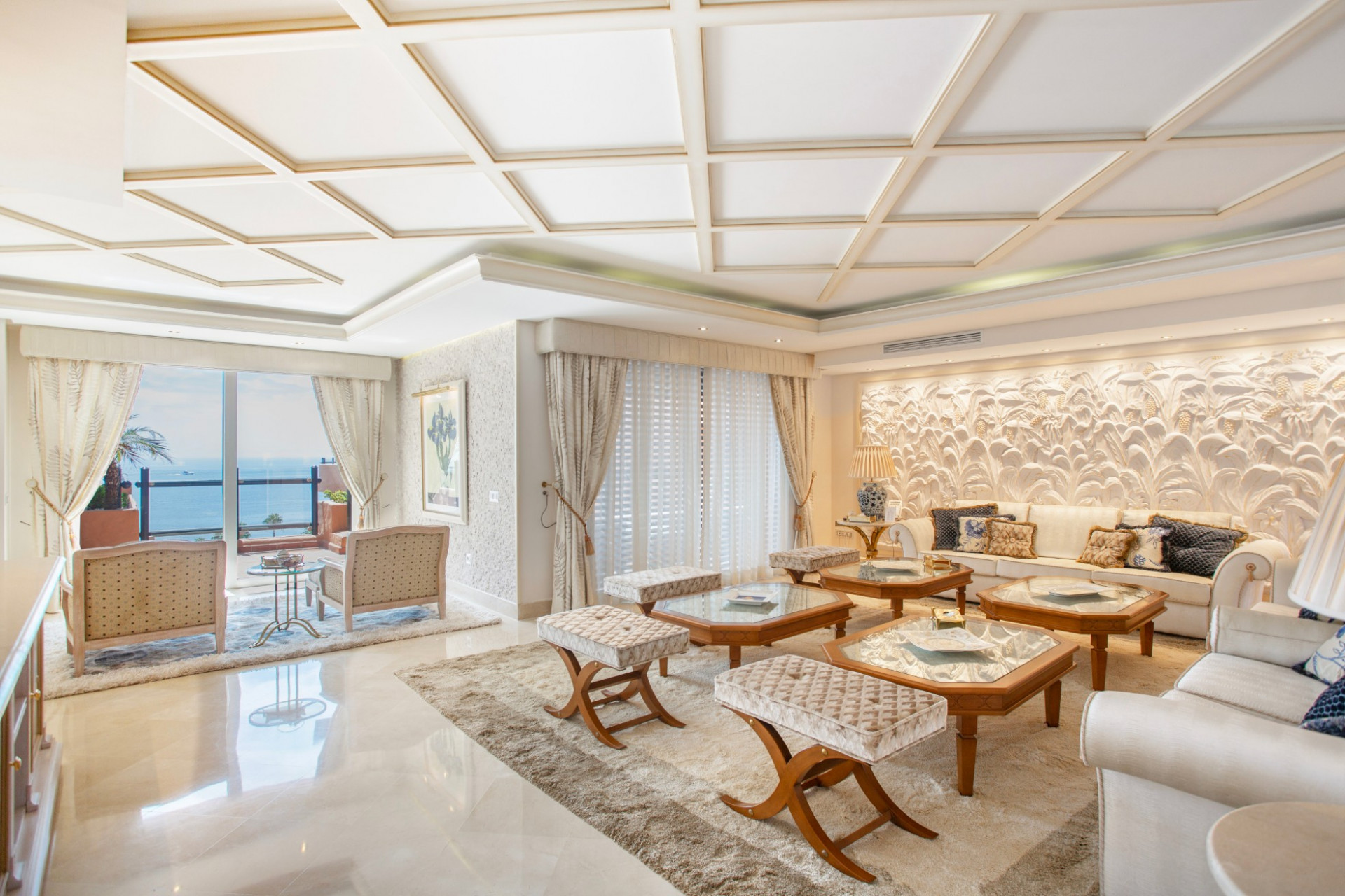 The expansive interior, adorned with refined décor and opulent furnishings, exudes timeless beauty, while floor-to-ceiling windows frame stunning sea views, enhancing the atmosphere with a feeling of serenity.
