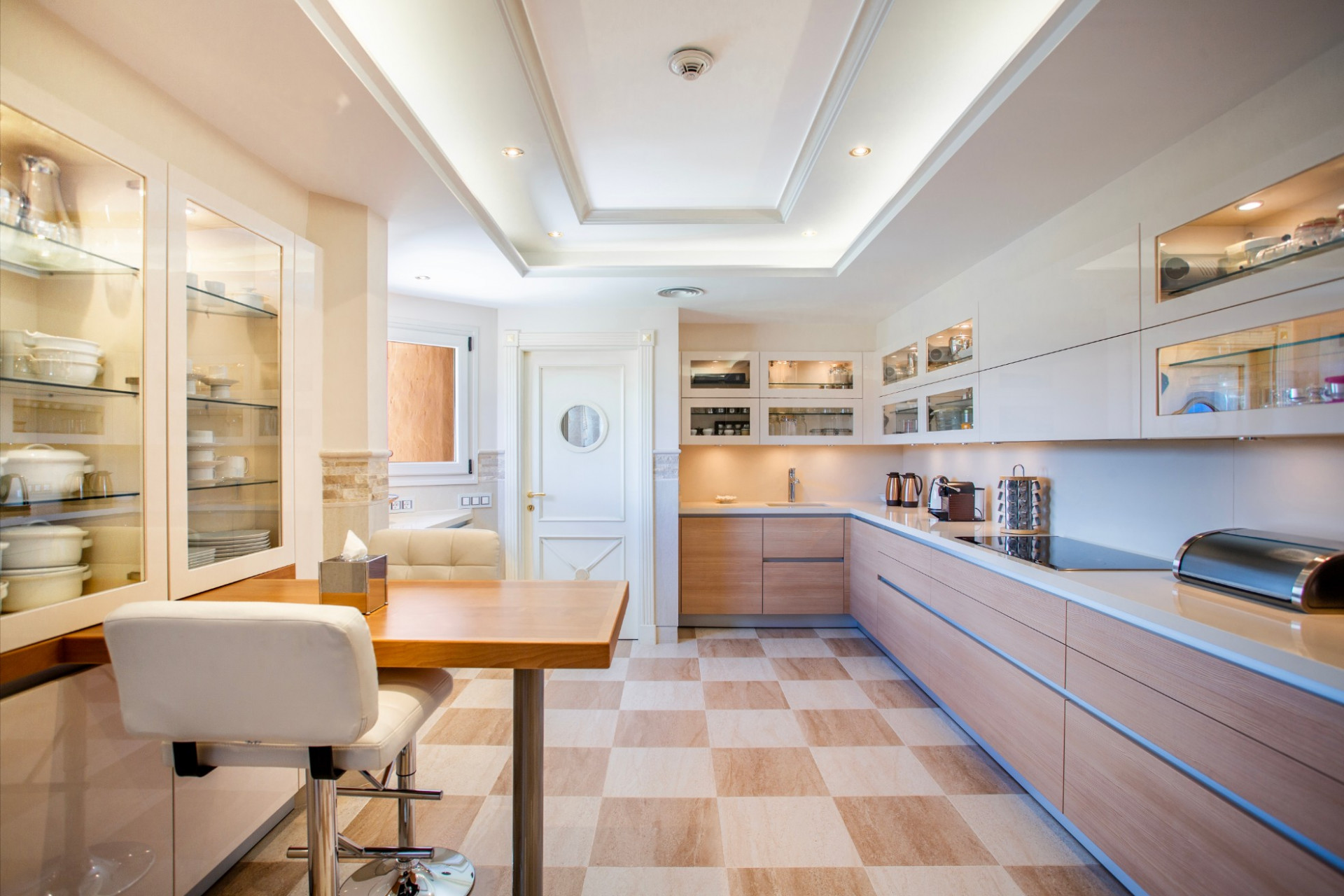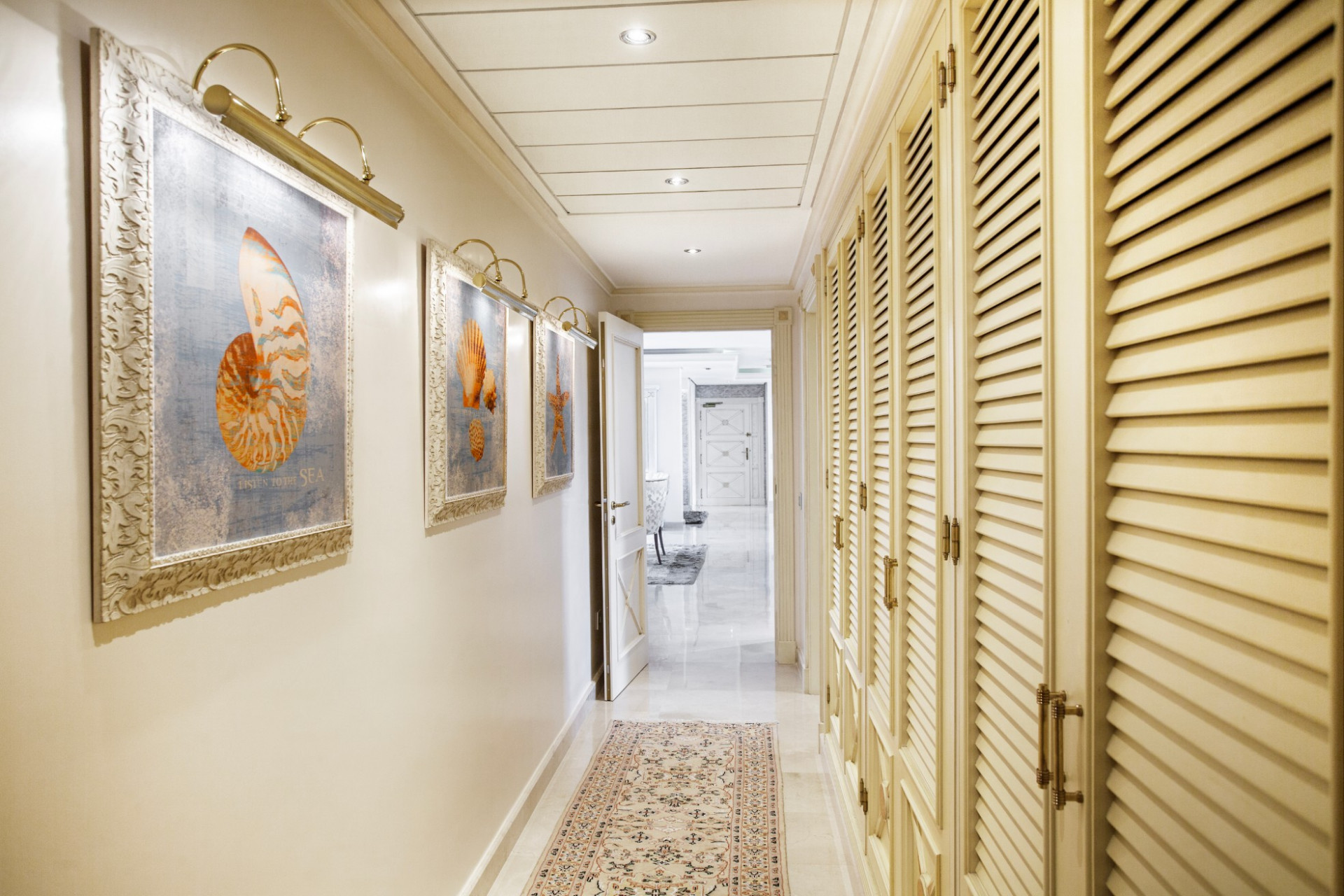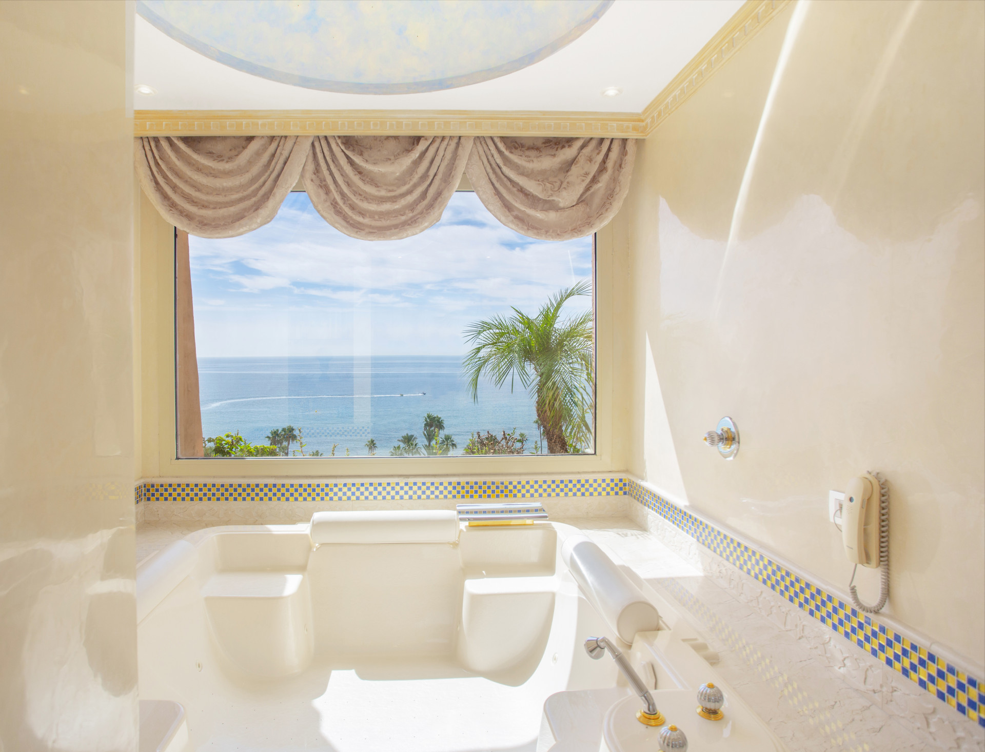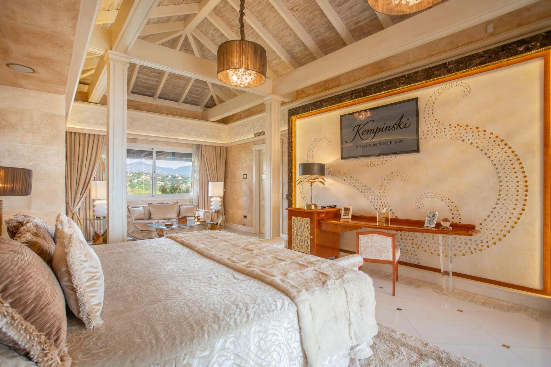 The expansive interior, adorned with refined décor and opulent furnishings, exudes timeless beauty, while floor-to-ceiling windows frame stunning sea views, enhancing the atmosphere with a feeling of serenity.