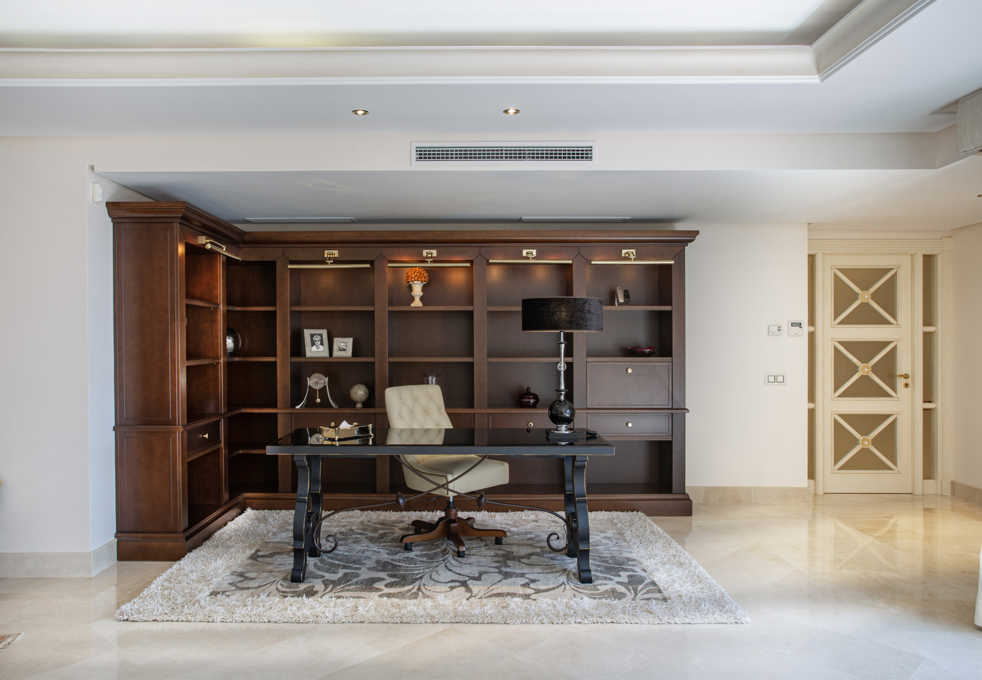 To one side, a richly appointed office provides a perfect blend of style and function.