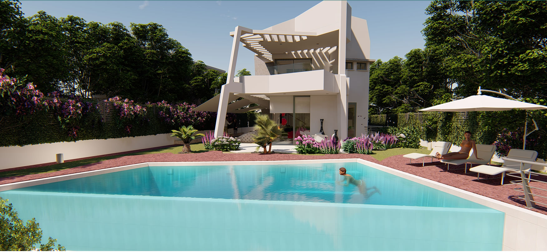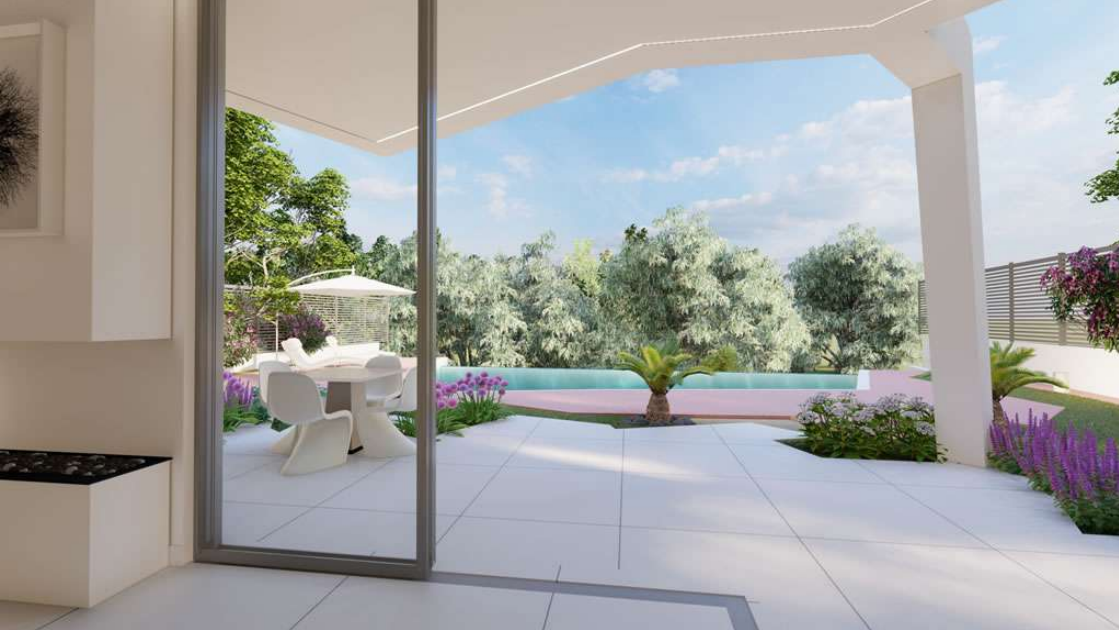 The villa is located on a strategically positioned plot, quiet and bordering a 50,000 m² green area.