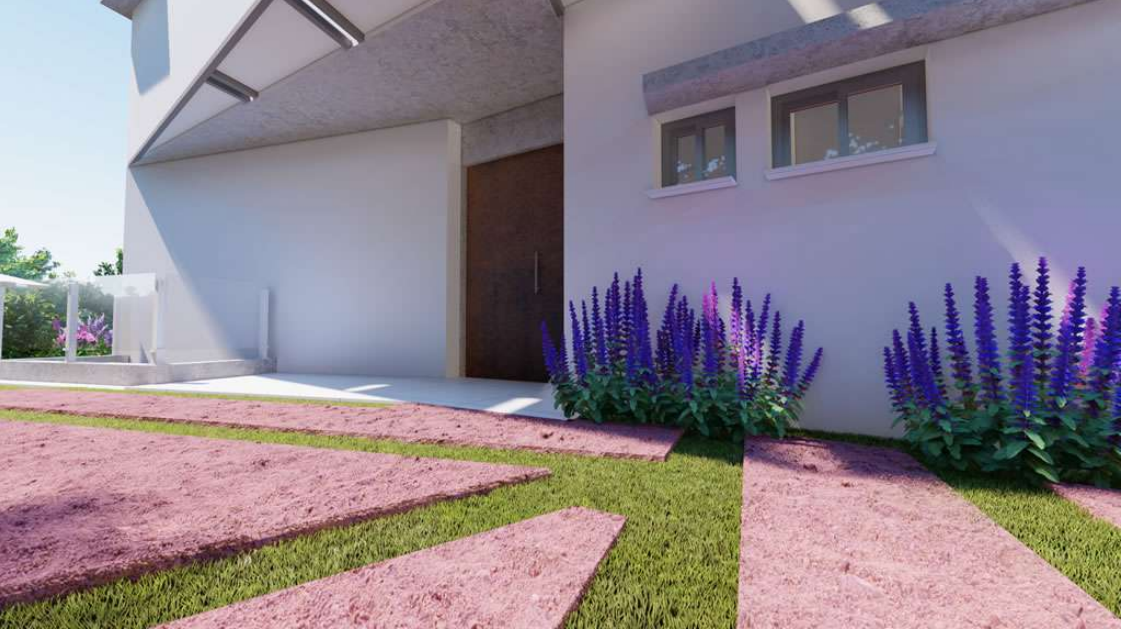 The property is built on a 581 m² rectangular plot and has two separate accesses: one for vehicle entry with parking for two cars, and another pedestrian entrance through a landscaped walkway leading to the house.