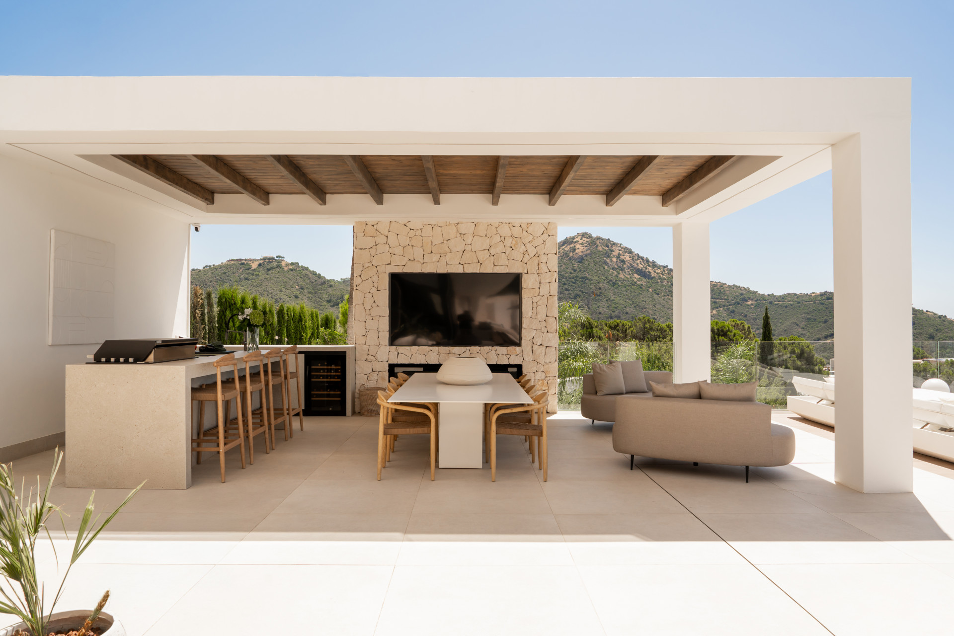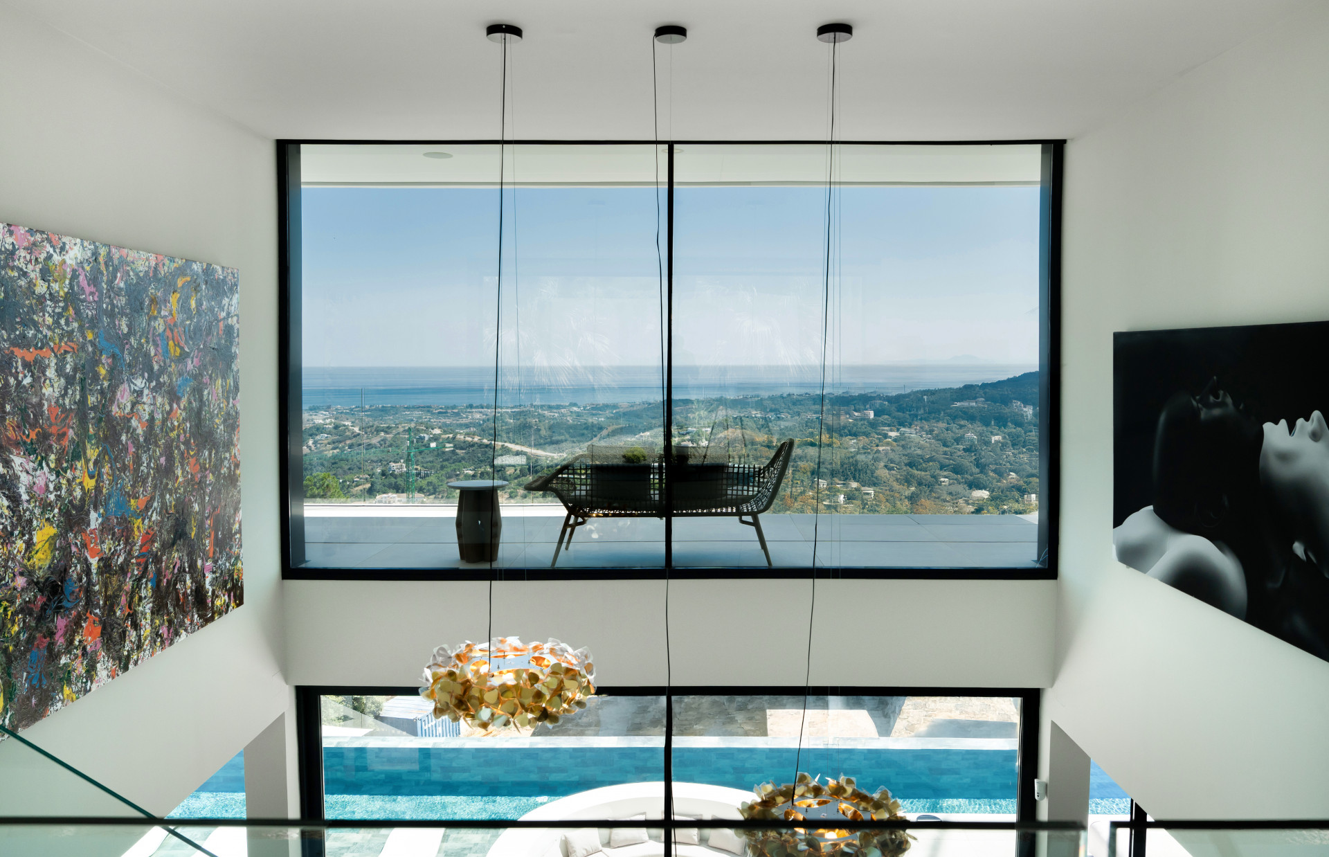 The main living areas include an expansive open-plan kitchen, dining, and lounge space with floor-to-ceiling windows that frame uninterrupted views of the Mediterranean and the surrounding Sierra de las Nieves.
