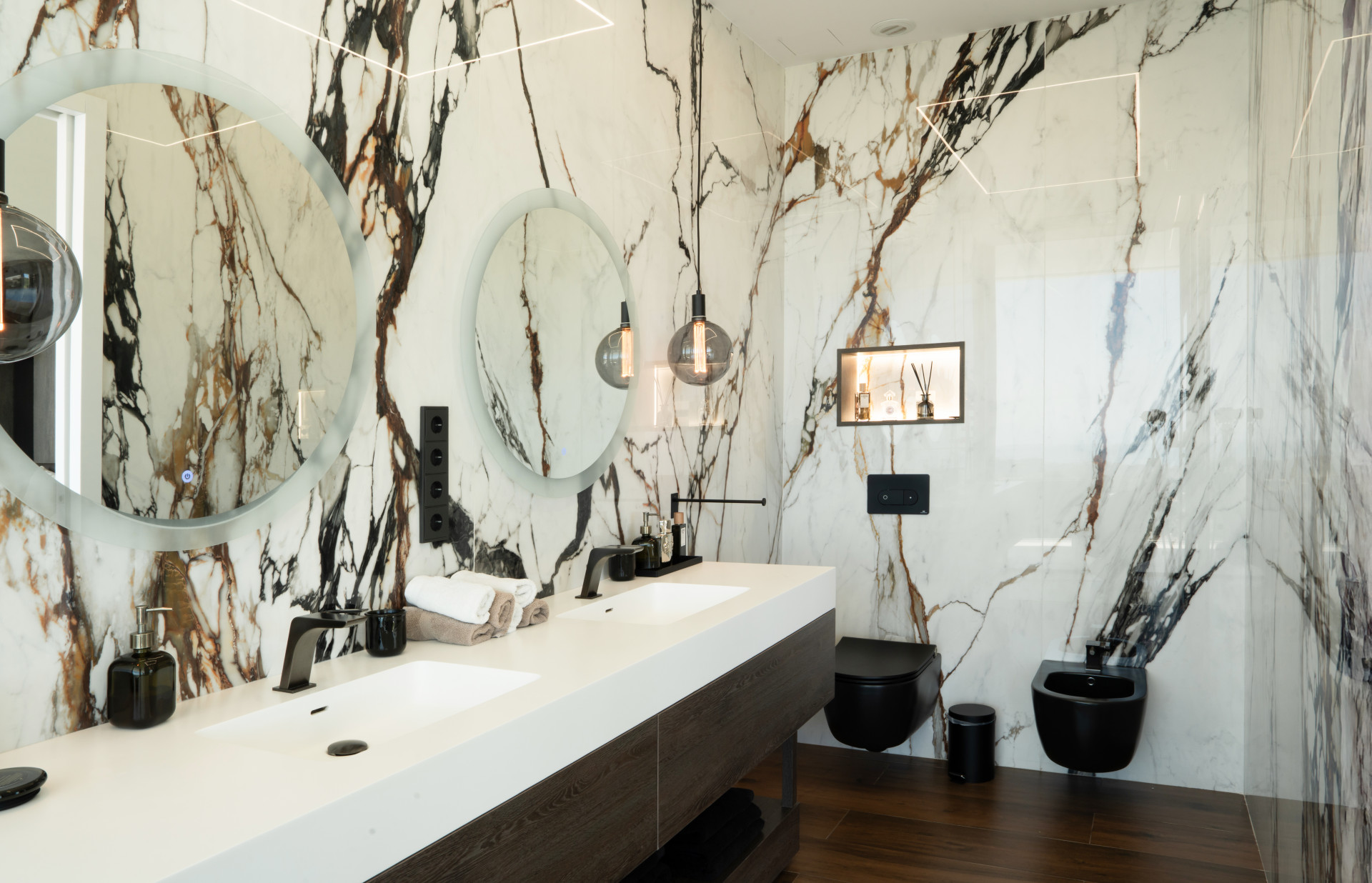 Accommodation includes four large en-suite bedrooms, each with private terraces, high-spec fitted wardrobes, and top-tier finishes. There are five full bathrooms and three additional guest toilets distributed across the home for convenience.