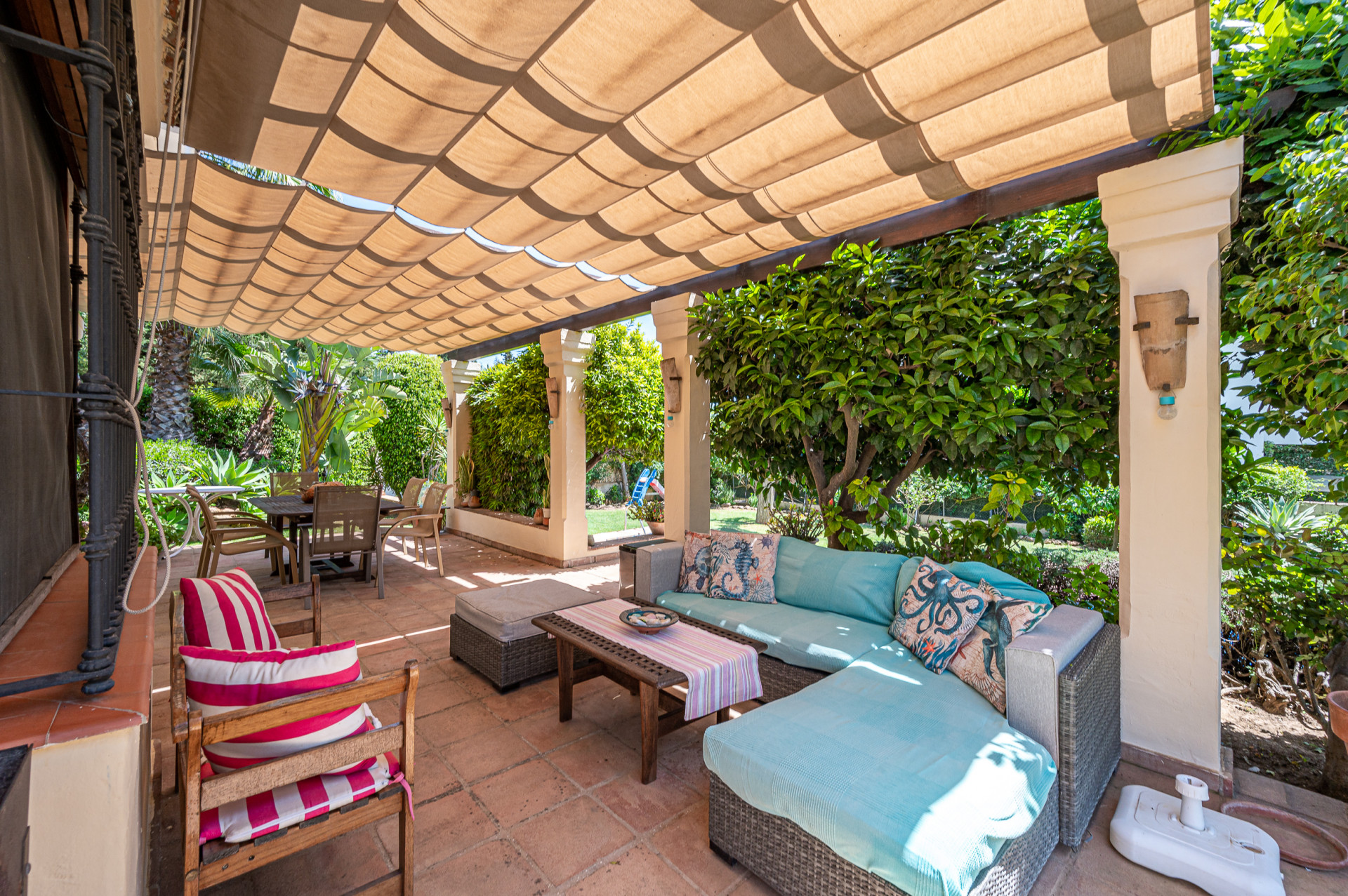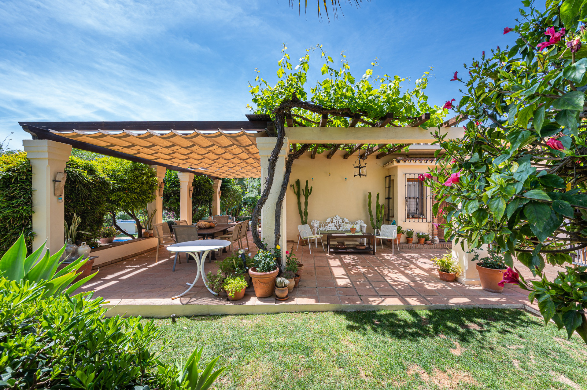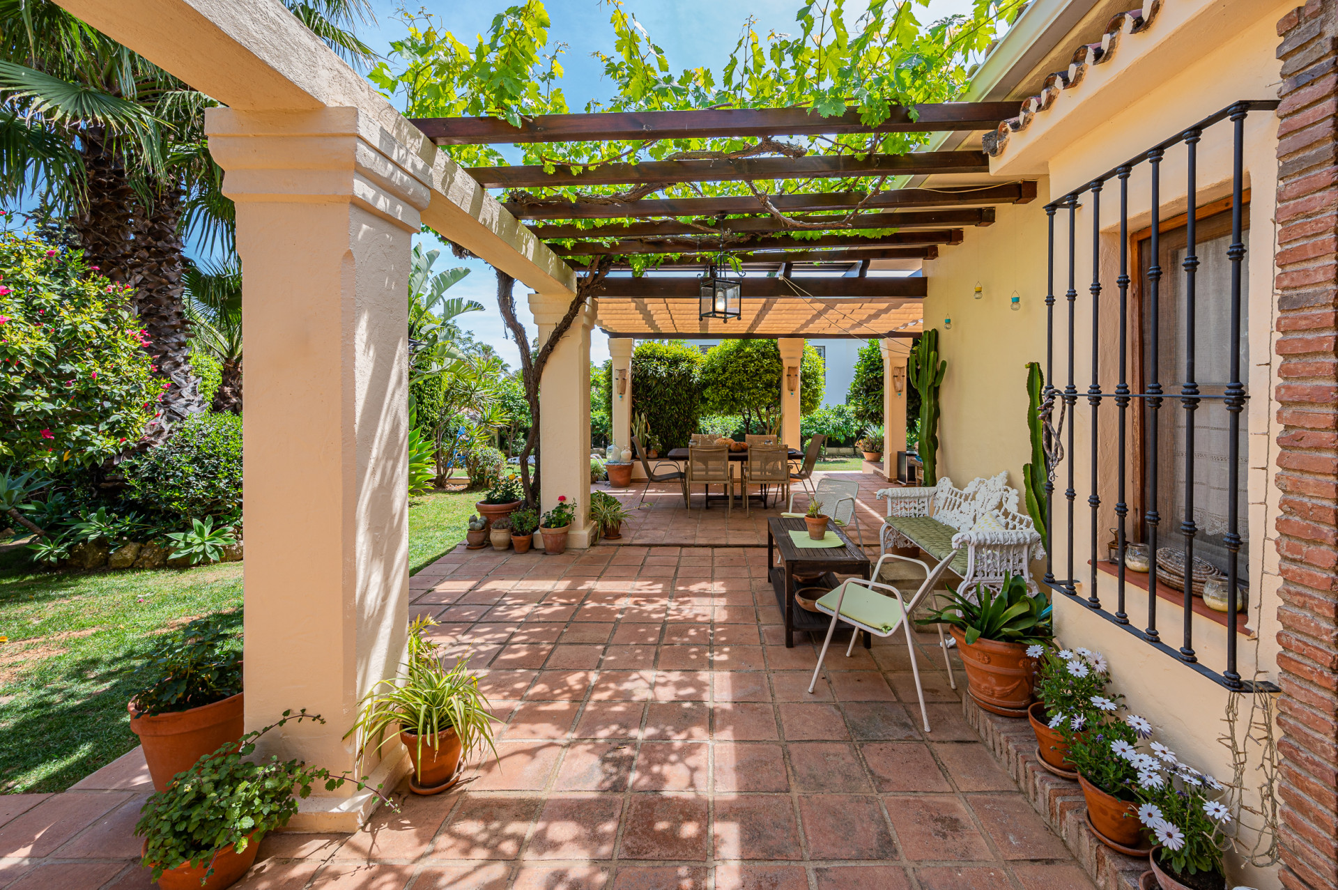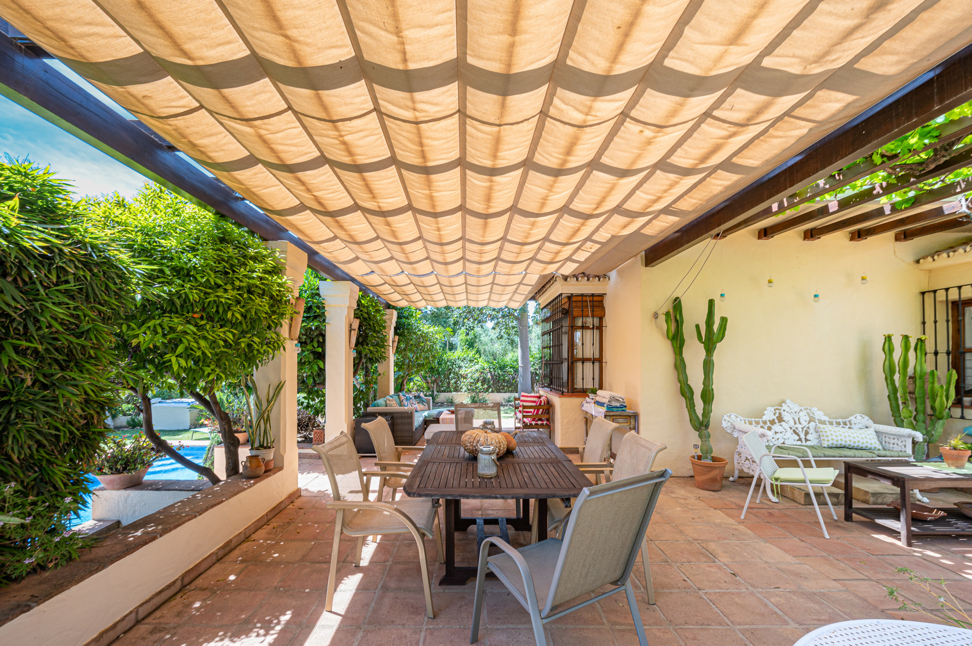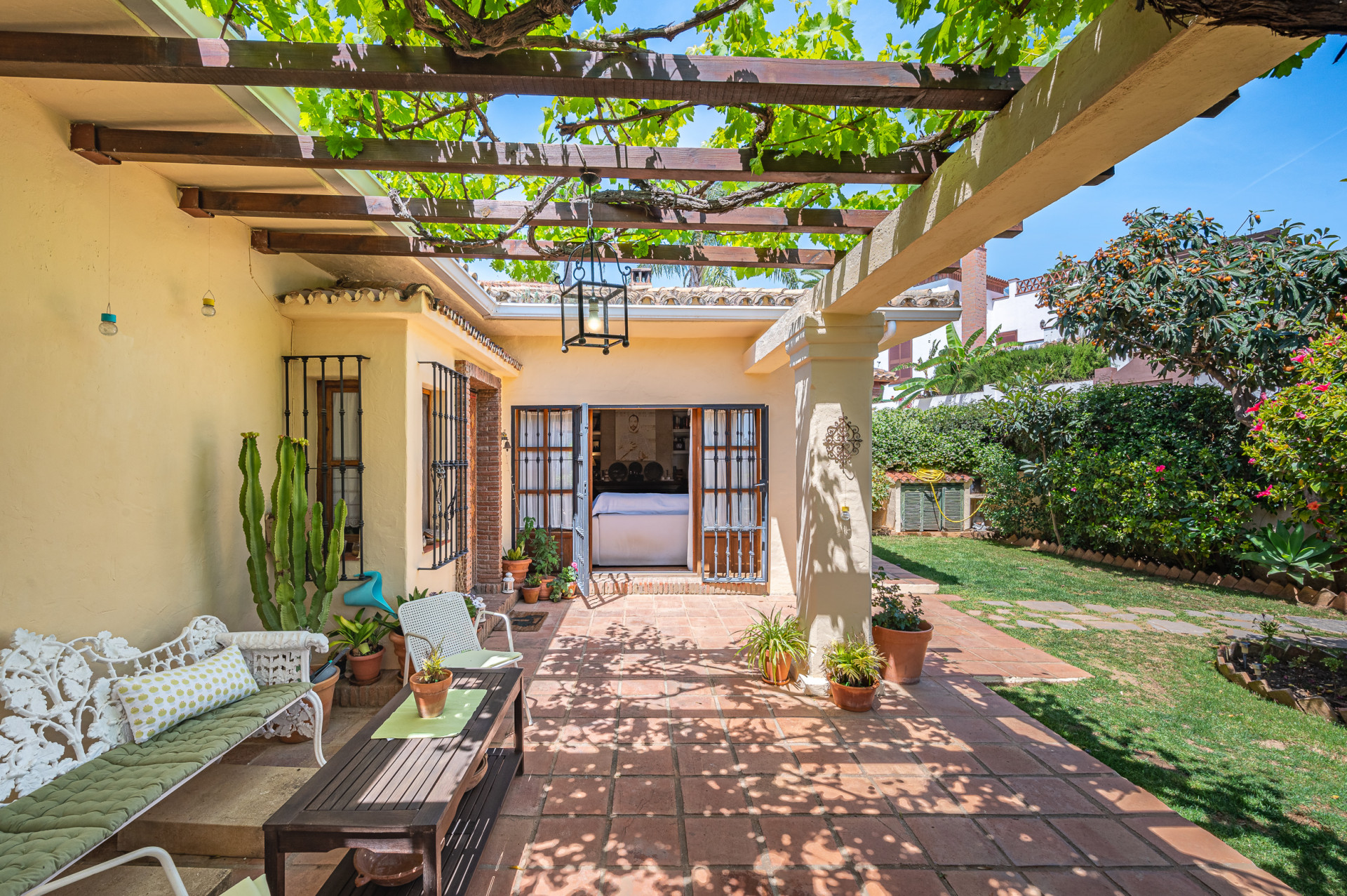 From the living room, direct access leads to a sun-drenched covered porch, perfect for enjoying both winter sunshine and summer evenings. This delightful outdoor space retains its original terracotta flooring and is shaded by a wooden pergola adorned with a mature vine, overlooking the lush landscaped garden and swimming pool, all perfectly integrated with the villa’s Mediterranean style.