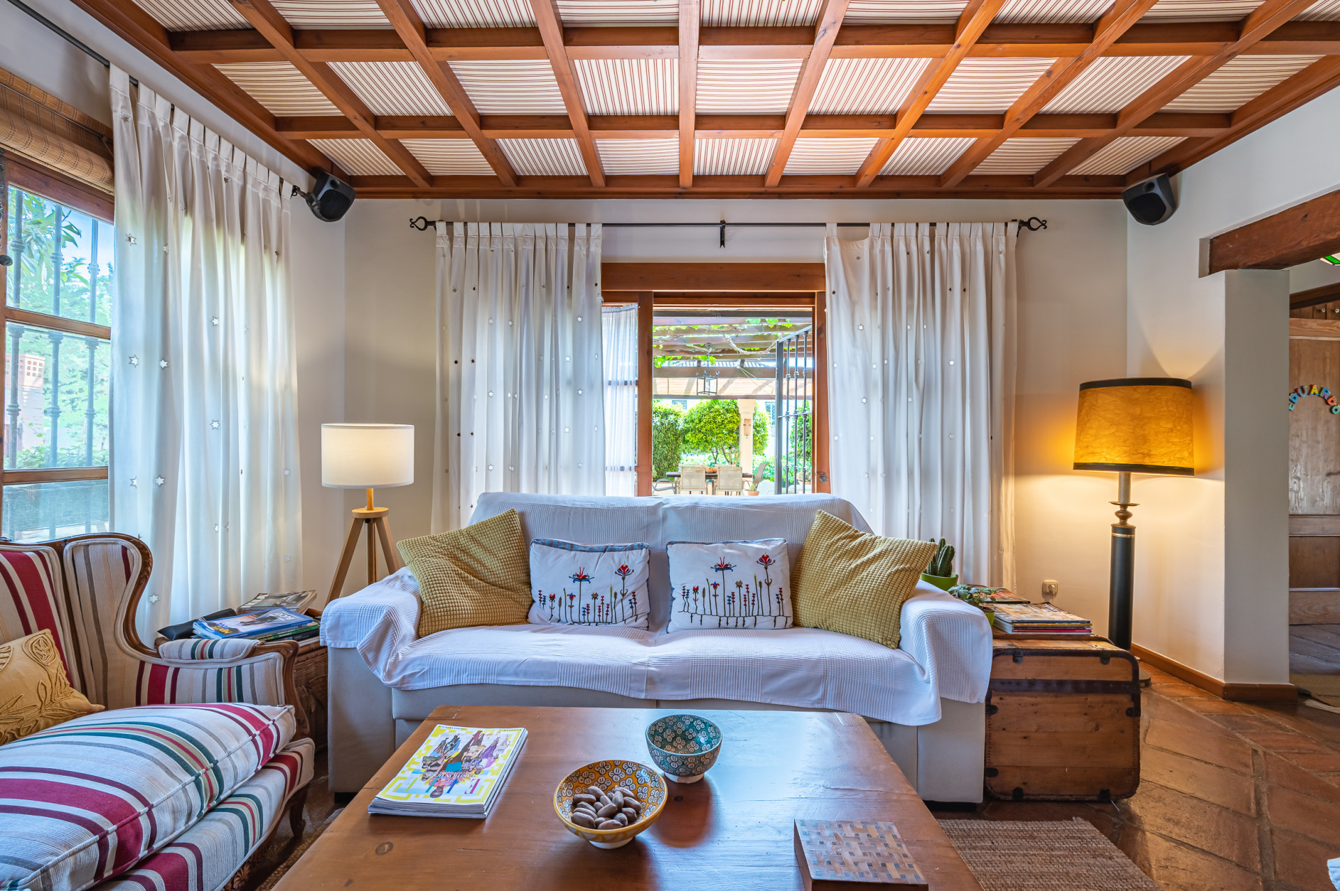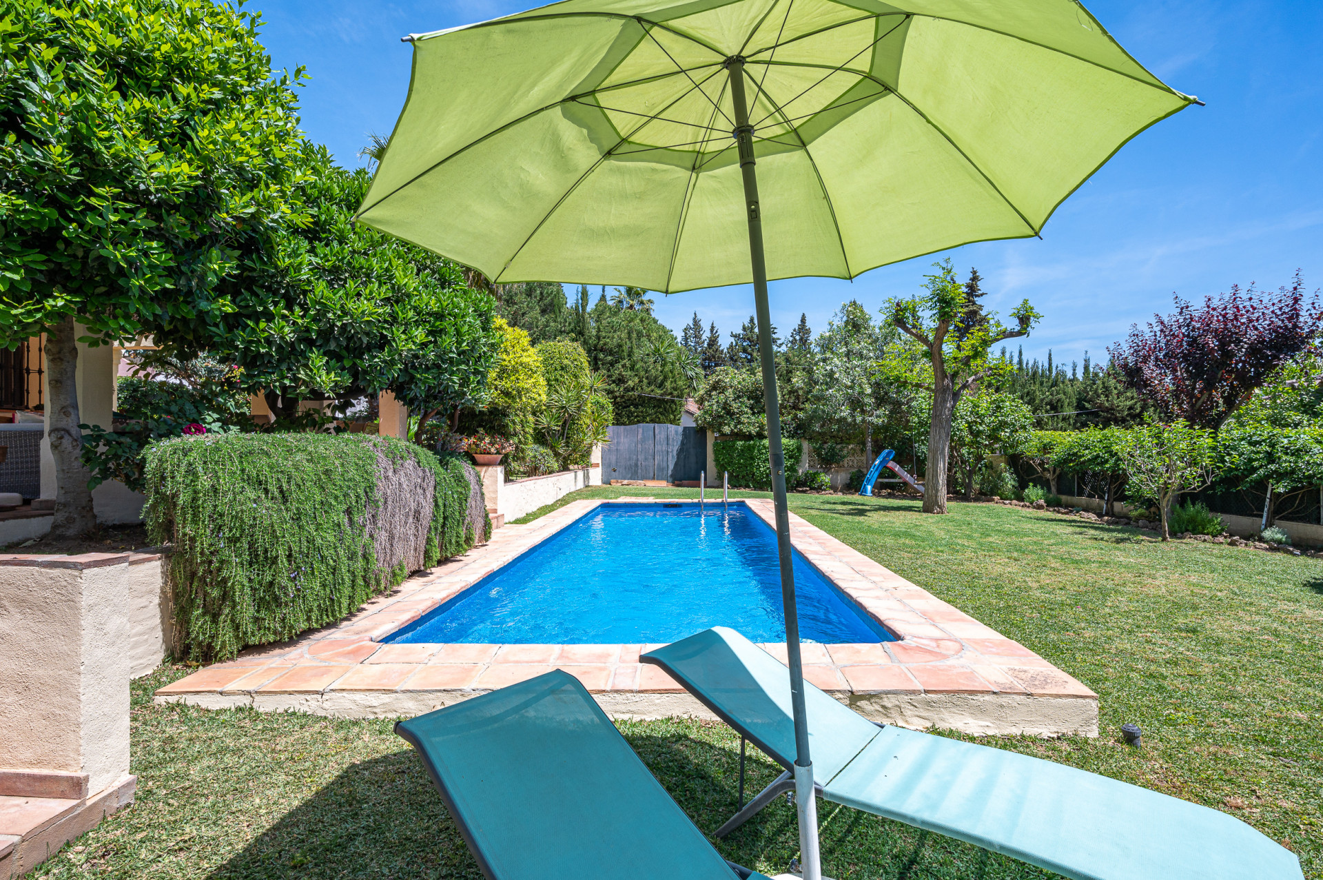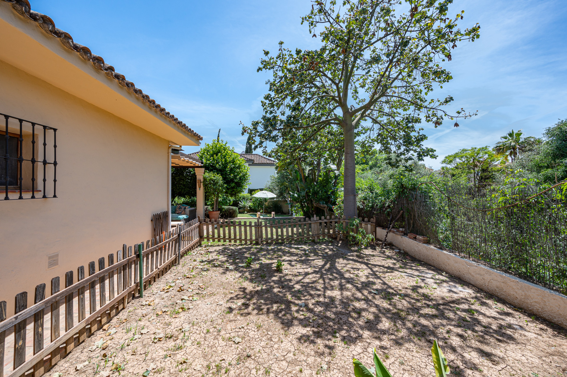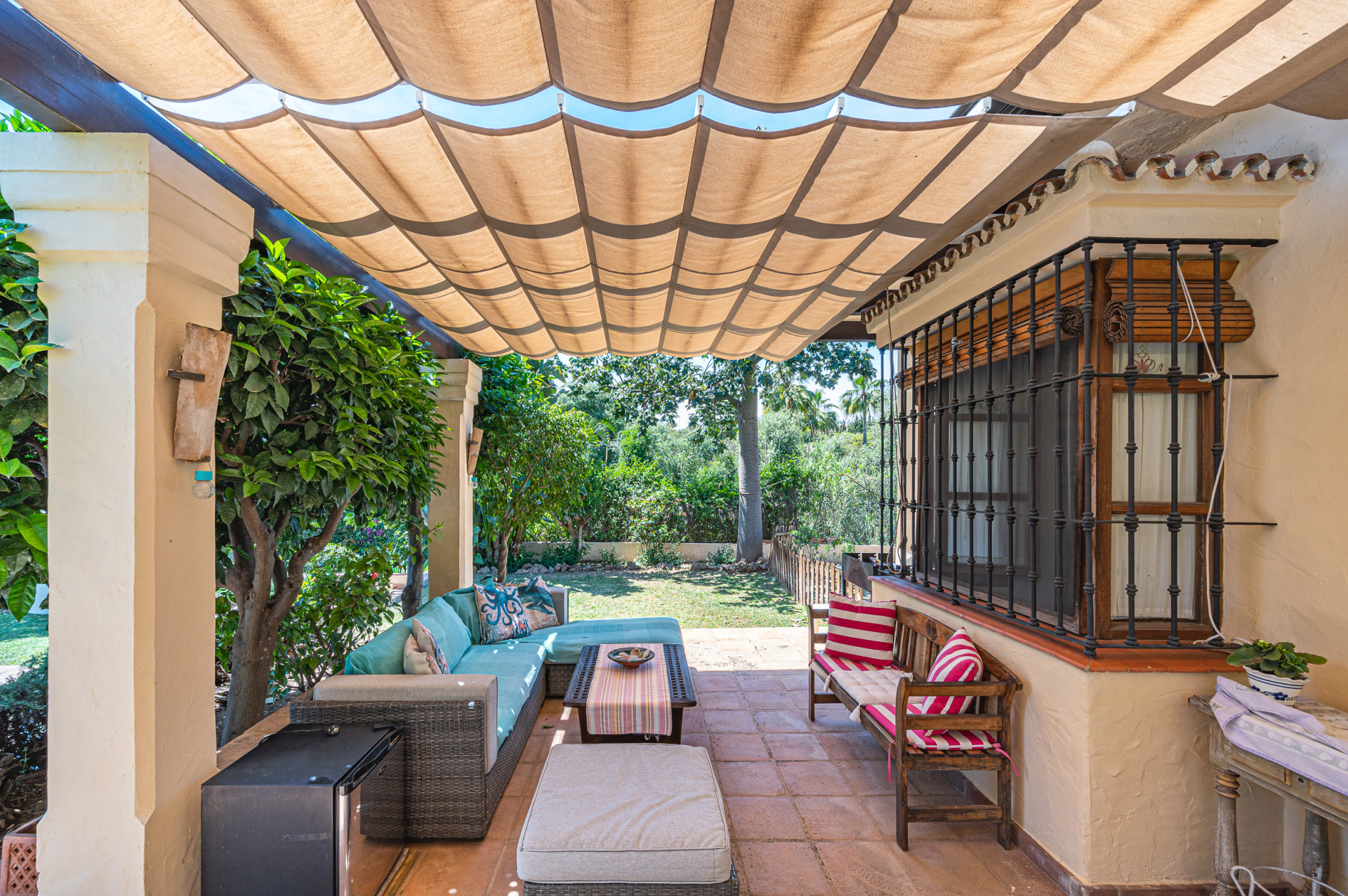From the living room, direct access leads to a sun-drenched covered porch, perfect for enjoying both winter sunshine and summer evenings. This delightful outdoor space retains its original terracotta flooring and is shaded by a wooden pergola adorned with a mature vine, overlooking the lush landscaped garden and swimming pool, all perfectly integrated with the villa’s Mediterranean style.