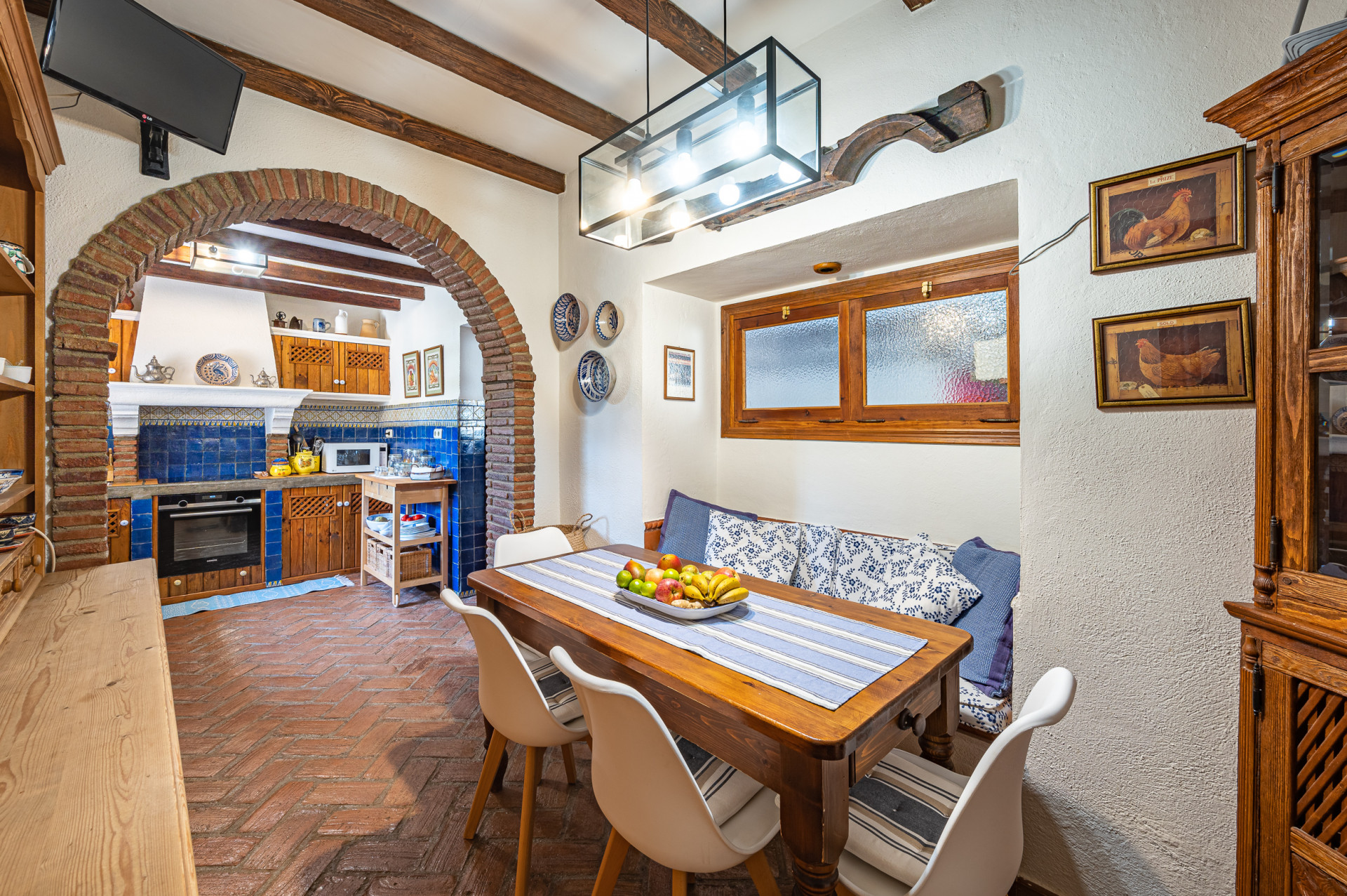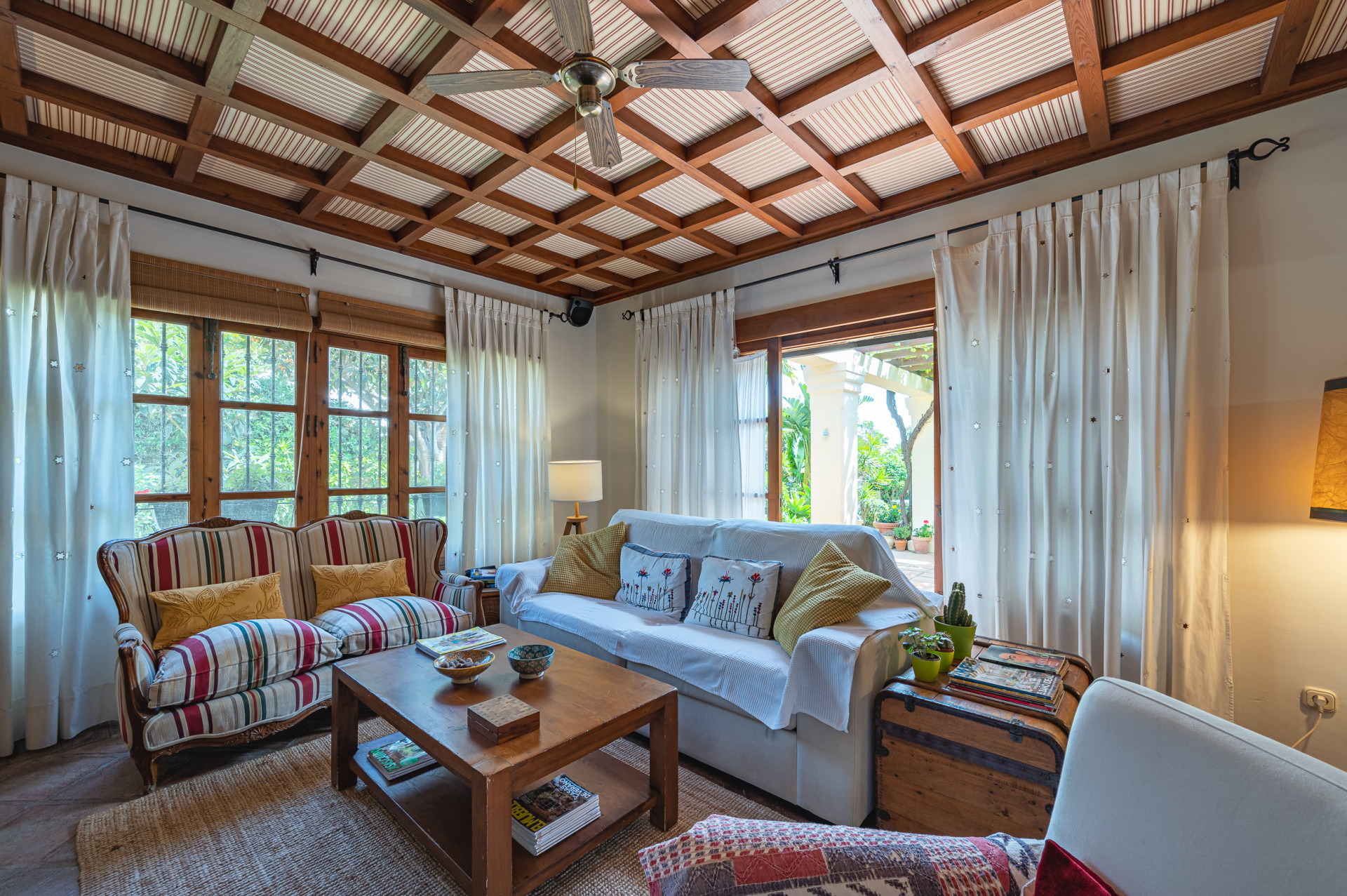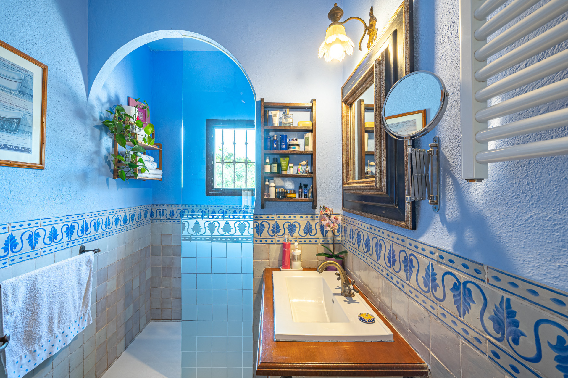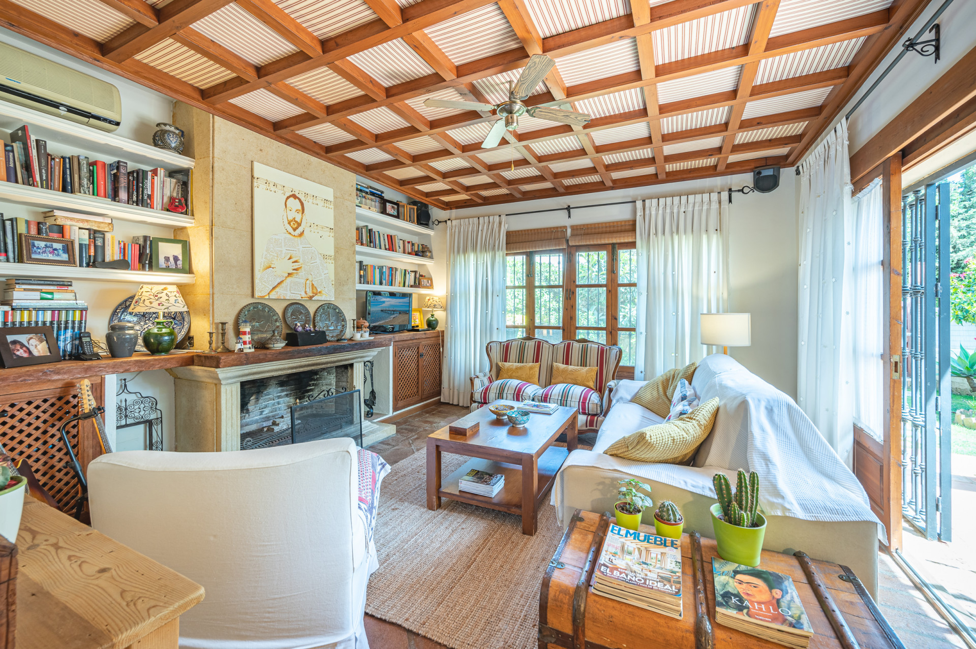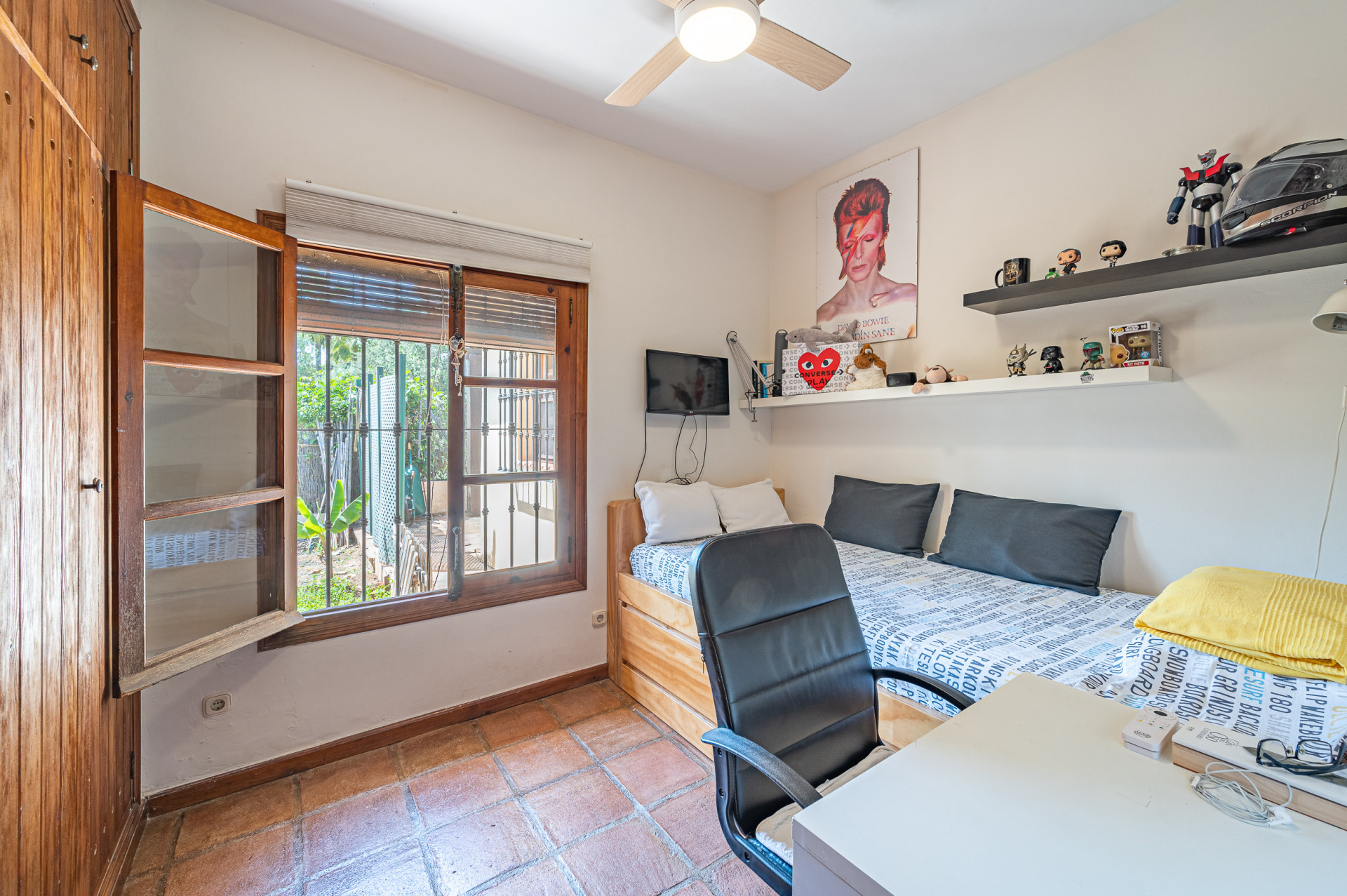 From the living room, direct access leads to a sun-drenched covered porch, perfect for enjoying both winter sunshine and summer evenings. This delightful outdoor space retains its original terracotta flooring and is shaded by a wooden pergola adorned with a mature vine, overlooking the lush landscaped garden and swimming pool, all perfectly integrated with the villa’s Mediterranean style.