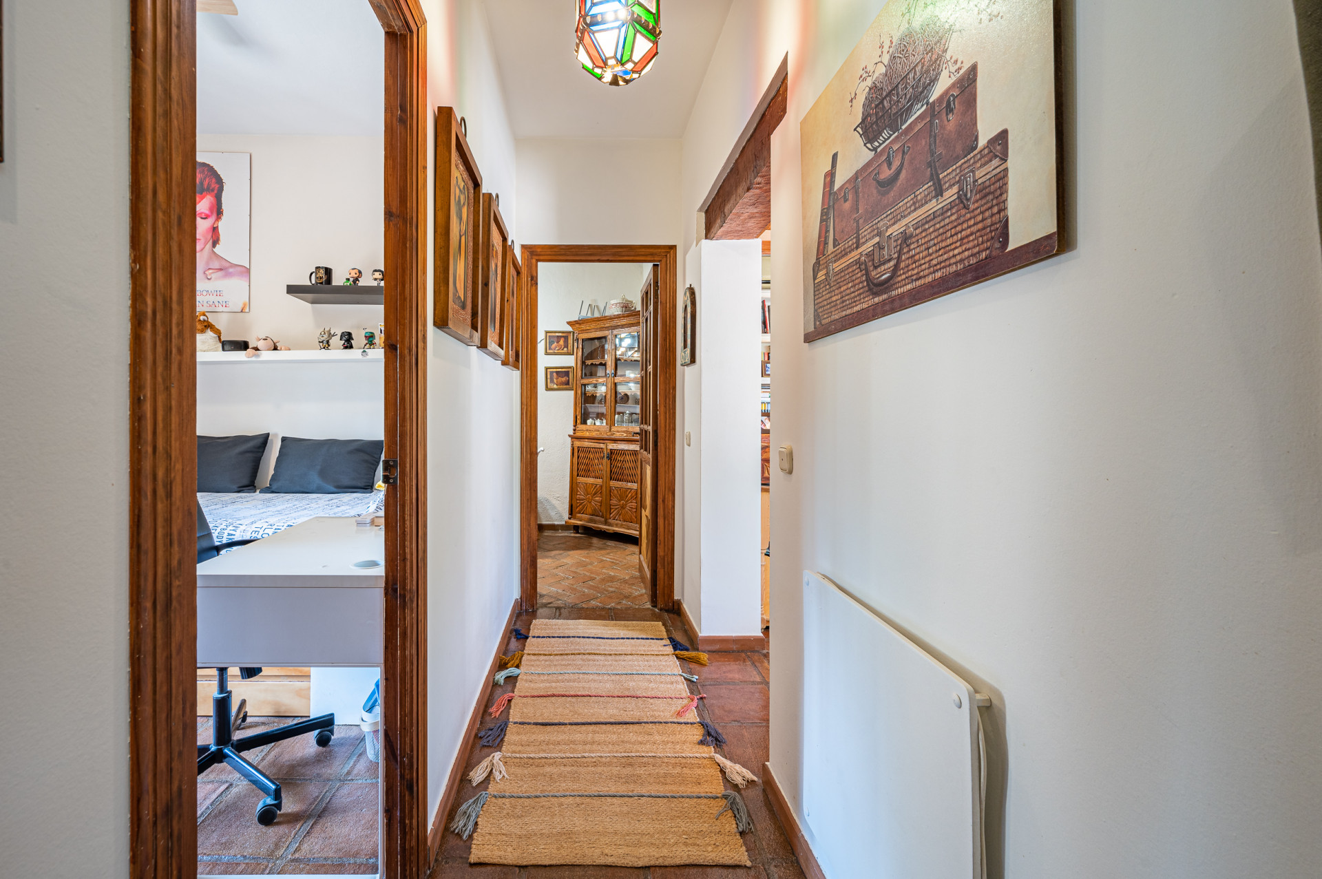 The sleeping area comprises two spacious bedrooms with fitted wardrobes, a full exterior bathroom, and a third room currently used as a study/home office with additional storage space, easily convertible into an extra bedroom if desired.