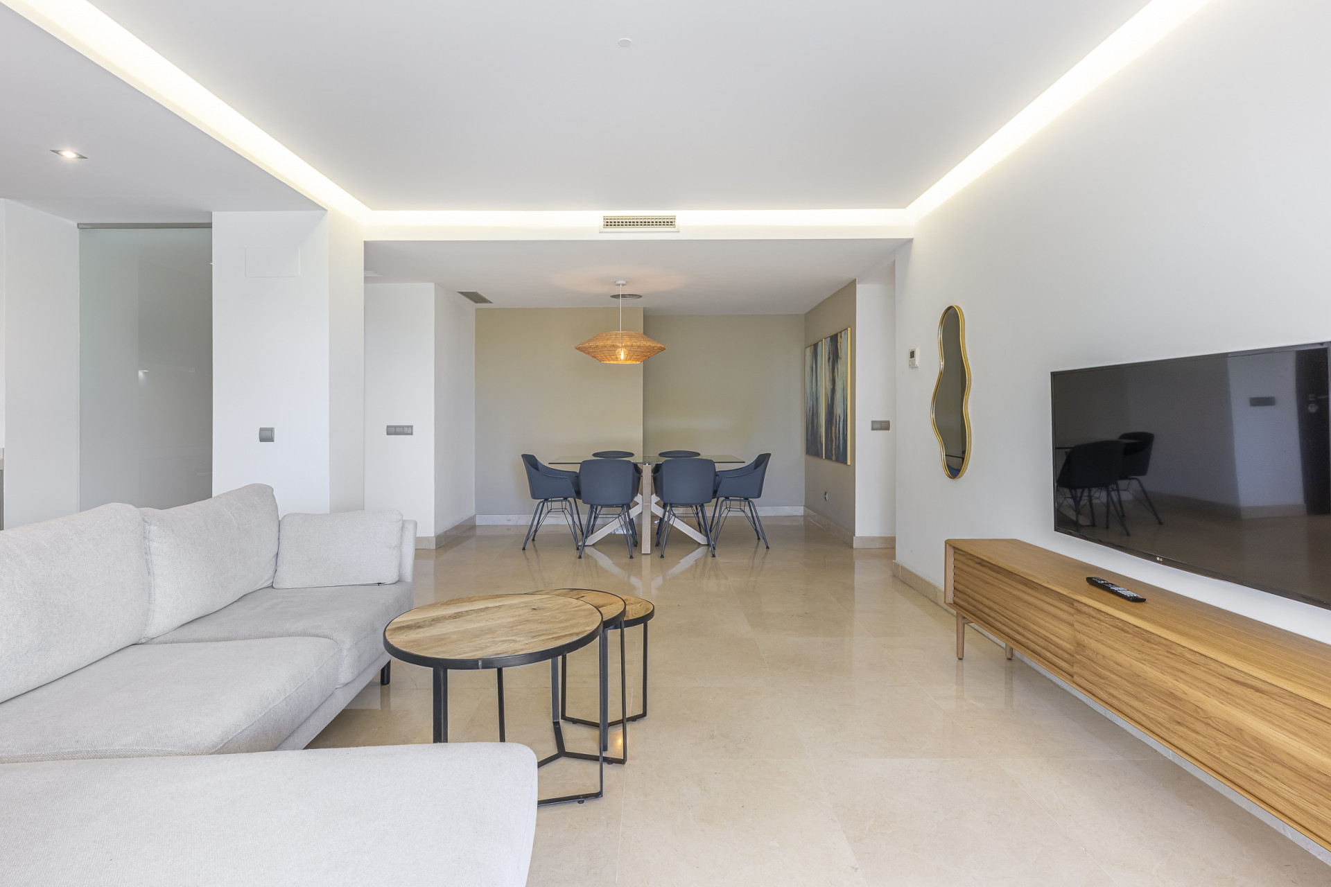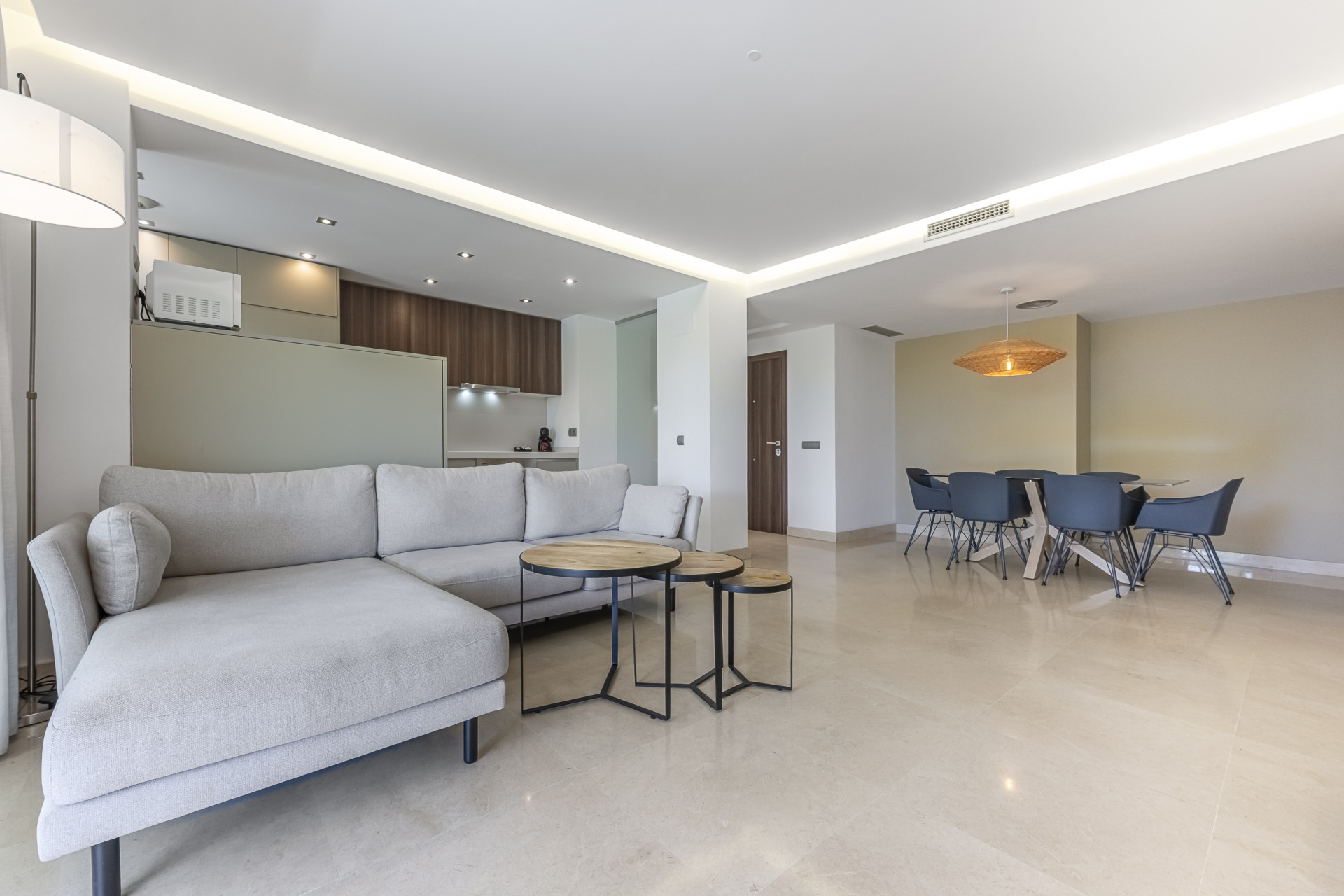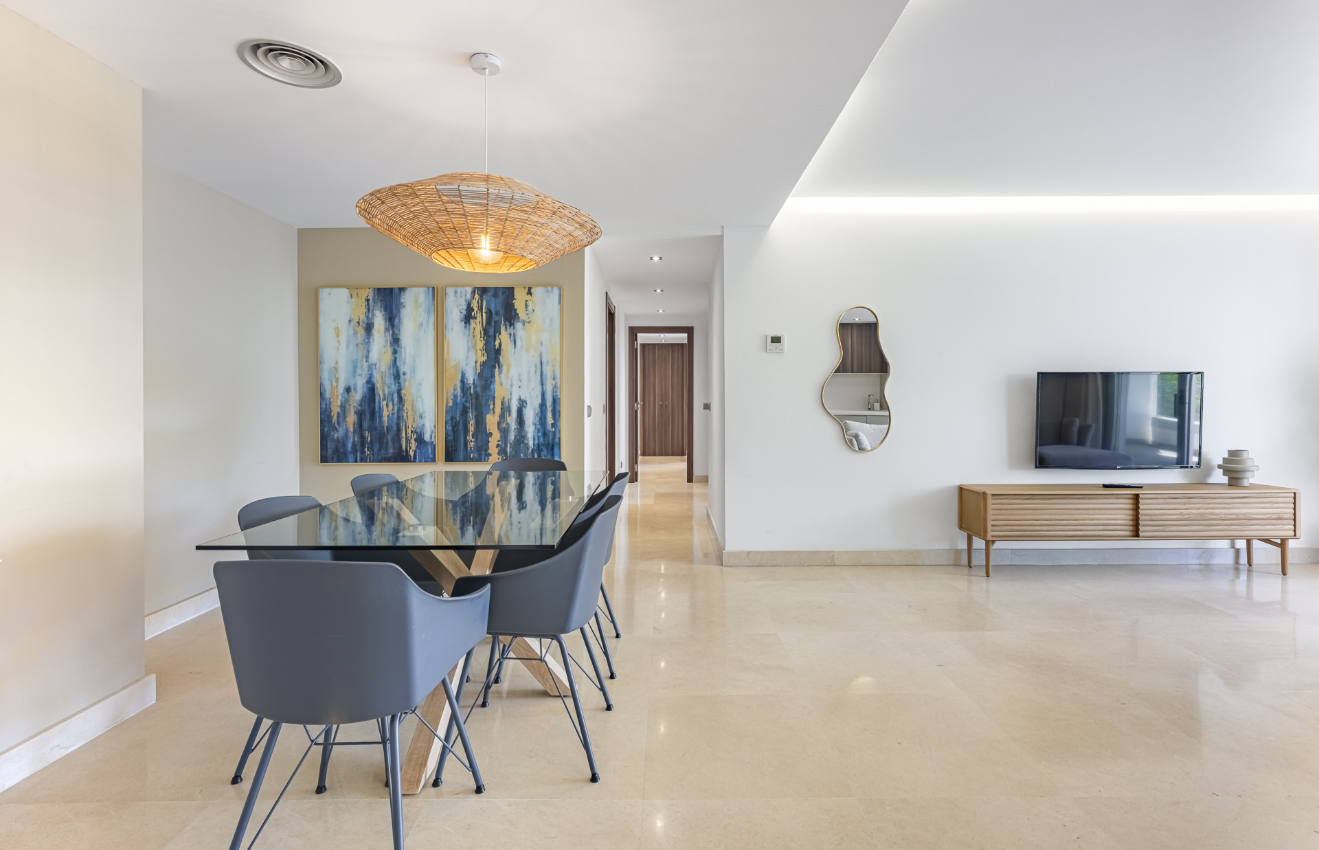 The flat has been designed in a contemporary style that combines functionality and aesthetics, offering a comfortable and bright layout. Its generously sized main living room integrates the dining and sitting areas in an open and welcoming atmosphere.