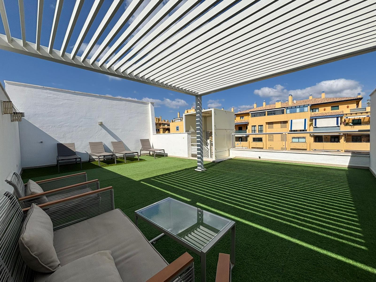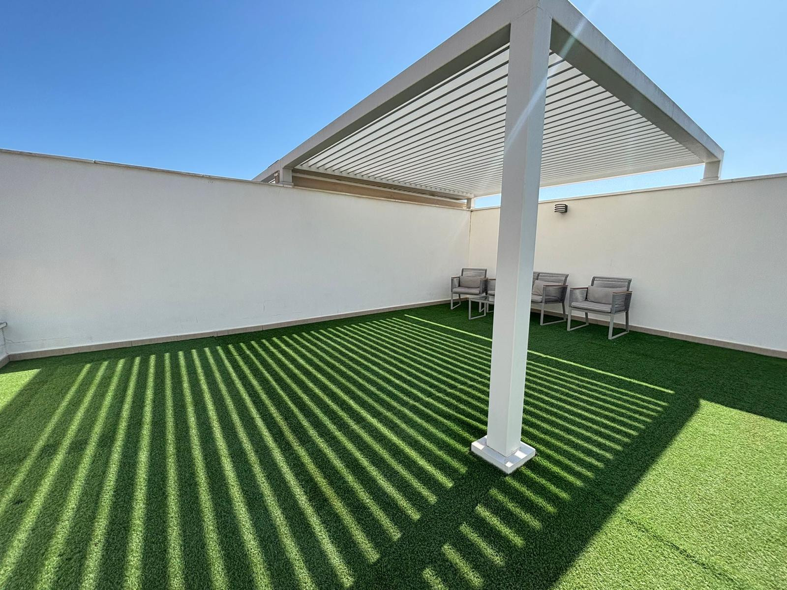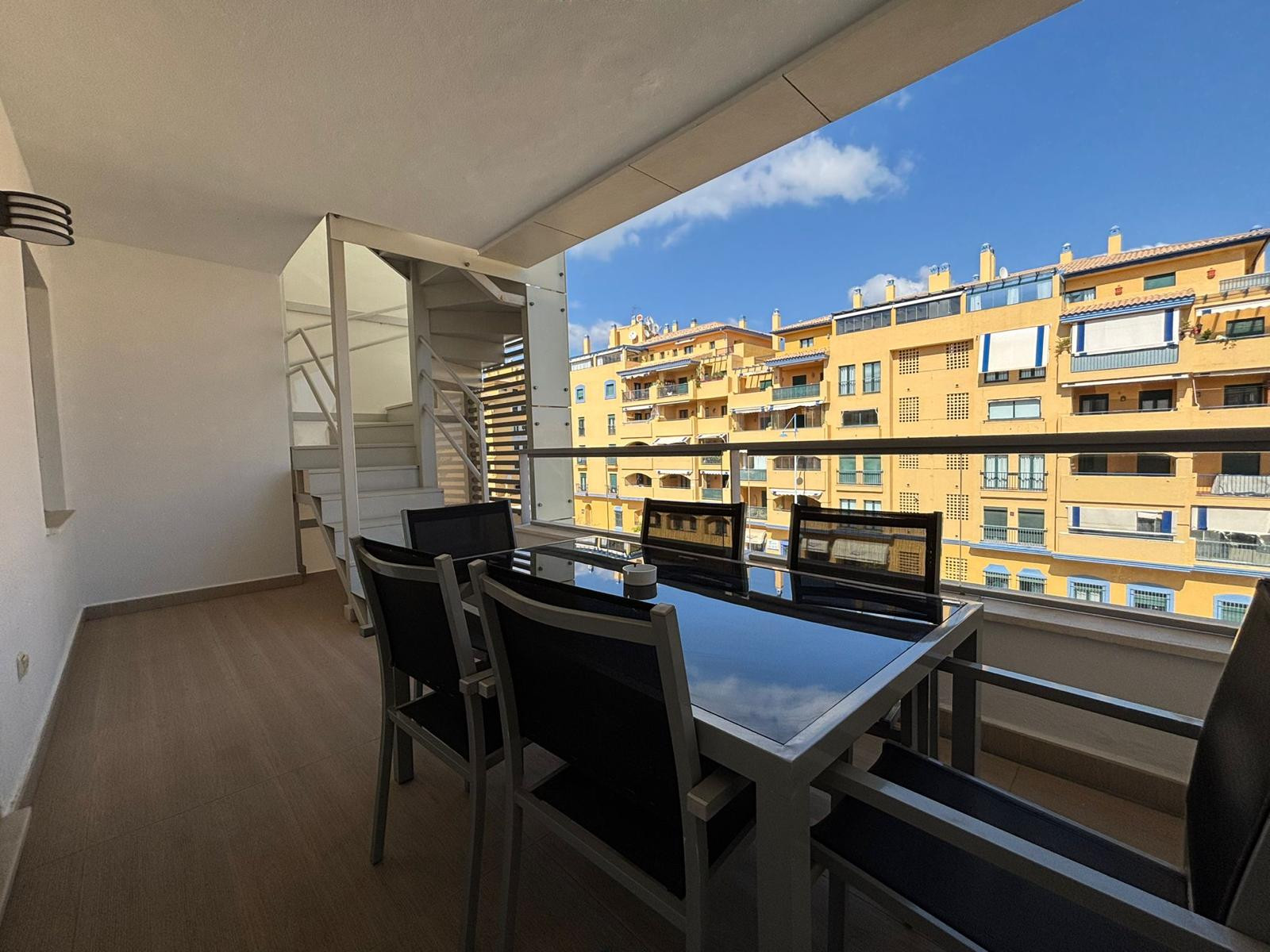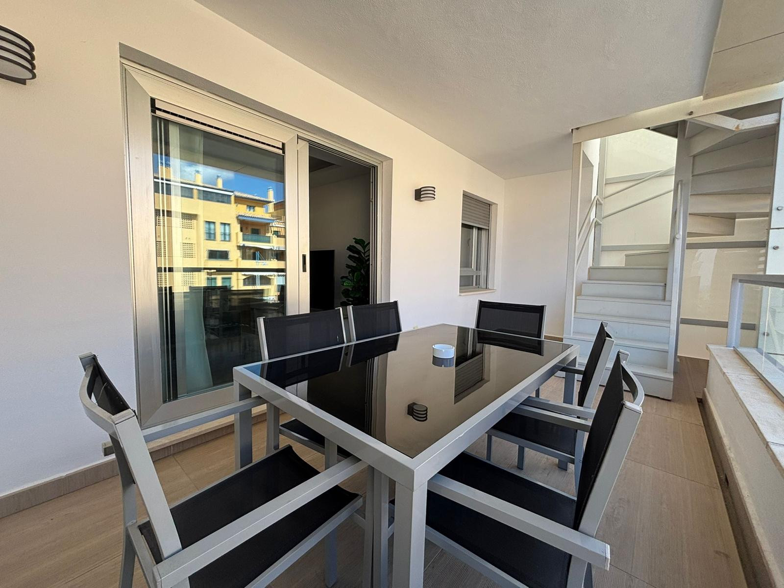 This elegant duplex penthouse features a well-designed and functional layout. On the main floor, a bright and spacious living room opens directly onto a lovely terrace with open views and partial sea views. The kitchen, integrated yet subtly separate, is fully equipped with high-end appliances, adding both style and practicality. The master bedroom includes an en-suite bathroom and built-in wardrobes, while a guest bedroom with two single beds and a separate bathroom complete this level.