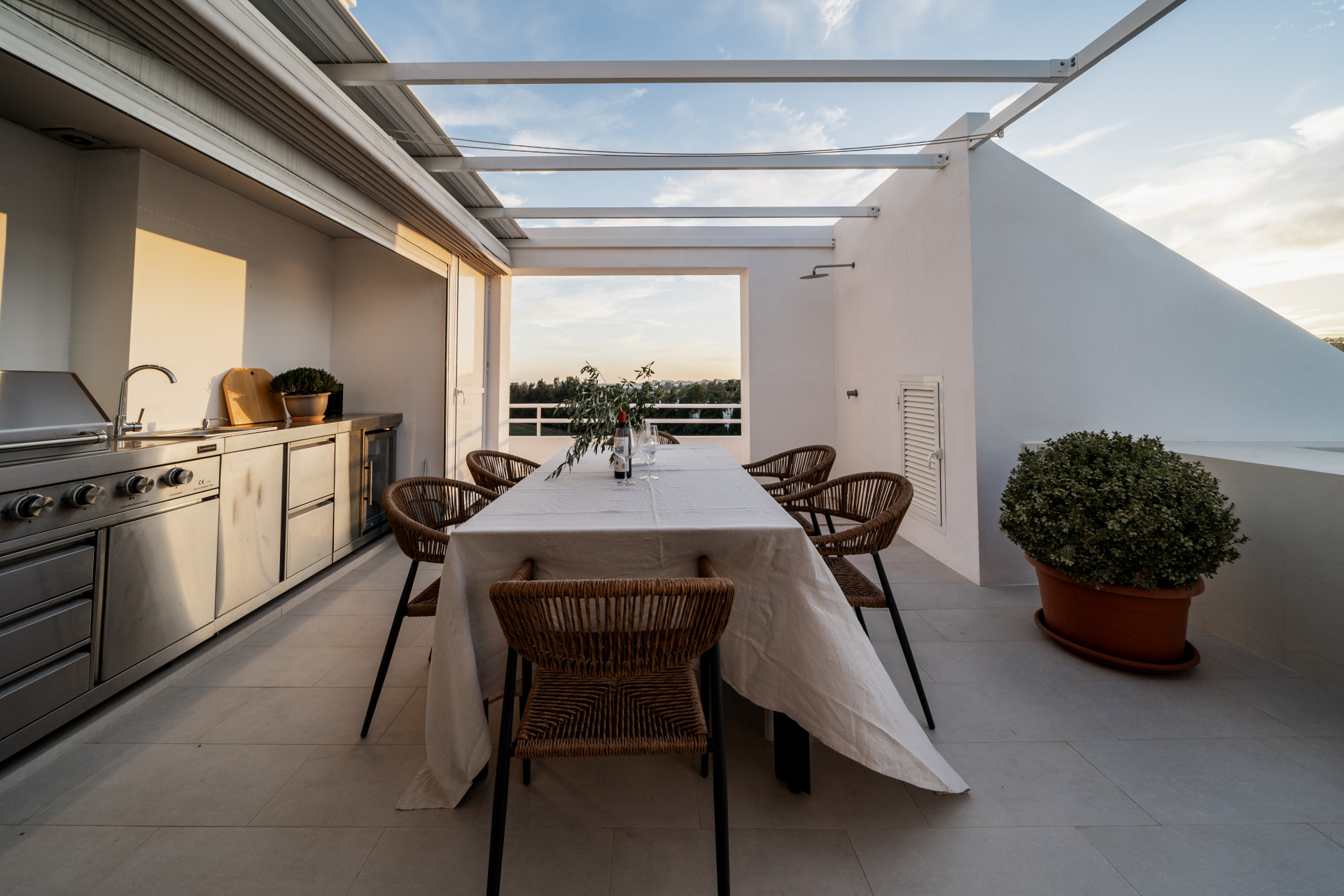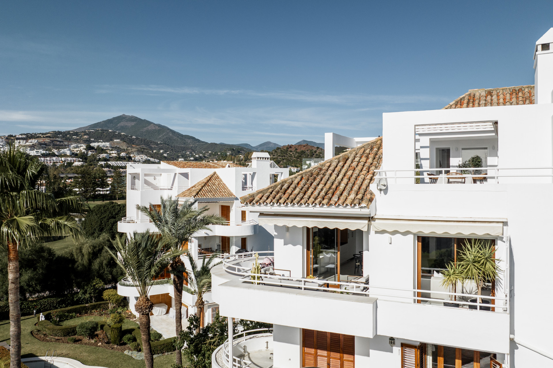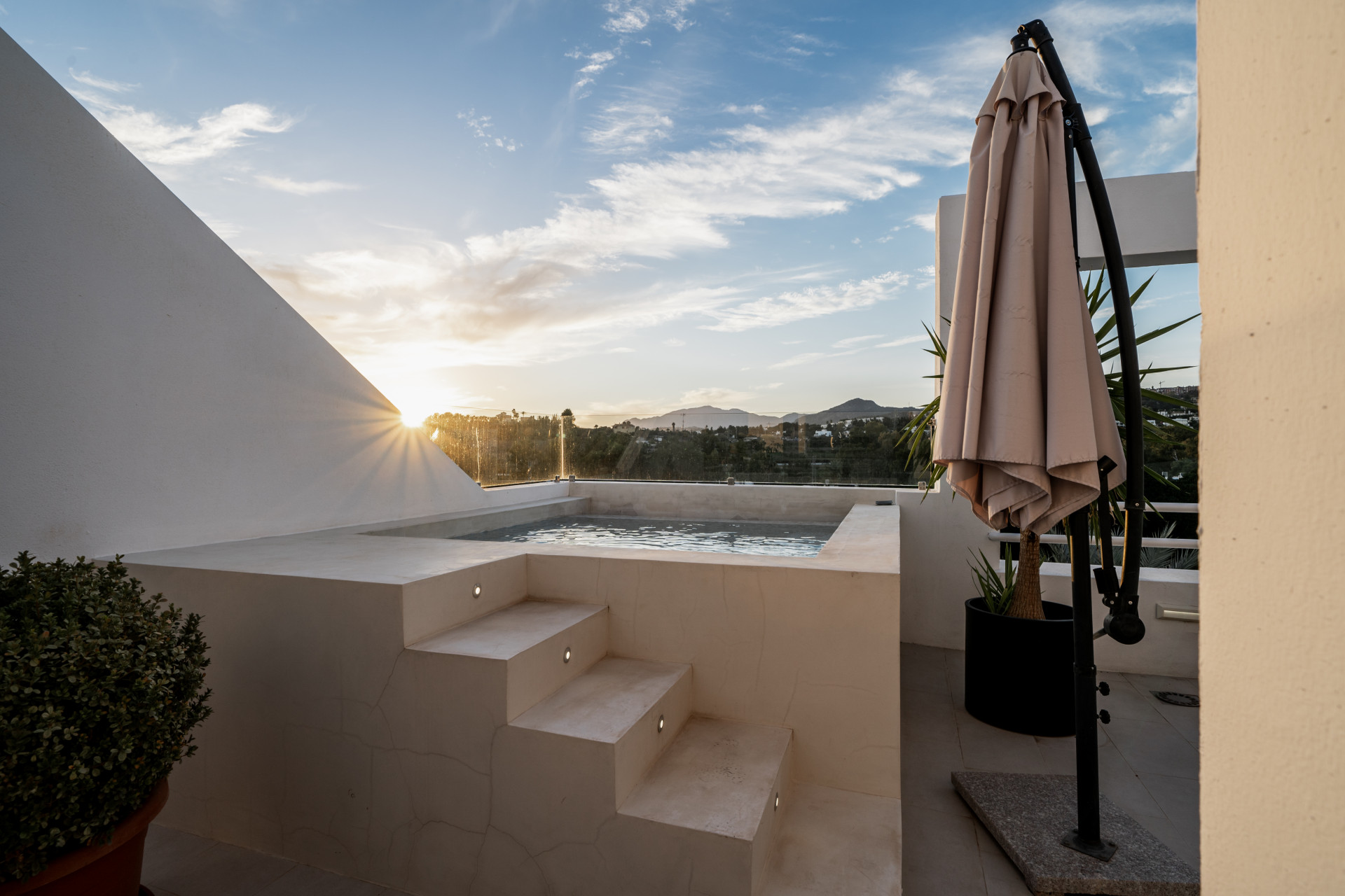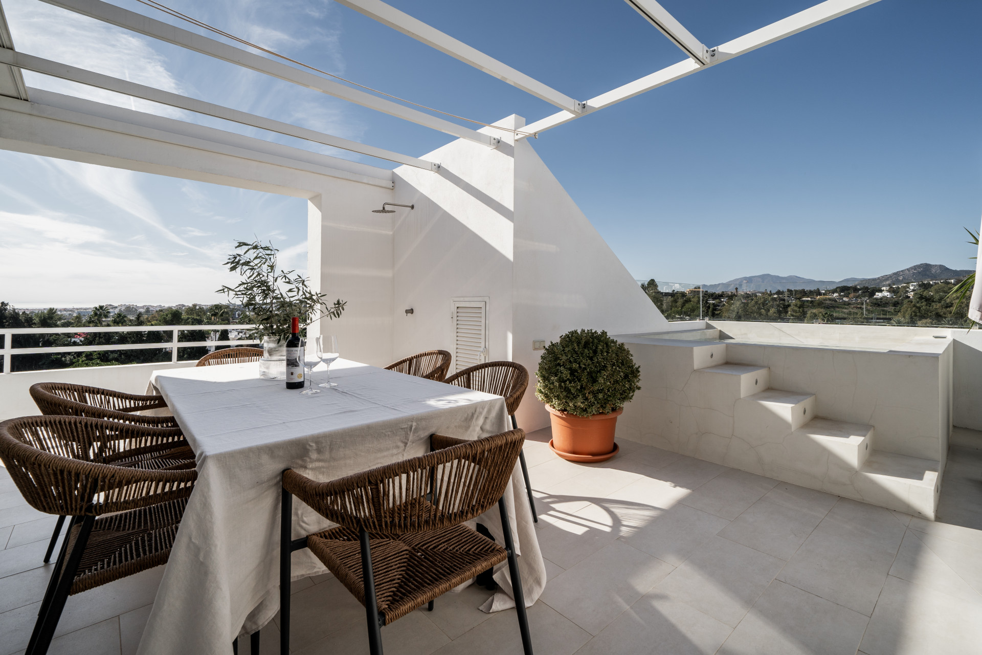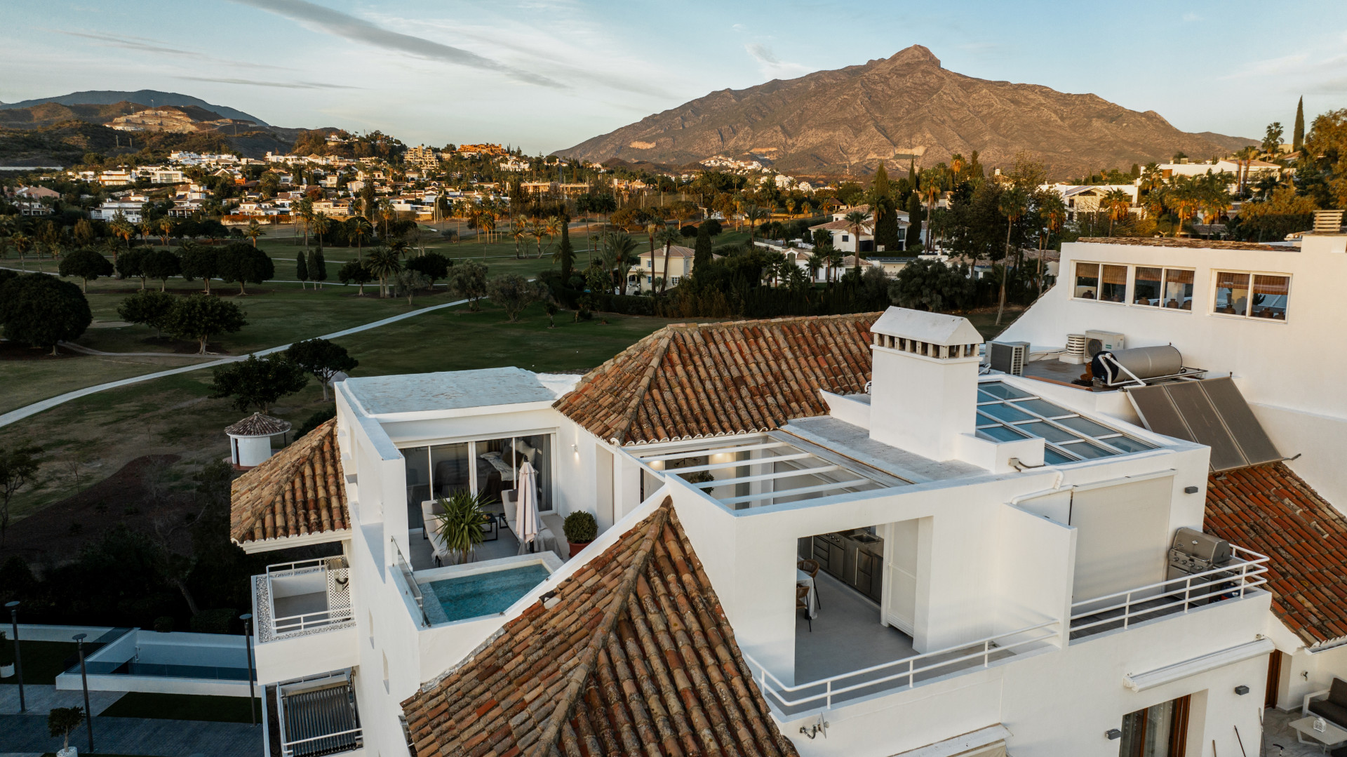 This bright 3 bedroom penthouse has breathtaking sea, mountain and golf views with a large rooftop terrace with a private plunge pool and outdoor