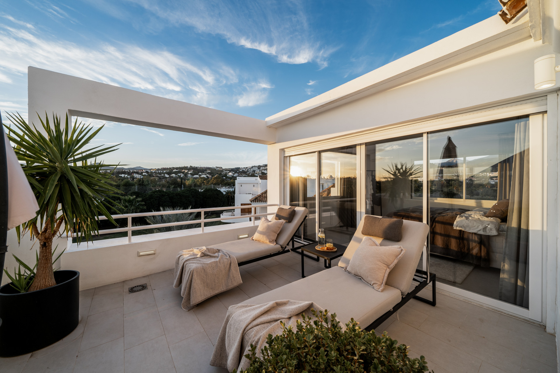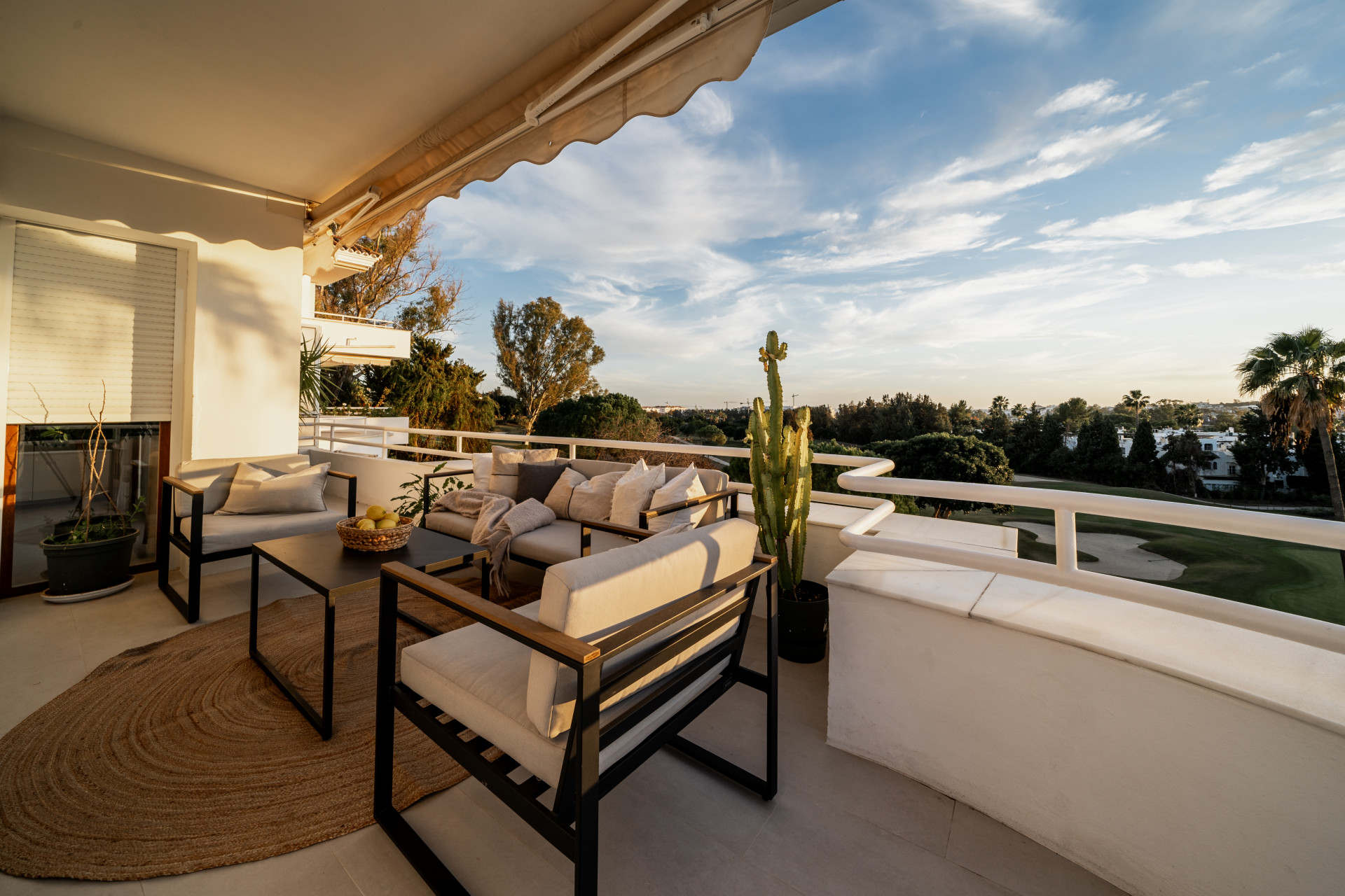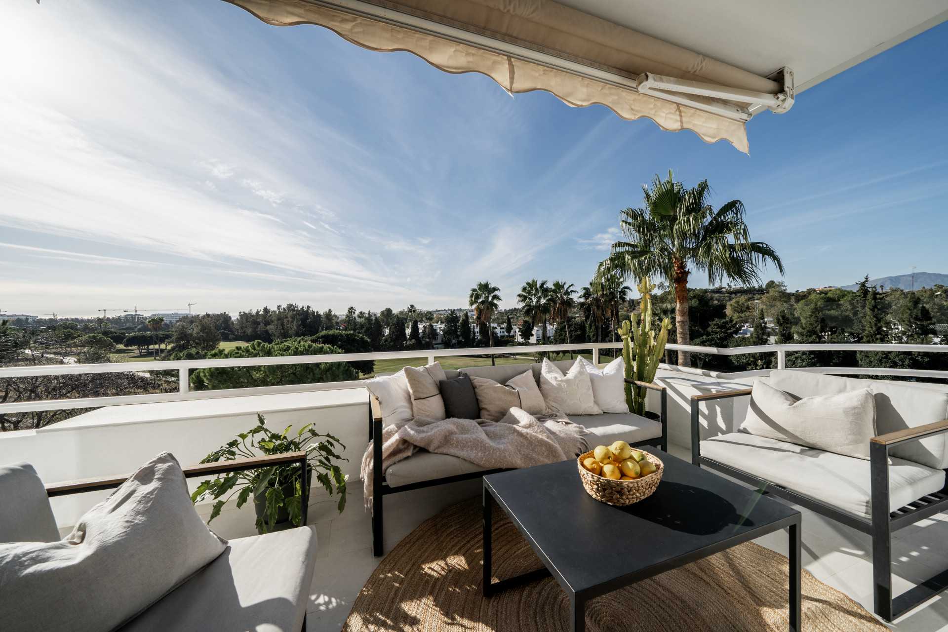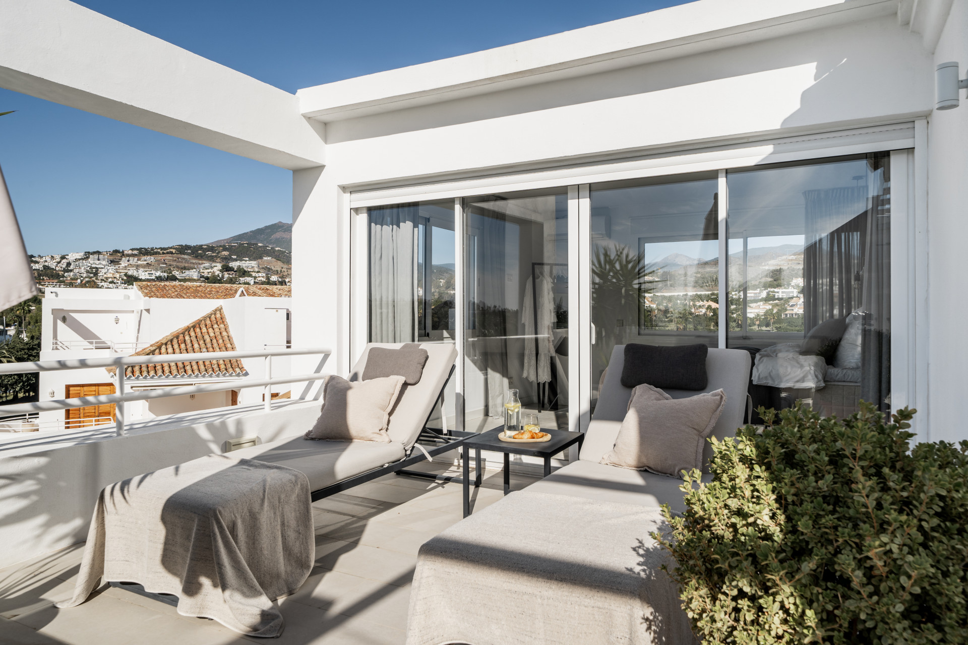 You have direct access out to the terrace with a nice coffee table, perfect to enjoy your breakfast and the beautiful views over the Los Naranjos Golf Club and the sea.