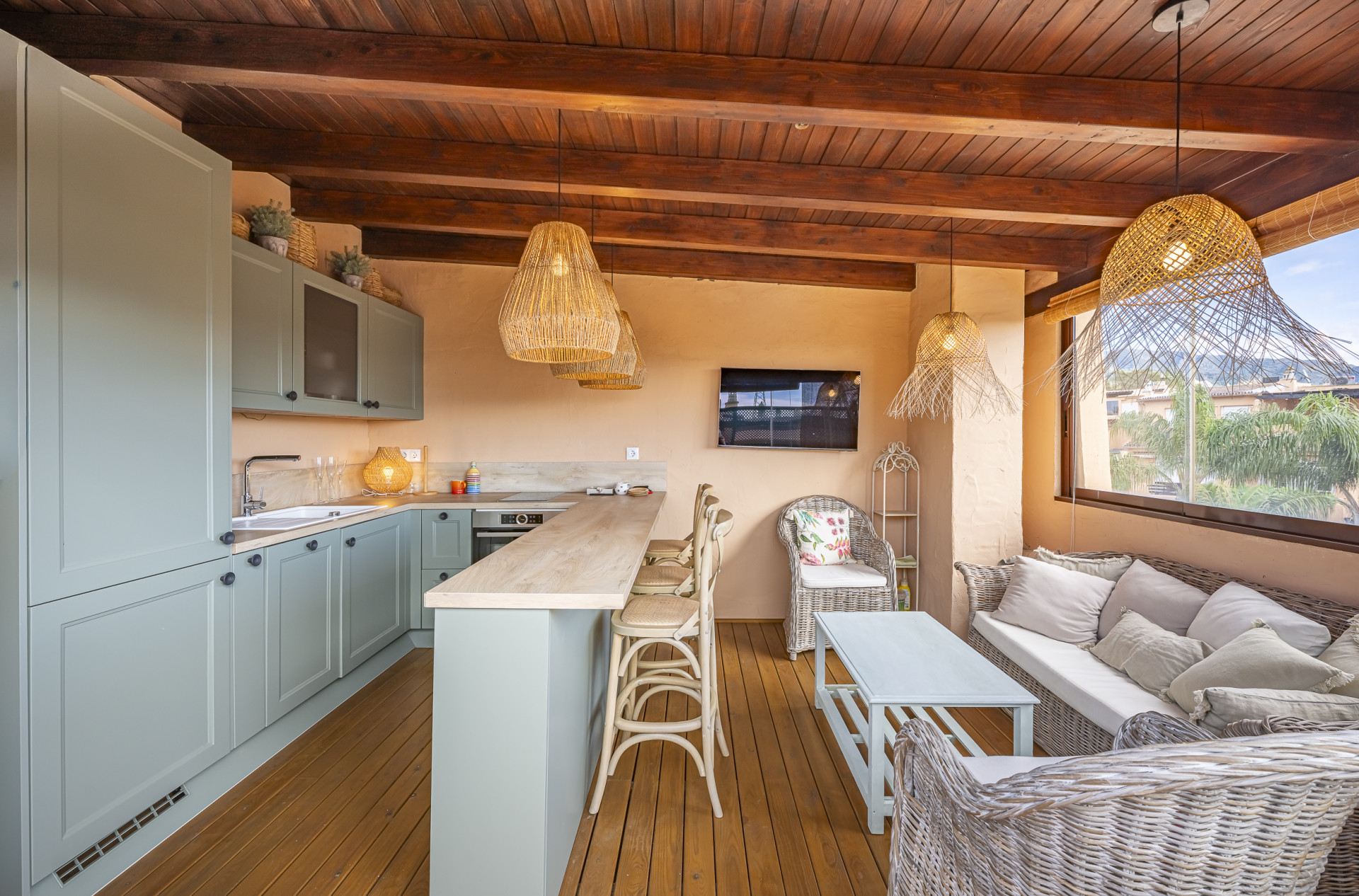 The first floor comprises two elegant en-suite bedrooms with fitted wardrobes. The master suite benefits from its own private terrace, offering peaceful views of the pool and surrounding mountains.