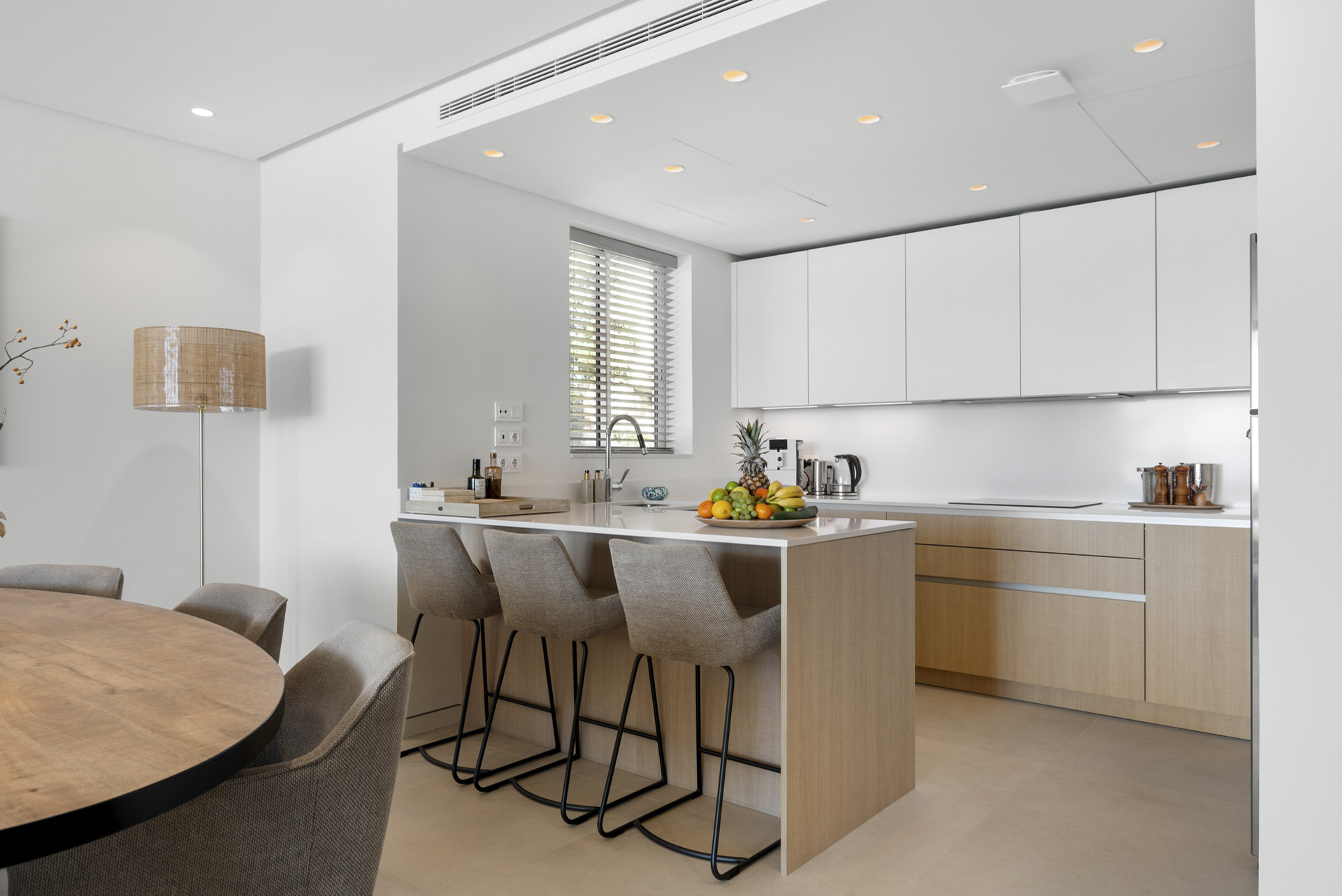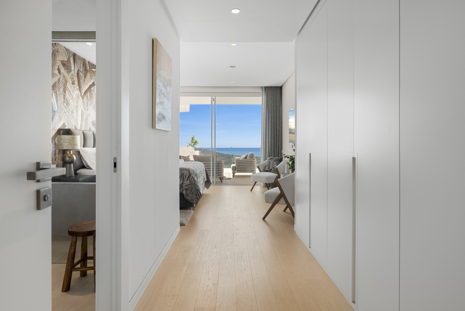 The apartment’s open-plan design amplifies the feeling of space, allowing for a seamless transition from the living area to the dining space, where one can entertain guests or simply indulge in a quiet meal with the mesmerizing vistas of both the sea and the mountainside as a backdrop. The master bedroom, a true haven, offers the rare delight of direct terrace access, allowing its occupants to wake up to the sun-dappled outdoors and bask in the peaceful serenity that only such a setting can provide.