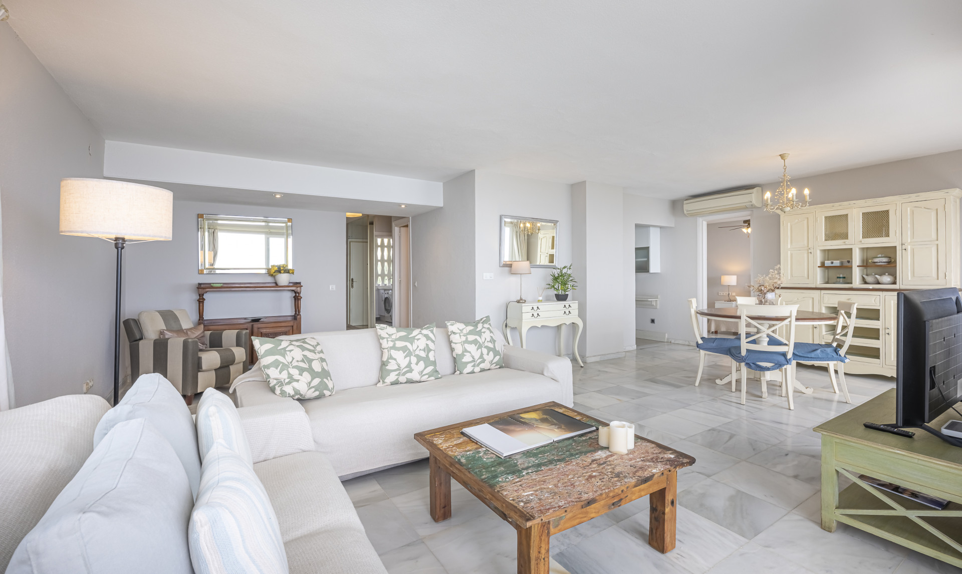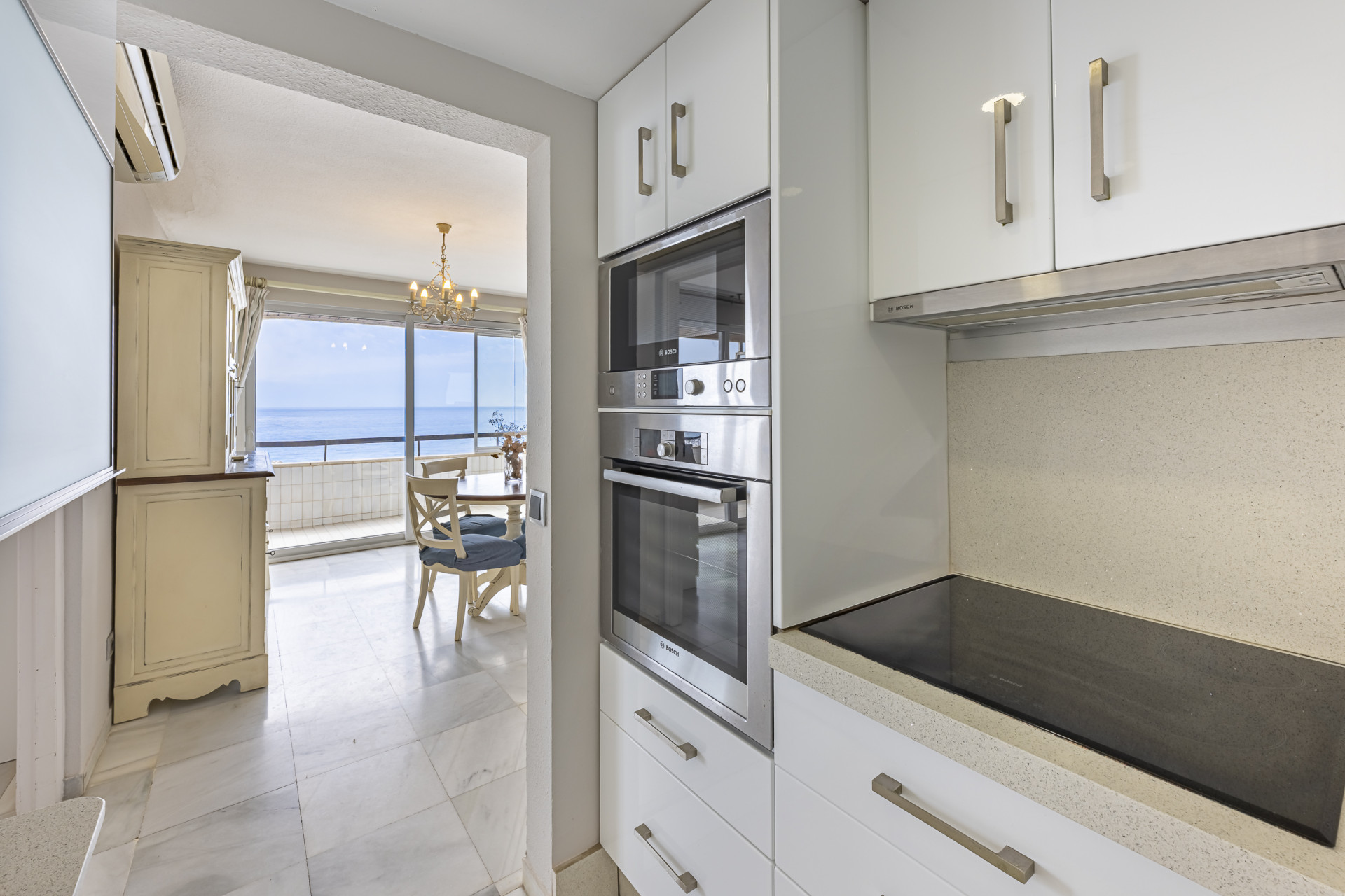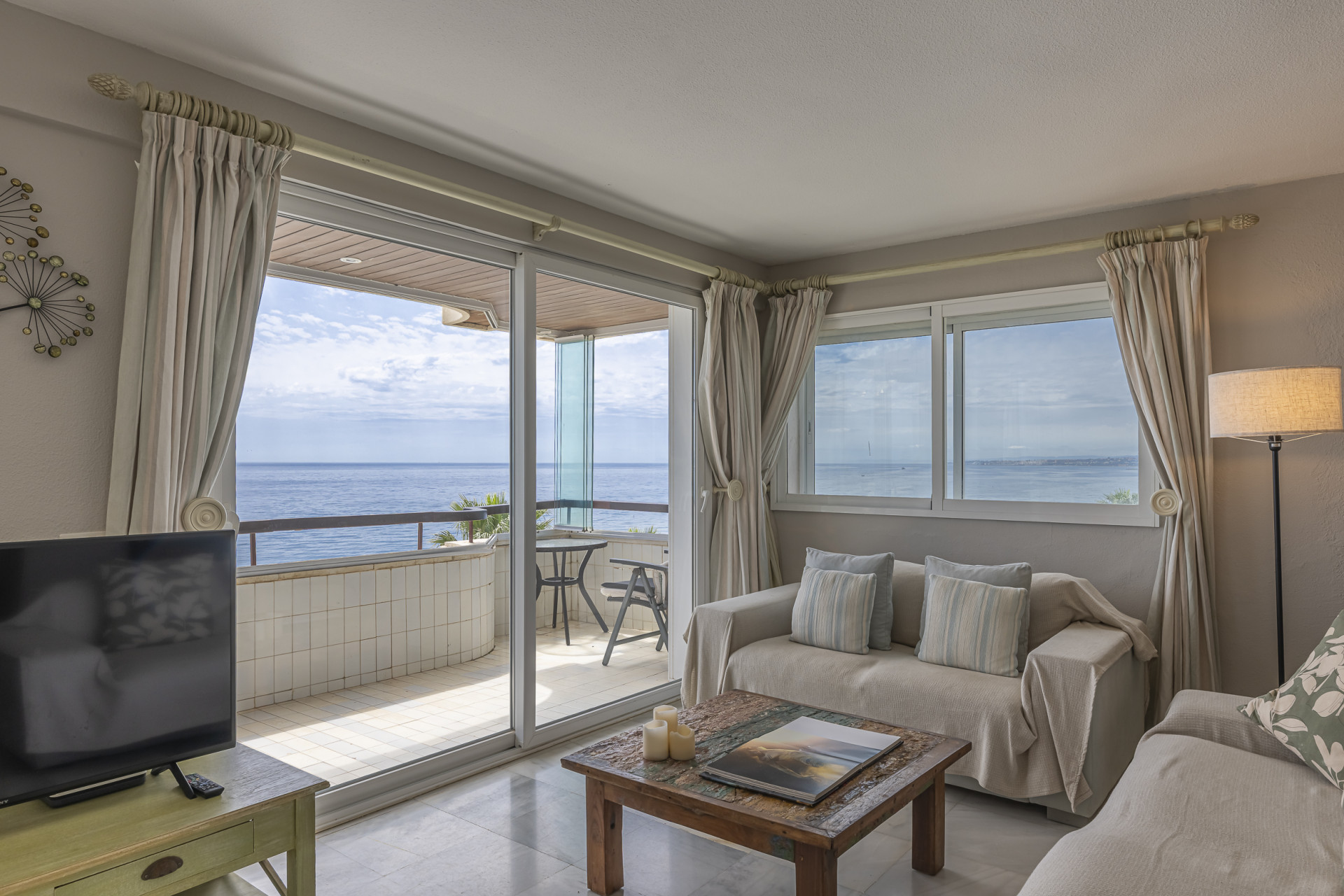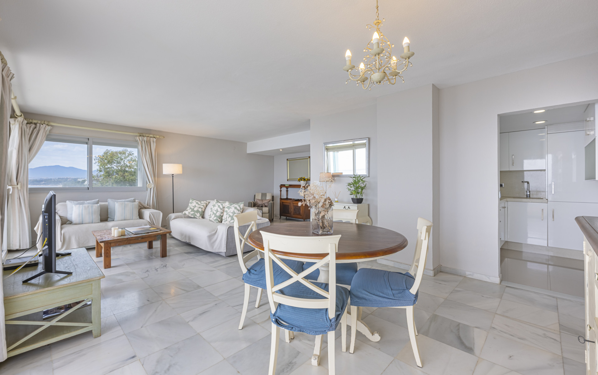 The elegant living-dining area opens onto a sunny private terrace with spectacular panoramic views stretching all the way to the coast of Gibraltar, creating a truly breathtaking visual setting.