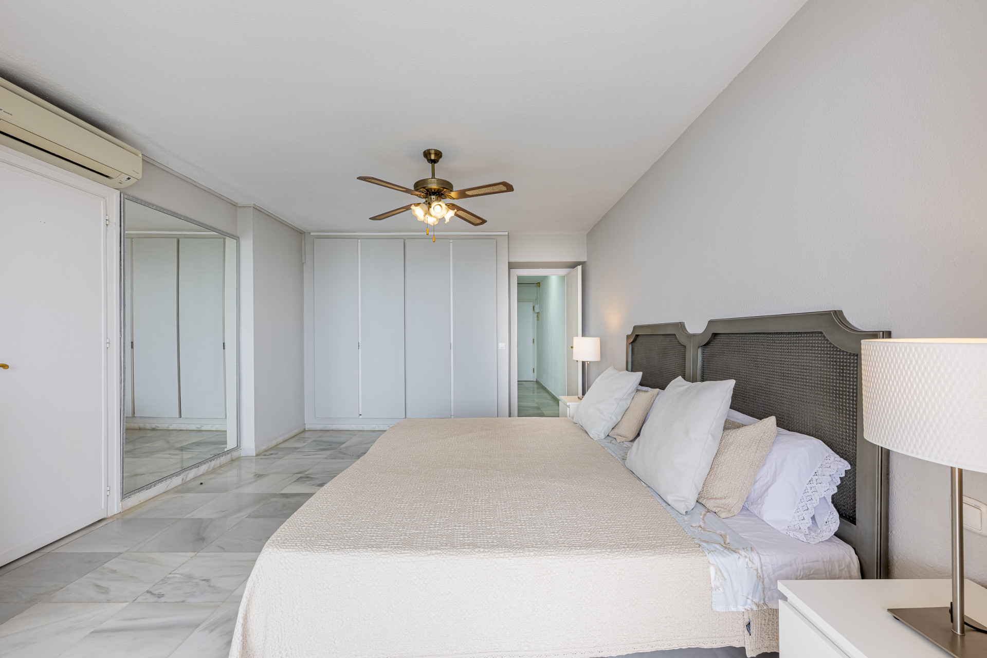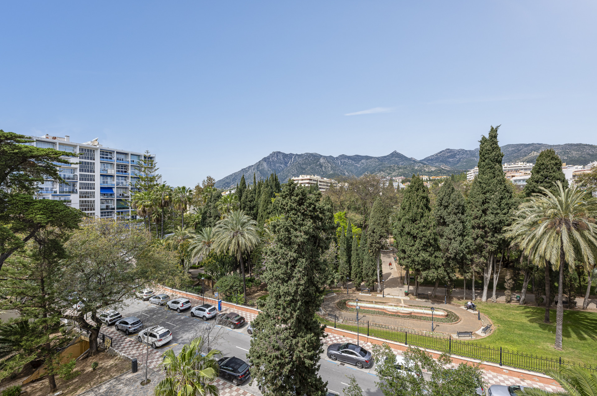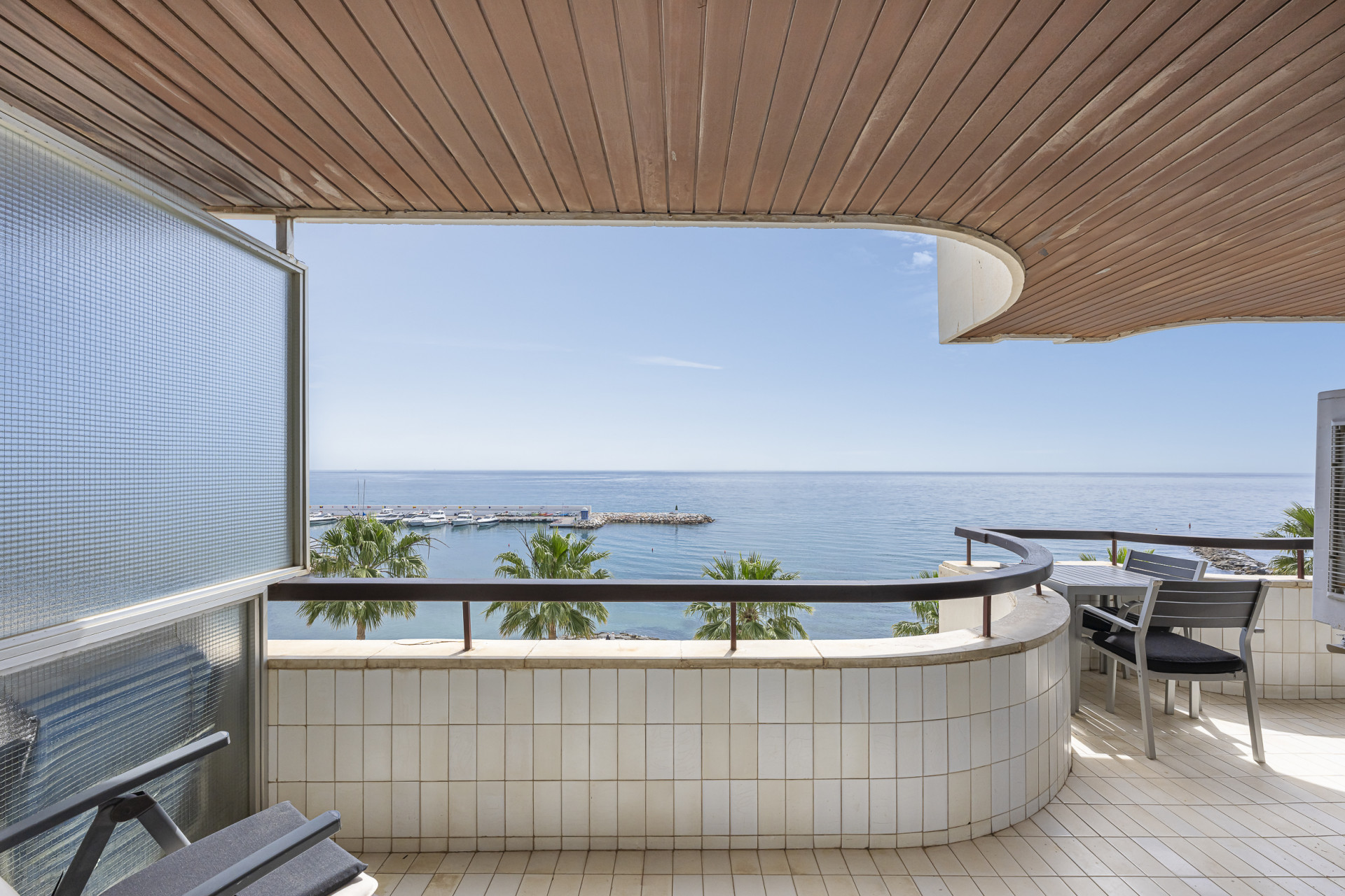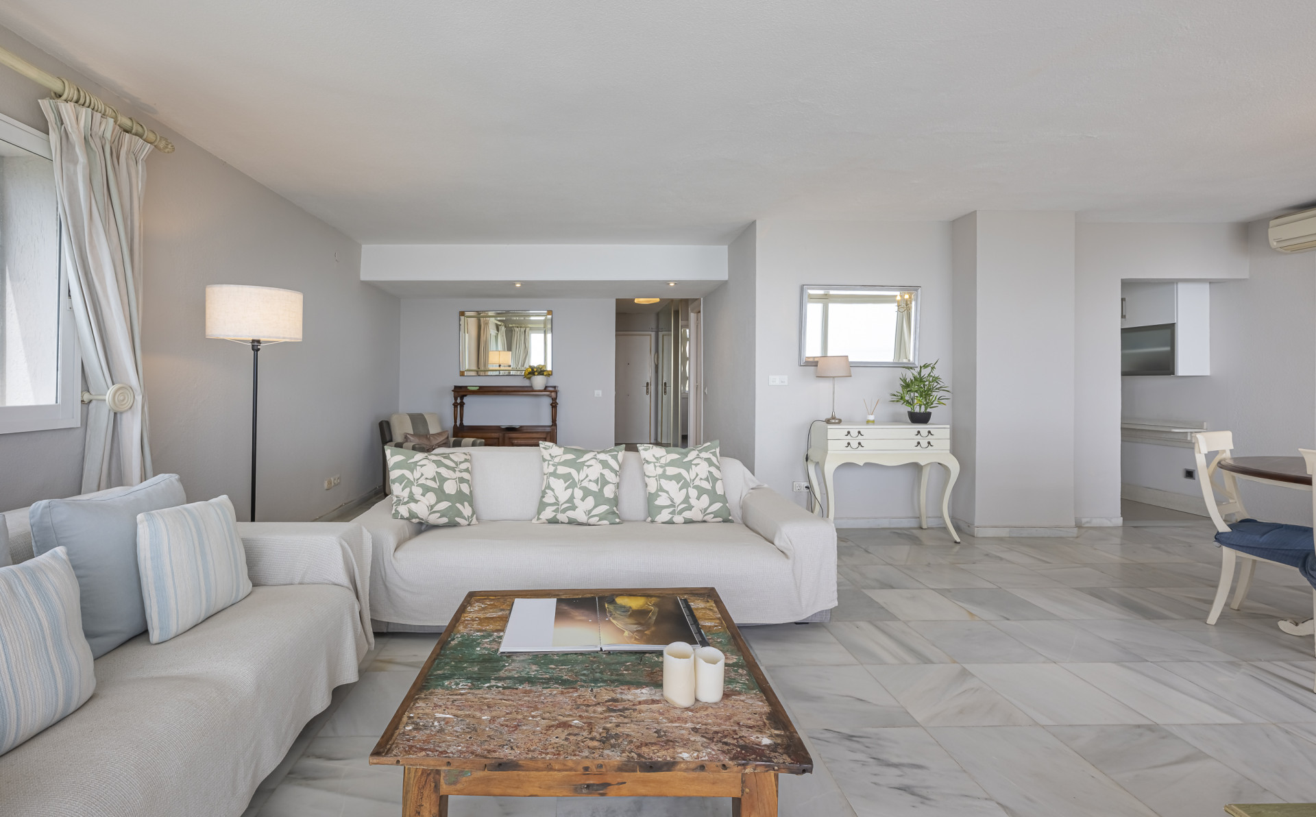 The elegant living-dining area opens onto a sunny private terrace with spectacular panoramic views stretching all the way to the coast of Gibraltar, creating a truly breathtaking visual setting.