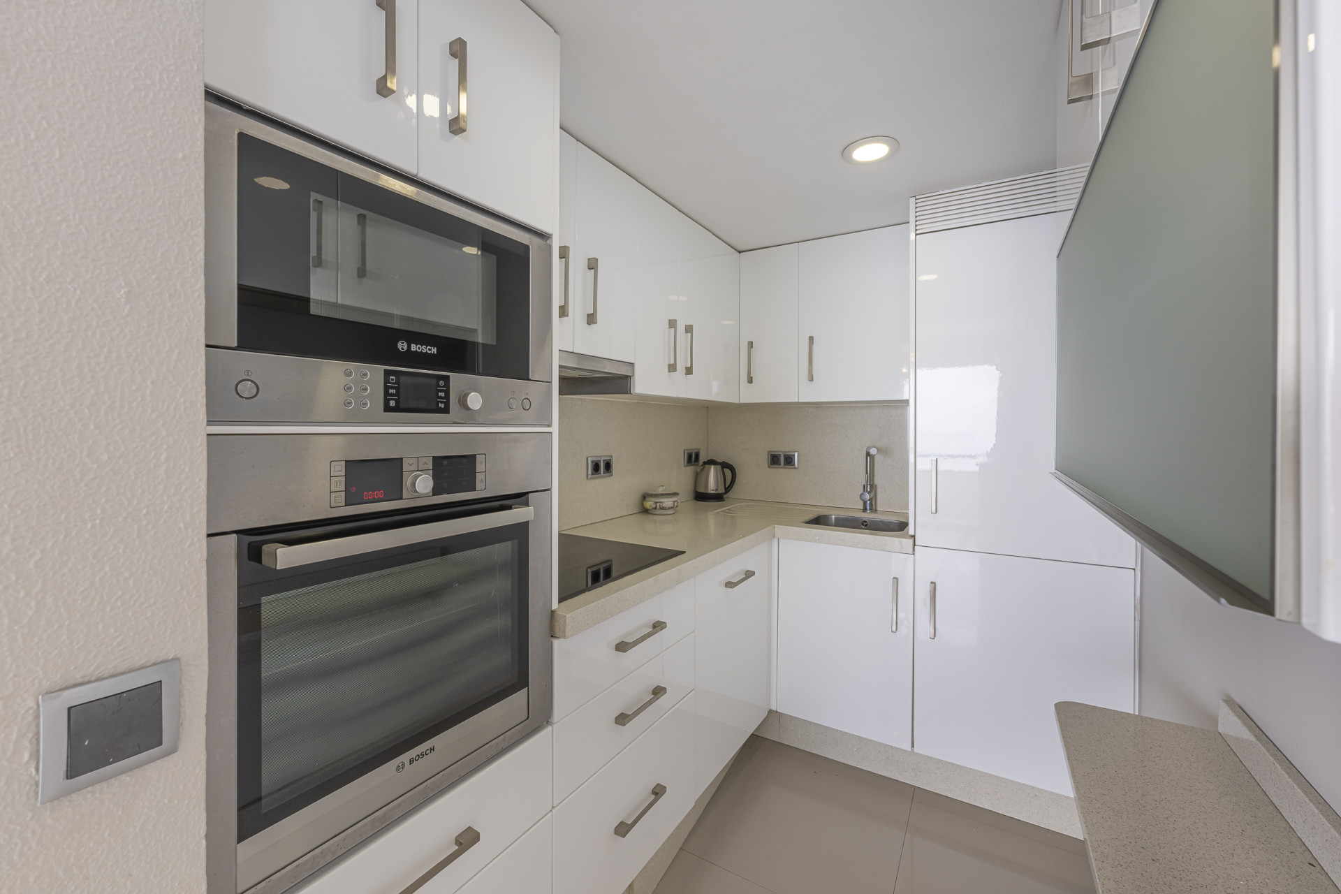 The timelessly designed, fully equipped kitchen blends functionality with refined aesthetics.