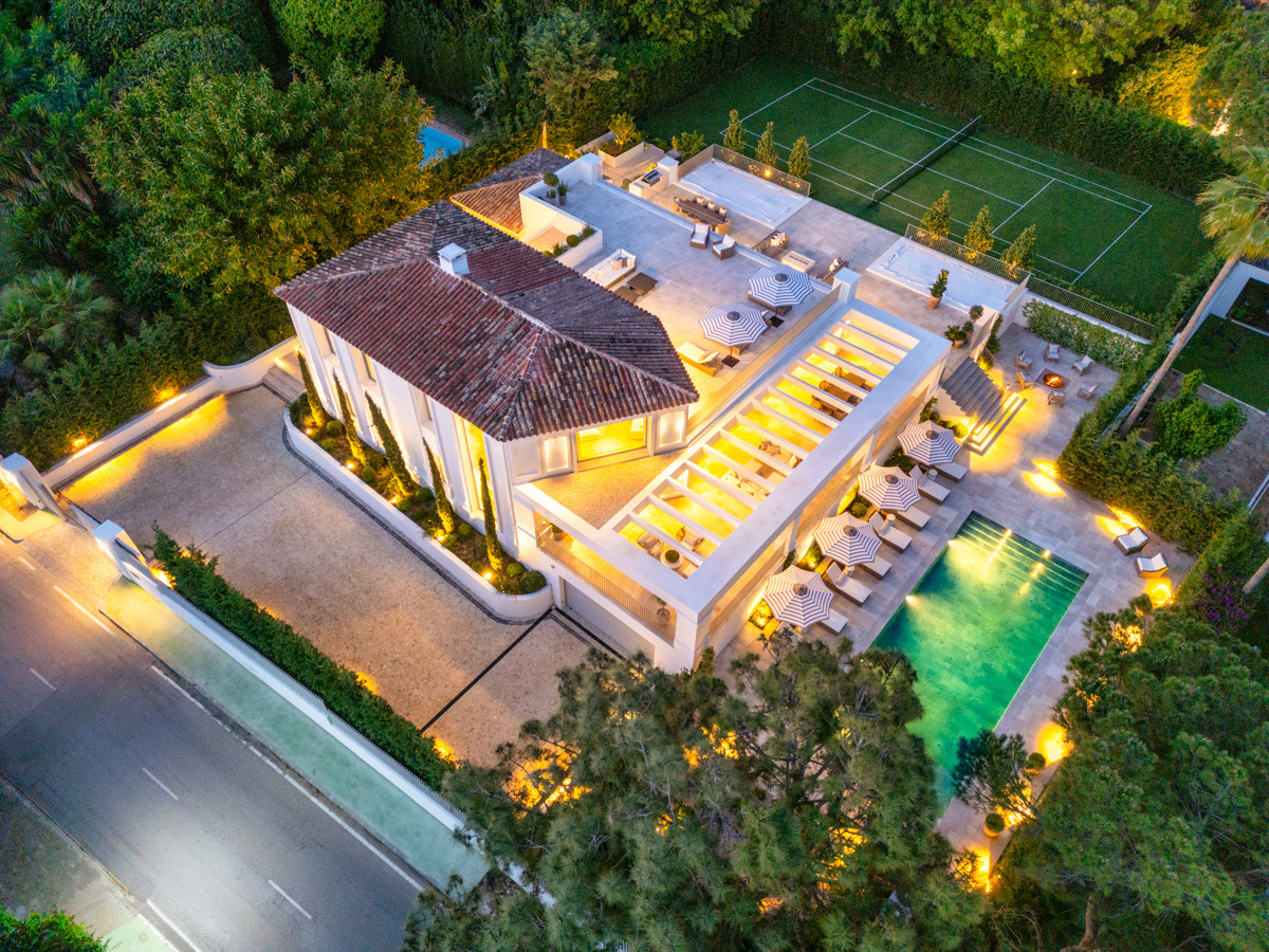 Key exterior features include landscaped gardens, a full-size grass tennis court (a rarity on the Golden Mile), and a generous swimming pool.