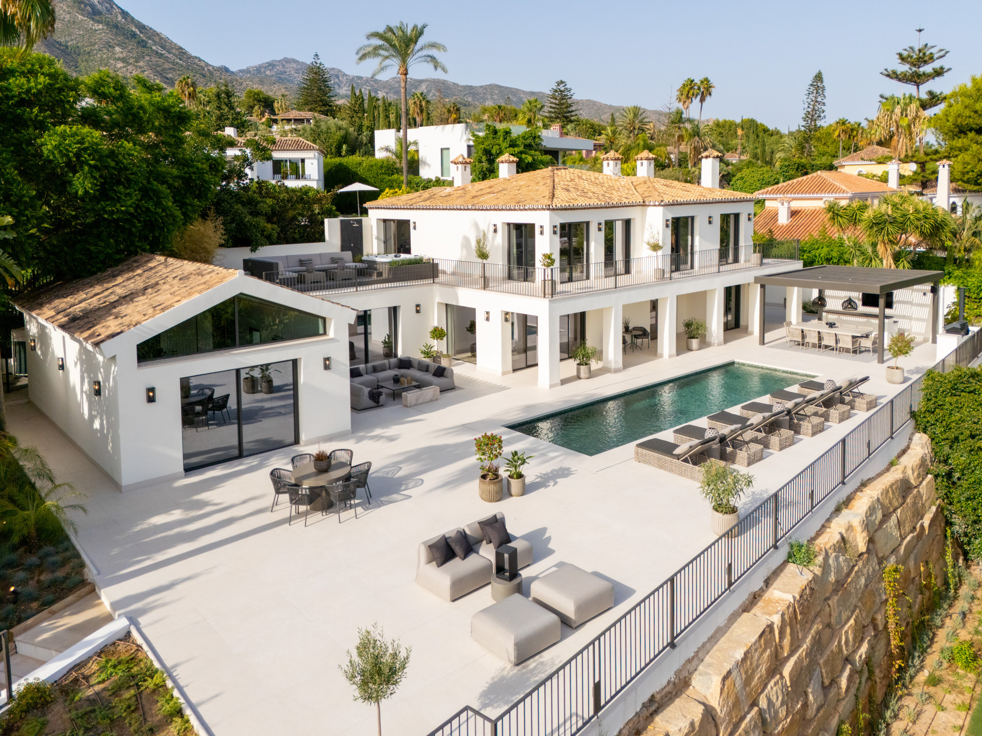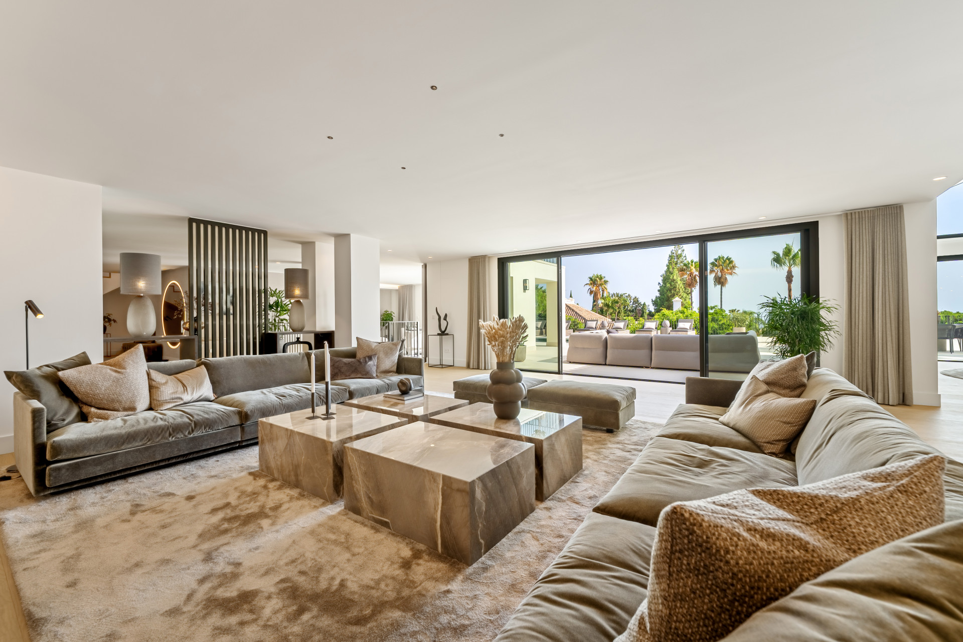 The villa, modernised in 2025, spans 734m² of light-filled living space, with full-height glazing, vaulted ceilings, and seamless transitions between indoor and outdoor living areas.