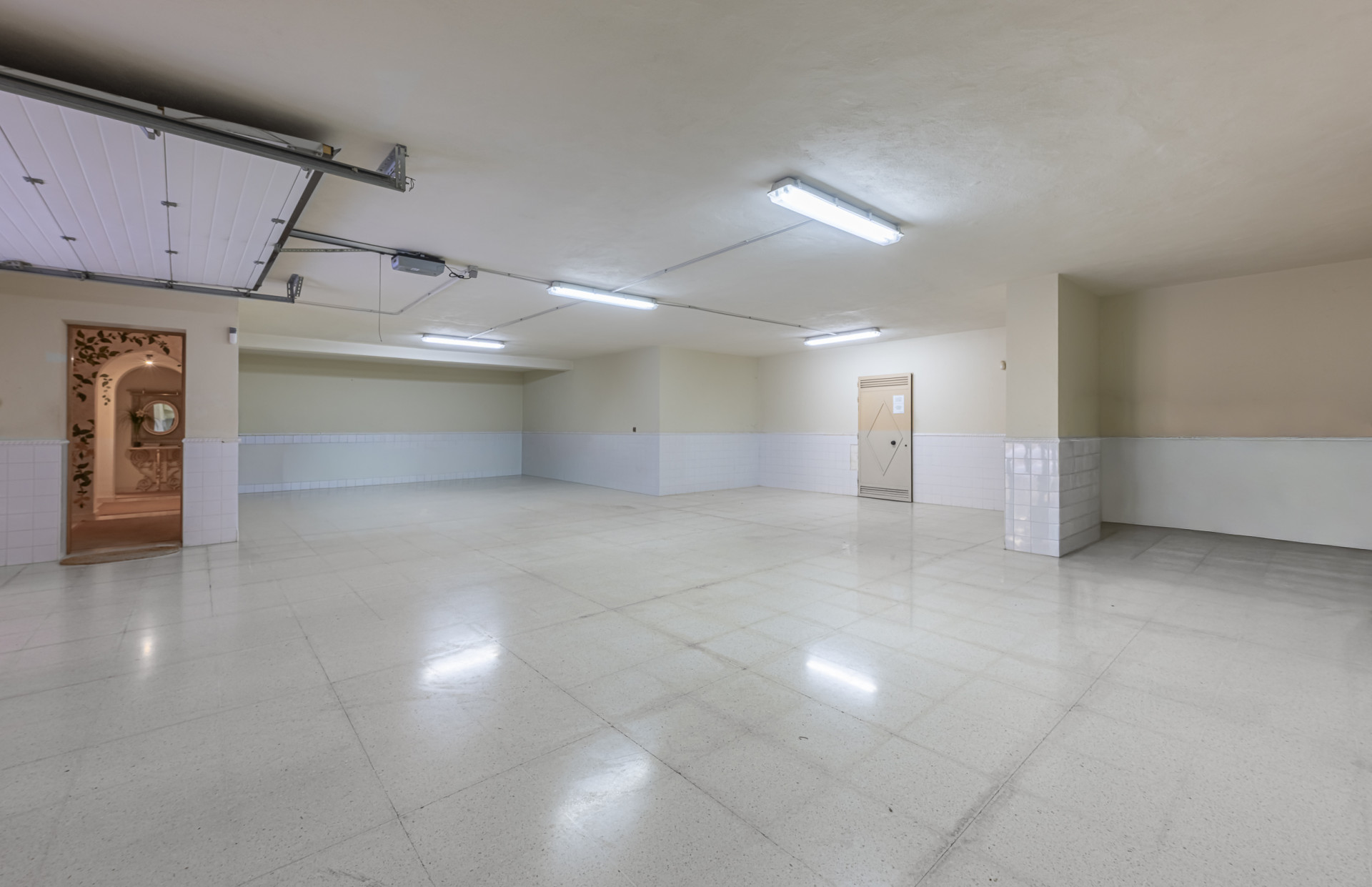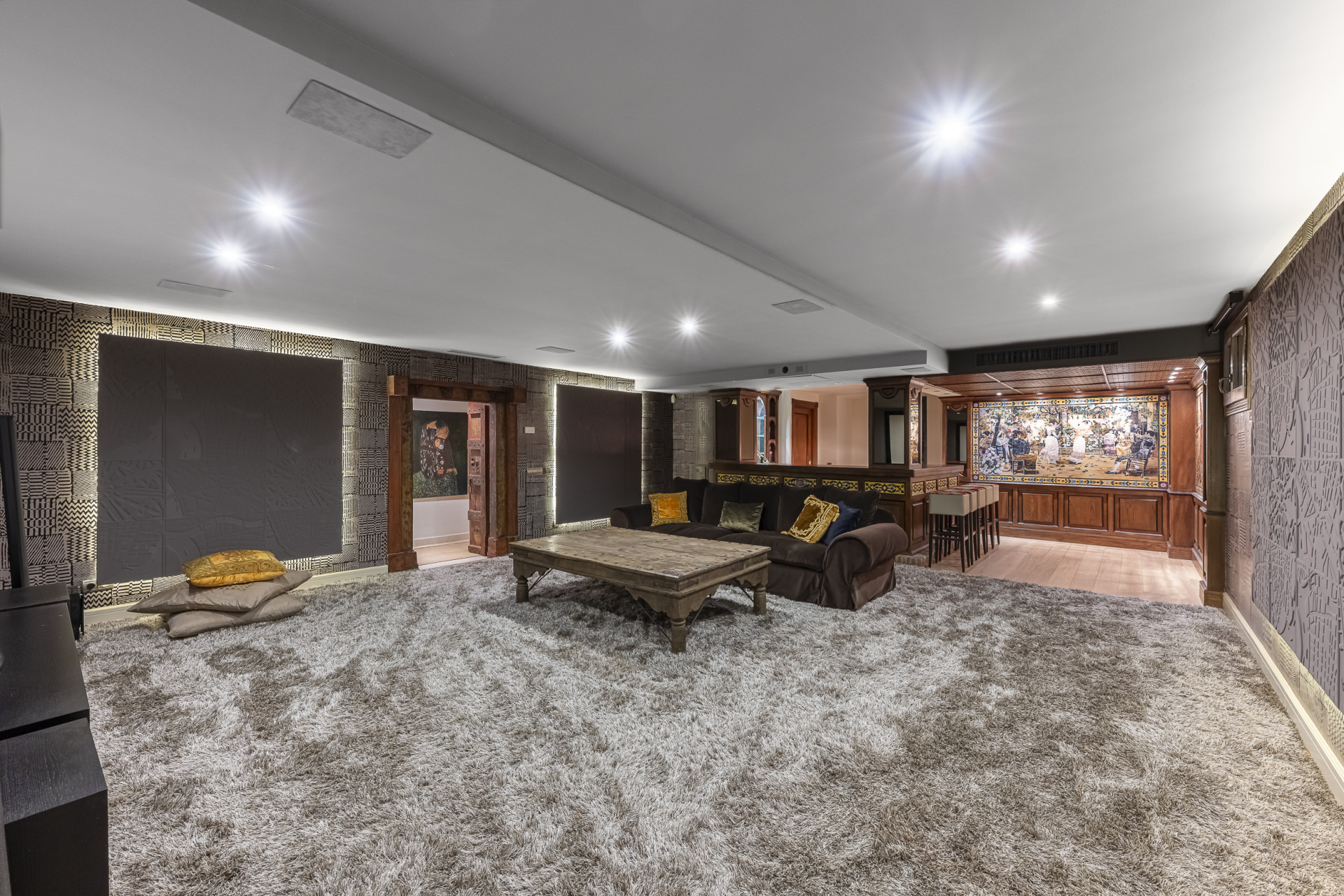 The lower floor houses a cinema room with bar, gym with sauna, a separate apartment for guests or staff, and a garage with space for five vehicles.